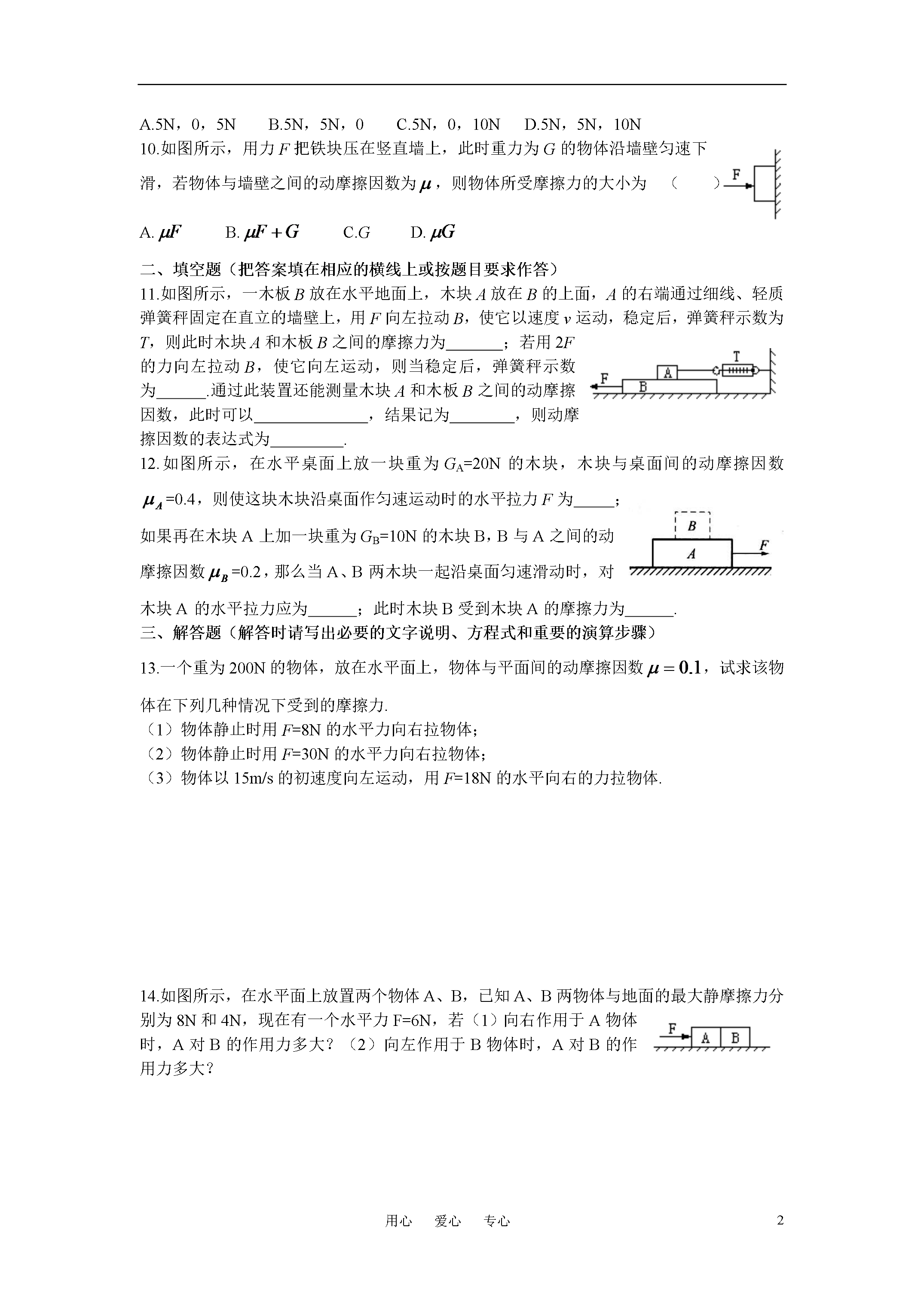 用心爱心专心摩擦力同步练习一、选择题1.以下关于弹力和摩擦力,说法正确的是()A.相互接触的物体之间一定存在着弹力。B.有摩擦力存在的两个物体之间,必然存在着弹力,C.摩擦力的方向一定和物体的运动方向相同。D.滑动摩擦力的方向一定与物体的运动方向相反。2.关于摩擦力与弹力的关系,下列说法正确的是A.有摩擦力一定有弹力B.有弹力一定有摩擦力C.摩擦力大小跟弹力大小一定成正比D.摩擦力方向跟弹力方向可以不垂直3.关于摩擦力,下列说法中正确的是:A.静摩擦力一定发生在两个静止的物体之间。B.静摩擦力总是阻碍物体