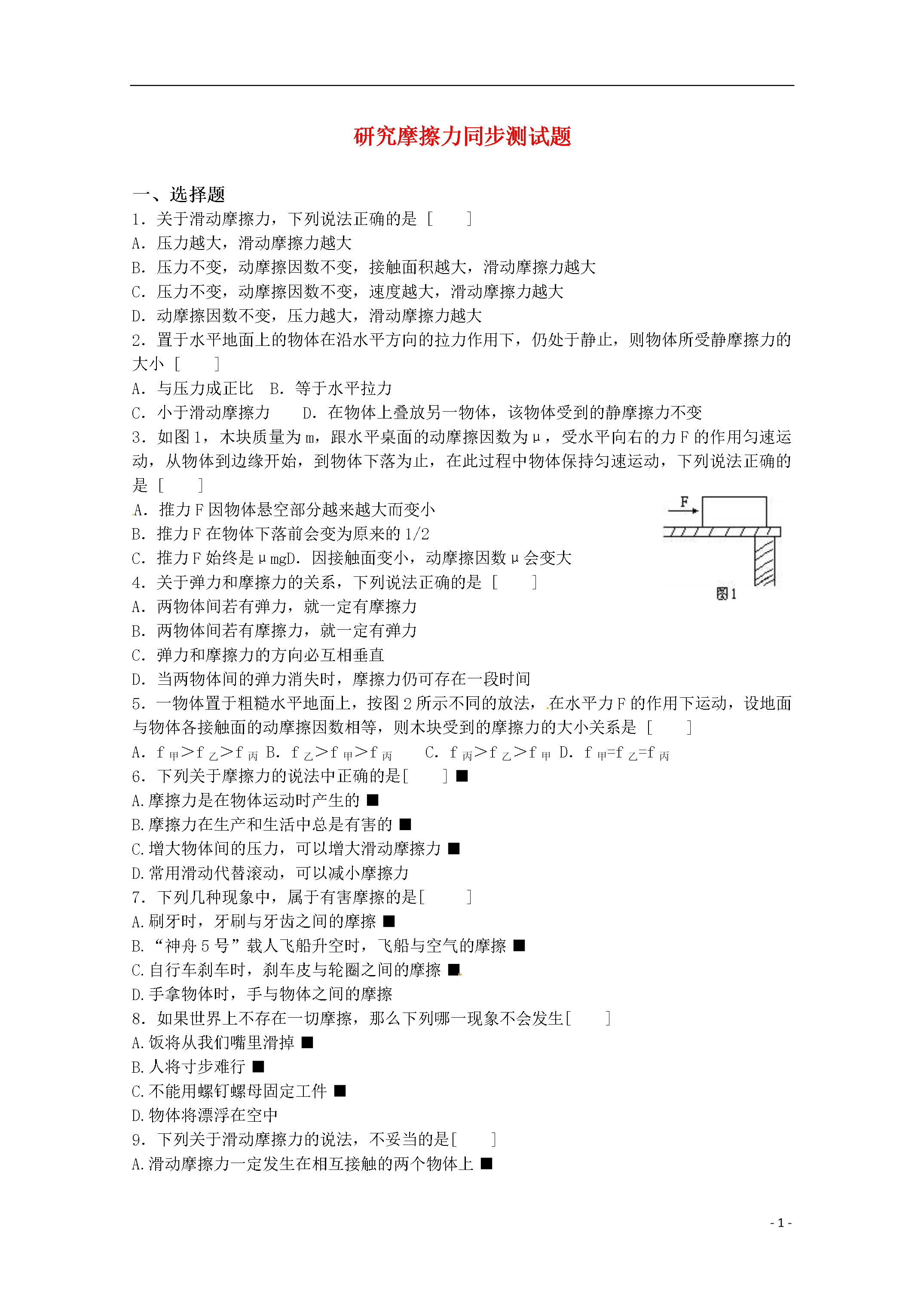 -3-研究摩擦力同步测试题一、选择题1.关于滑动摩擦力,下列说法正确的是[]A.压力越大,滑动摩擦力越大B.压力不变,动摩擦因数不变,接触面积越大,滑动摩擦力越大C.压力不变,动摩擦因数不变,速度越大,滑动摩擦力越大D.动摩擦因数不变,压力越大,滑动摩擦力越大2.置于水平地面上的物体在沿水平方向的拉力作用下,仍处于静止,则物体所受静摩擦力的大小[]A.与压力成正比B.等于水平拉力C.小于滑动摩擦力D.在物体上叠放另一物体,该物体受到的静摩擦力不变3.如图1,木块质量为m,跟水平桌面的动摩擦因数为μ,受水平