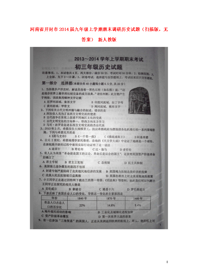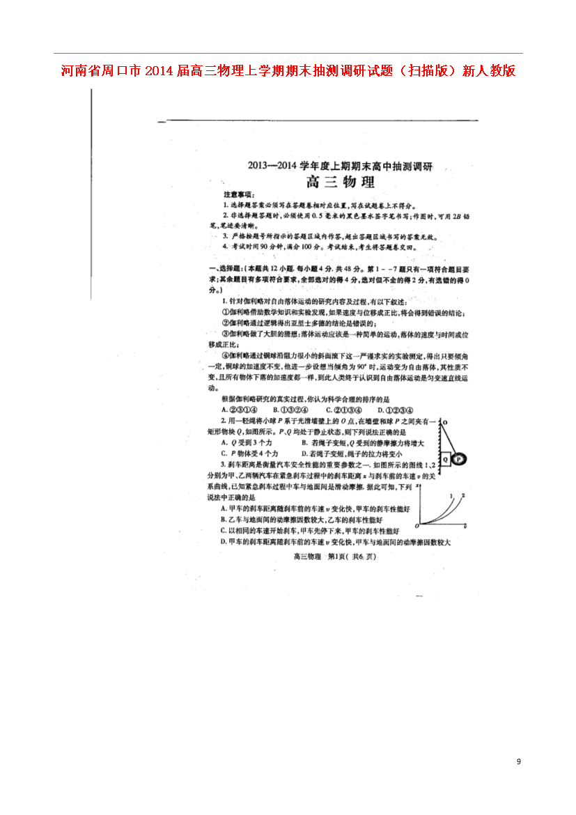 7河南省开封市2014届九年级化学上学期期末调研试题新人教版一、选择题(每小题1分,共12分)1.生活中的下列变化,属于化学变化的是()A.汽油挥发B.粮食酿酒C.滴水成冰D.石墨导电2.下列物质中,属于混合物的是()A.氧气B.高锰酸钾C.澄清石灰水D.冰水混合物3.下列实验操作中,错误的是()4.下列生活中的认识或做法,错误的是()A.减少CO2的排放有助于控制“温室效应”B.室内起火,不要急于打开所有门窗C.氮气可做保护气D.霉变的食品只要煮熟就可以食用5.水是生命之源,下列关于水的说法正确的是()A.水是由氢气和氧气组成的B.水是最常见的溶剂C.煮沸和蒸馏都能让自来水变成纯净水D.纯净水比矿泉水的营养价值高6.生活中常见到“含铁酱油”、“高钙牛奶”、“富硒茶叶”等,这里的铁、钙、硒指的是()A.元素B.原子C.离子D.分子7.如图是甲、乙两种固体的溶解度曲线,下列说法正确的是()A.甲的溶解度等于乙的溶解度B.升高温度可将甲的不饱和溶液变为饱和溶液C.20℃时,100g乙的饱和溶液中溶质质量是30gD.40℃时,分别用100g水配制甲、乙的饱和溶液,所需甲的质量大于乙的质量8.先将二氧化碳气体通入试管里的紫色石蕊溶液中,然后再加热,溶液颜色变化情况是()A.先变红后变蓝B.先变红后变紫C.不变色D.变红后不再变色9.已知4.4g某纯净完全燃烧生成13.2g二氧化碳和7.2g水,有关该物质判断正确的是()A.一定含有碳、氢元素,可能含有氧元素B.一定含有碳、氢、氧三种元素C.含碳元素的质量分数为42%D.分子中碳、氢原子个数比为3:810.下列有关粒子结构示意图得出的结论中,正确的是()A.①②属于相对稳定结构B.②③属于同种元素C.③④⑤属于同种离子D.①容易与④形成化合物11.下列有关“不一定”的叙述错误的是()A.元素组成相同的物质不一定是同种物质B.相对分子质量相同的物质不一定是同种物质C.同种物质的制取方法不一定相同D.同种分子构成的物质化学性质不一定相同12.下列图象分别与选项中的操作相对应,其中可能合理的是()二、填空题:(每空1分,共16分)13.请从甲烷、氧气、氮气、一氧化碳和干冰中选择恰当的物质,用其化学式填空:(1)吸烟过程中产生的有毒气体是_________;(2)天然气的主要成分_________;(3)空气中含量最多的气体是_________;(4)可用于人工降雨的是_________.14.开封被誉为“北方水城”,为了探究开封水环境,同学们从湖中取水样进行实验探究:(1)观察到水样呈浅黄色,并有异味,可加入_________除去水样中的颜色和异味.(2)为了判断水样是硬水或软水,可加入_________进行检验.(3)氯气可用于水样的杀菌消毒,其在水中可发生如下反应:Cl2+H2O═HCl+X,则X的化学式为_________.15.吸入“笑气”会使人发笑,该气体是由氮、氧两种元素组成的化合物,式量(相对分子质量)为44,氮、氧元素的质量比为7:4,则它的化学式(分子式)为_________.16.野炊生火时,若将枯柴架空燃烧旺,紧密堆放燃烧不旺,甚至会熄灭,说明燃烧需要_________,枯柴燃烧时将_________转变为热能,将食物煮熟,野炊结束时常用水将燃着的枯柴浇灭,其灭火原理为_________.17.氧化还原反应是重要的化学反应,在氧化还原反应中一定有元素的化合价发生变化,反应前高价态元素的物质,在反应后元素的化合价降低,具有氧化性,反之则具有还原性.已知:氯化铁溶液能和单质铜反应生成氯化铜和另一种铁的氯化物.该反应的化学方程式可表示为_________;该反应中,_________元素的化合价发生了变化,反应物中表现出还原性的物质是_________.18.甲、乙、丙、丁是初中化学常见的化合物,已知:乙、丙均为氧化物,丙与另一种氧化物反应生成丁,丁能用来检验二氧化碳.他们之间有如图所示的转化关系(部分物质和反应条件已略去).则甲的名称为_________;乙与丁反应的化学方程式为_________.三、简答题:19.(2分)“航天梦”是实现“中国梦”的具体体现,2013年12月14日“嫦娥三号”在月球成功登陆,对月球进行探测.“嫦娥三号”使用“长三乙”运载火箭发射,“常三乙”的第三级火箭使用液氢燃料.如表是某种制备氢气的反应,已知A与B在高温和有催化剂的条件下反应,生成C和D.物质ABCD﹣﹣氢原子﹣﹣氧原子﹣﹣碳原子微观示意图(1)D物质中元素的化合价为_________.(2)写出反应的化学方程式_________.20.(4分)请用所学化学知识解释下列事实:(1)洗涤剂能除去油污,是因为它具有_________功能.(2)金秋时节,古城开封处处都能闻到怡人的菊花香气.(