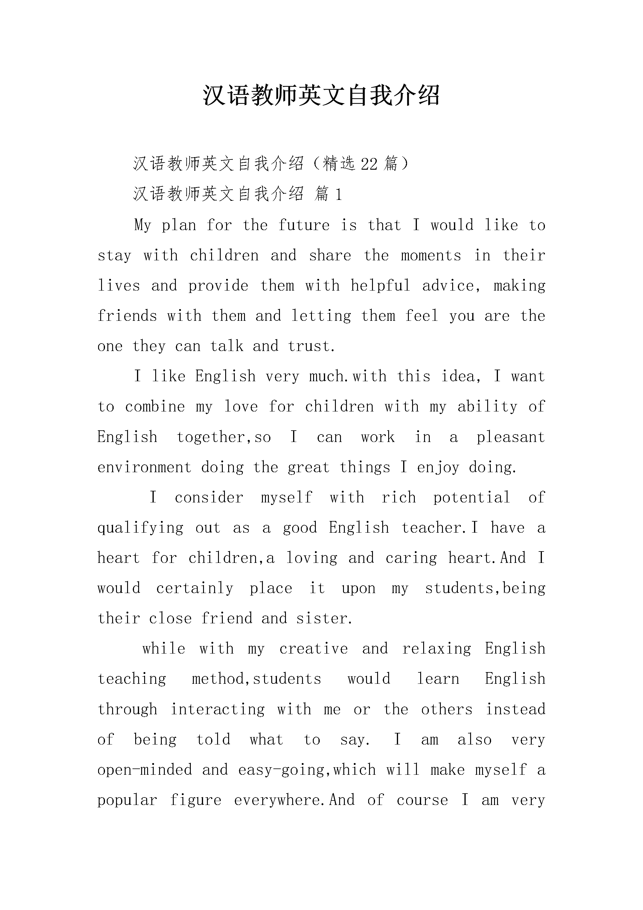 此资料由网络收集而来,如有侵权请告知上传者立即删除。资料共分享,我们负责传递知识。对外汉语教师英文自我介绍老师是园丁,无时无刻都在孕育祖国的花朵,老师是蜡烛,燃烧自己点亮我们前行的方向,没有您的付出,就没有我们今天的成就,真诚的说声教师节快乐!接下来是小编为您整理的对外汉语教师英文自我介绍,希望对您有所帮助。对外汉语教师英文自我介绍MynameisXXX,IbornonAugust20,Iamtwenty-fiveyearsold.MyhometownisBeijing,thecapitalofChina