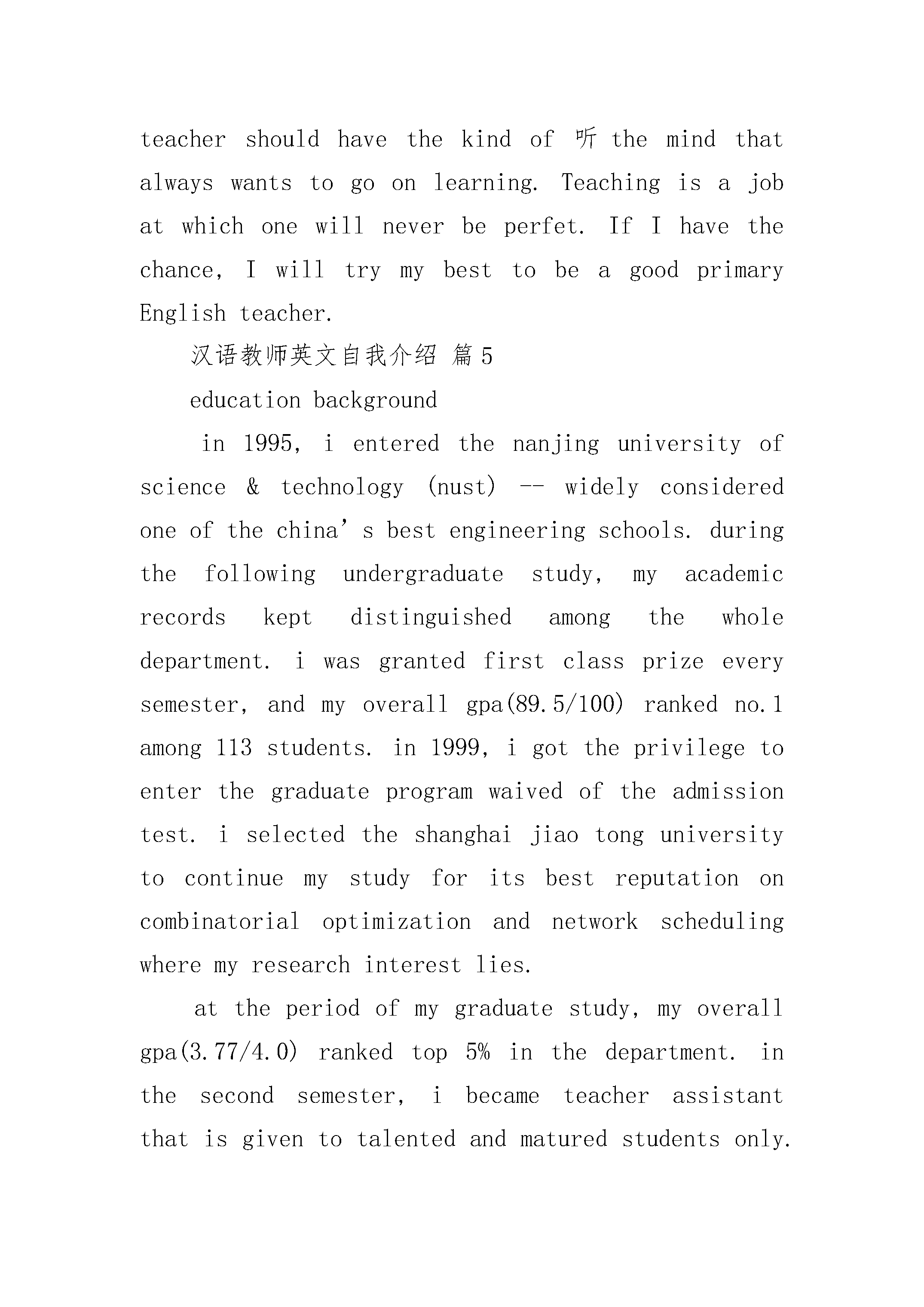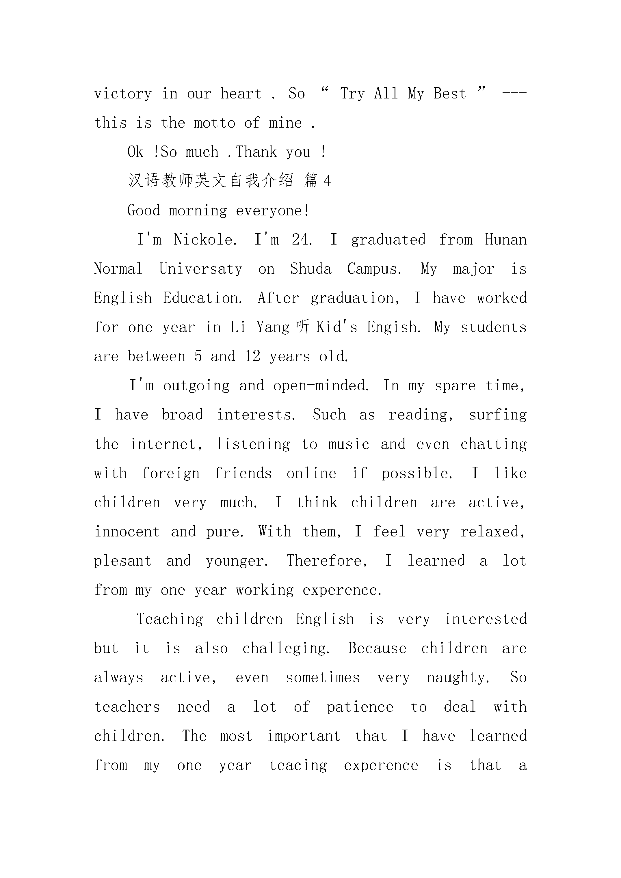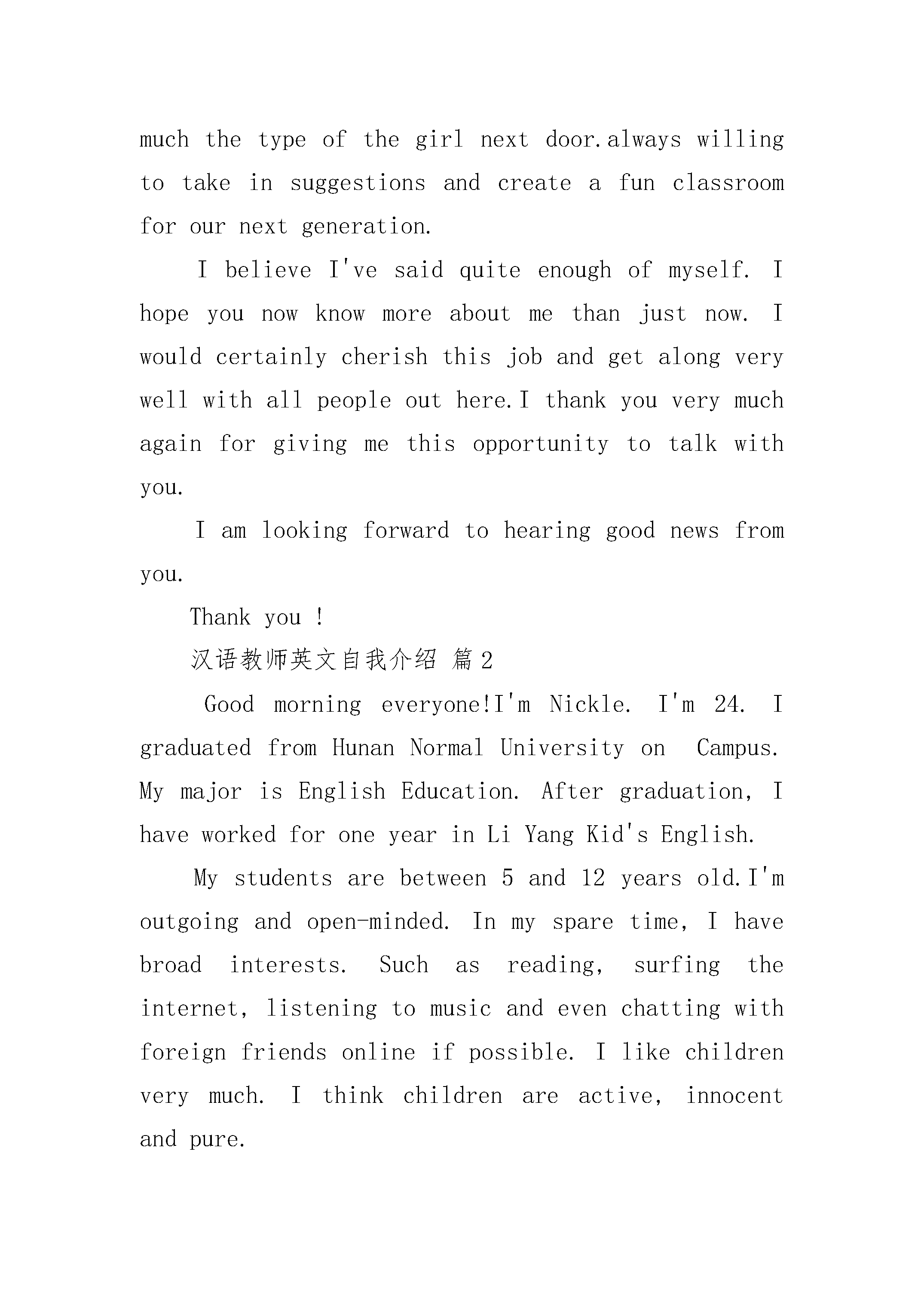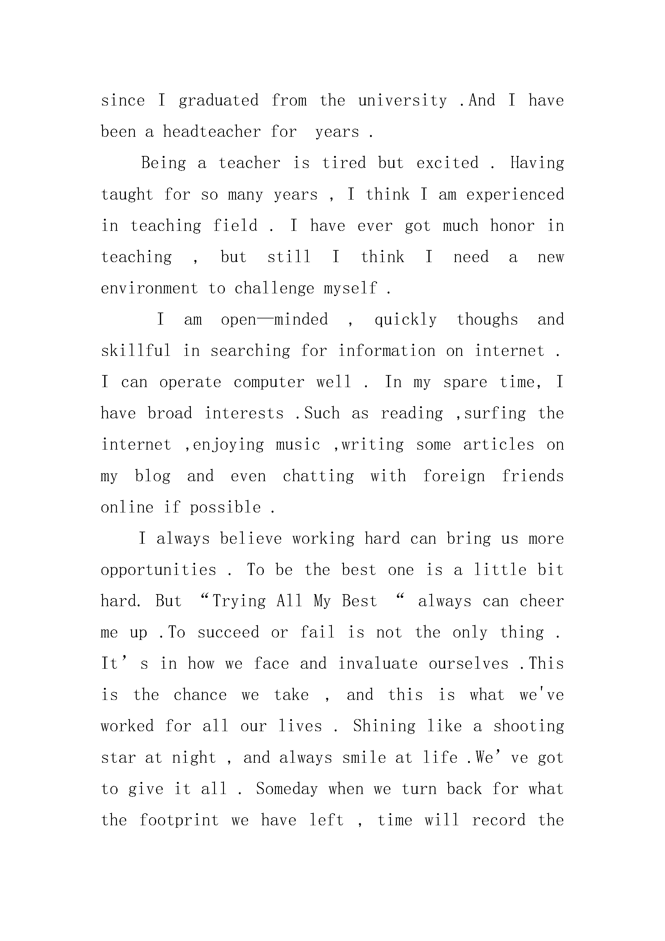 此资料由网络收集而来如有侵权请告知上传者立即删除。资料共分享我们负责传递知识。对外汉语教师英文自我介绍老师是园丁无时无刻都在孕育祖国的花朵老师是蜡烛燃烧自己点亮我们前行的方向没有您的付出就没有我们今天的成就真诚的说声教师节快乐!接下来是小编为您整理的对外汉语教师英文自我介绍希望对您有所帮助。对外汉语教师英文自我介绍MynameisXXXIbornonAugust20Iamtwenty-fiveyearsold.MyhometownisBeijingtheca