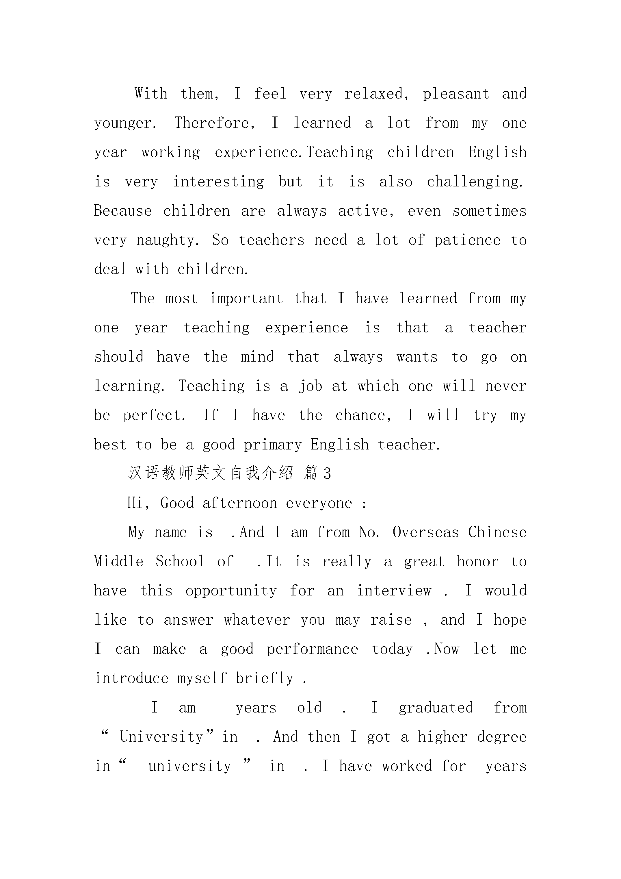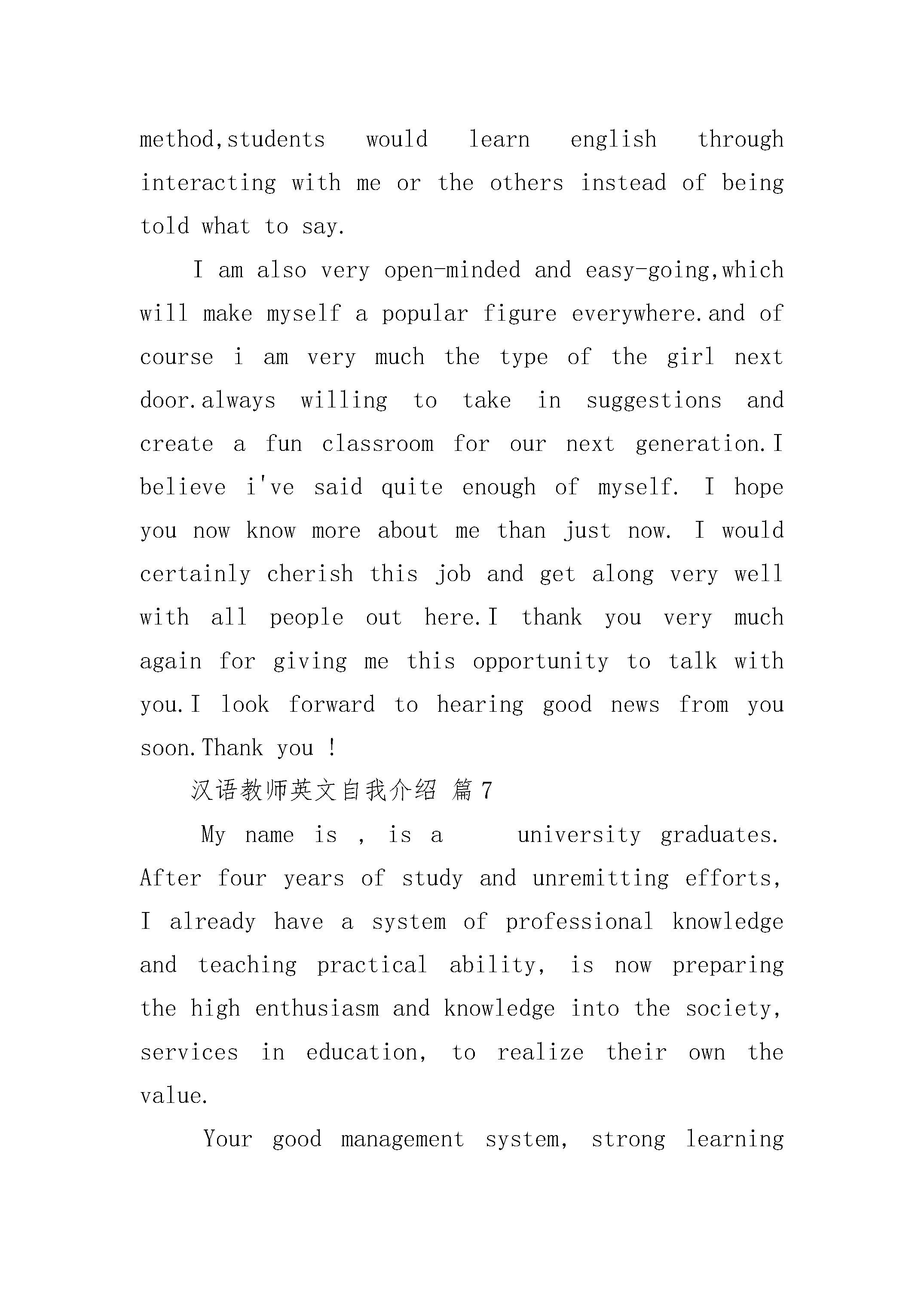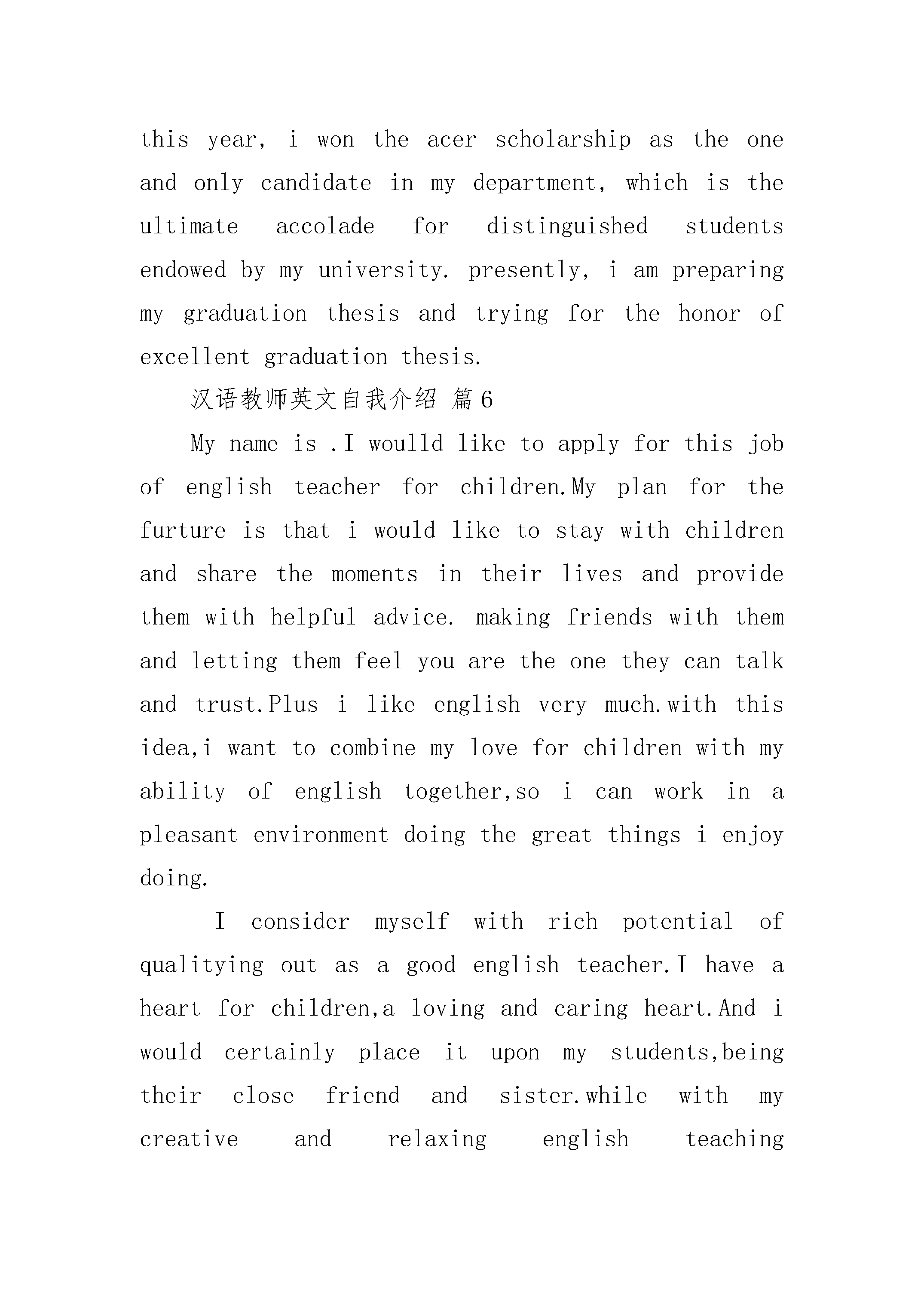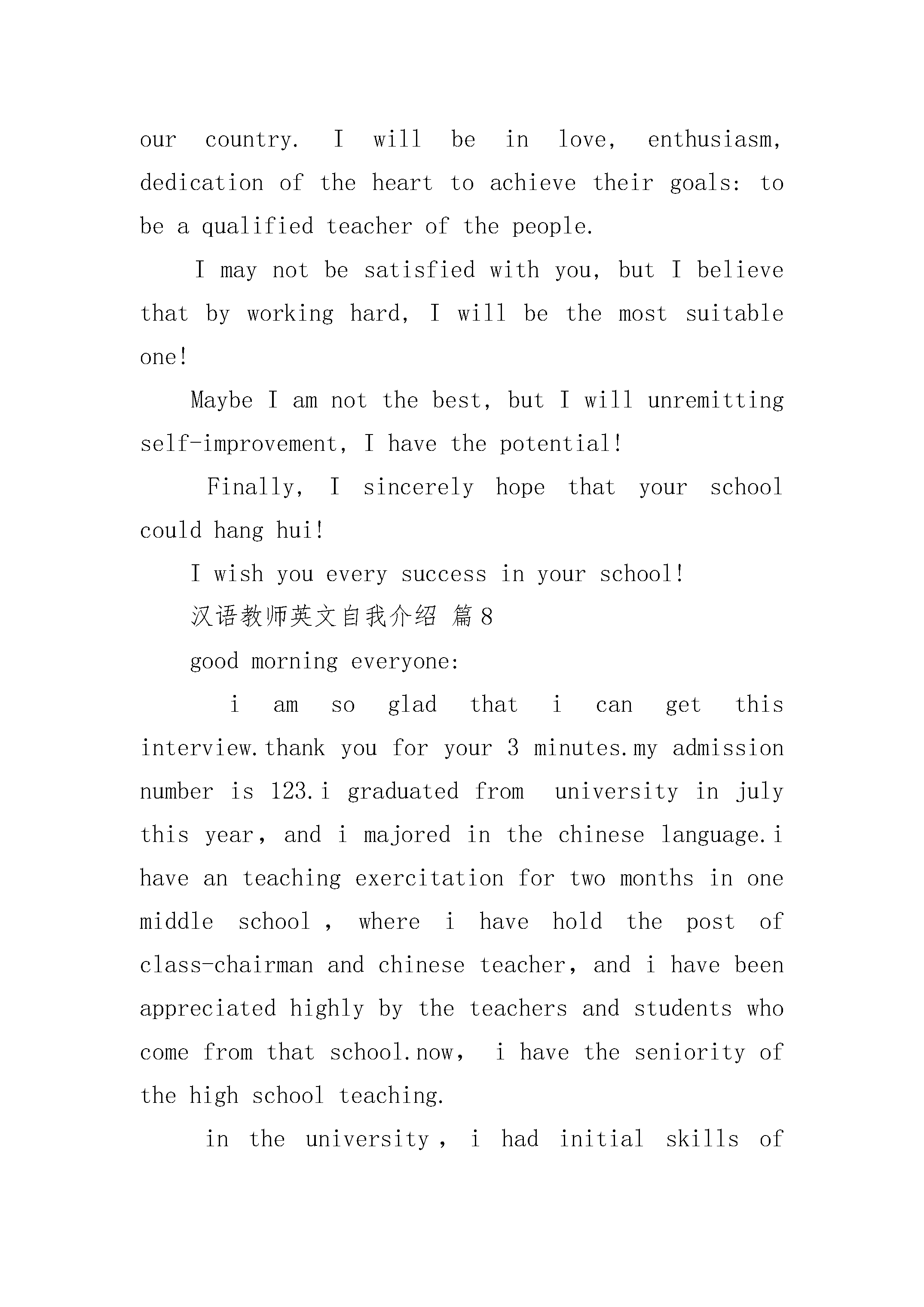 此资料由网络收集而来如有侵权请告知上传者立即删除。资料共分享我们负责传递知识。对外汉语教师英文自我介绍老师是园丁无时无刻都在孕育祖国的花朵老师是蜡烛燃烧自己点亮我们前行的方向没有您的付出就没有我们今天的成就真诚的说声教师节快乐!接下来是小编为您整理的对外汉语教师英文自我介绍希望对您有所帮助。对外汉语教师英文自我介绍MynameisXXXIbornonAugust20Iamtwenty-fiveyearsold.MyhometownisBeijingtheca