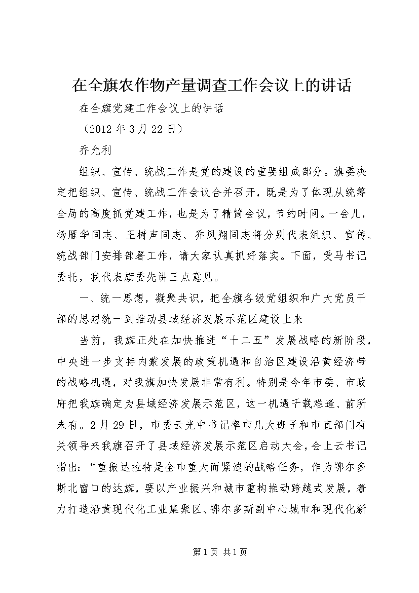 在全旗农作物产量调查工作会议上的讲话在全旗党建工作会议上的讲话(2012年3月22日)乔允利组织、宣传、统战工作是党的建设的重要组成部分。旗委决定把组织、宣传、统战工作会议合并召开,既是为了体现从统筹全局的高度抓党建工作,也是为了精简会议,节约时间。一会儿,杨雁华同志、王树声同志、乔凤翔同志将分别代表组织、宣传、统战部门安排部署工作,请大家认真抓好落实。下面,受马书记委托,我代表旗委先讲三点意见。一、统一思想,凝聚共识,把全旗各级党组织和广大党员干部的思想统一到推动县域经济发展示