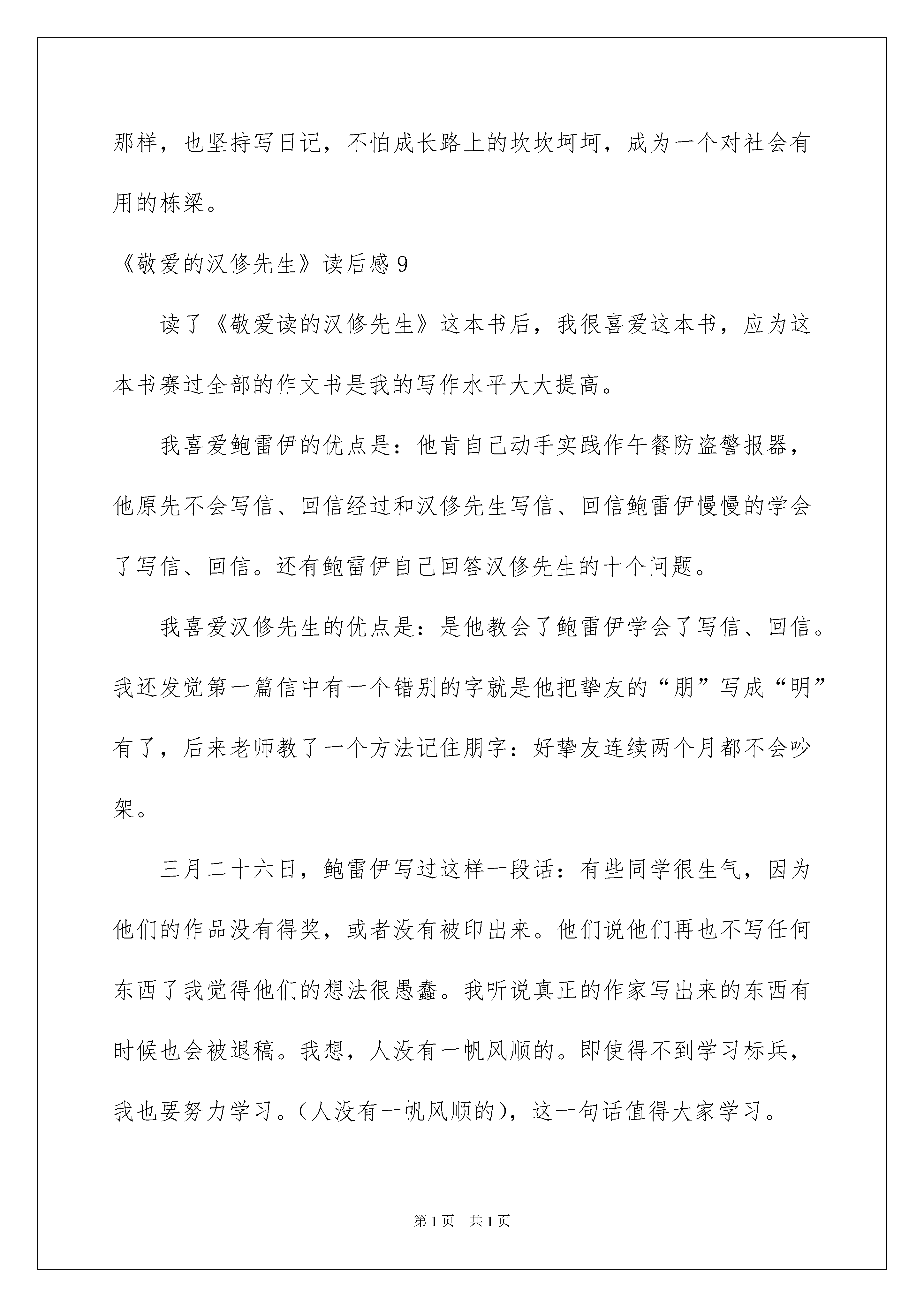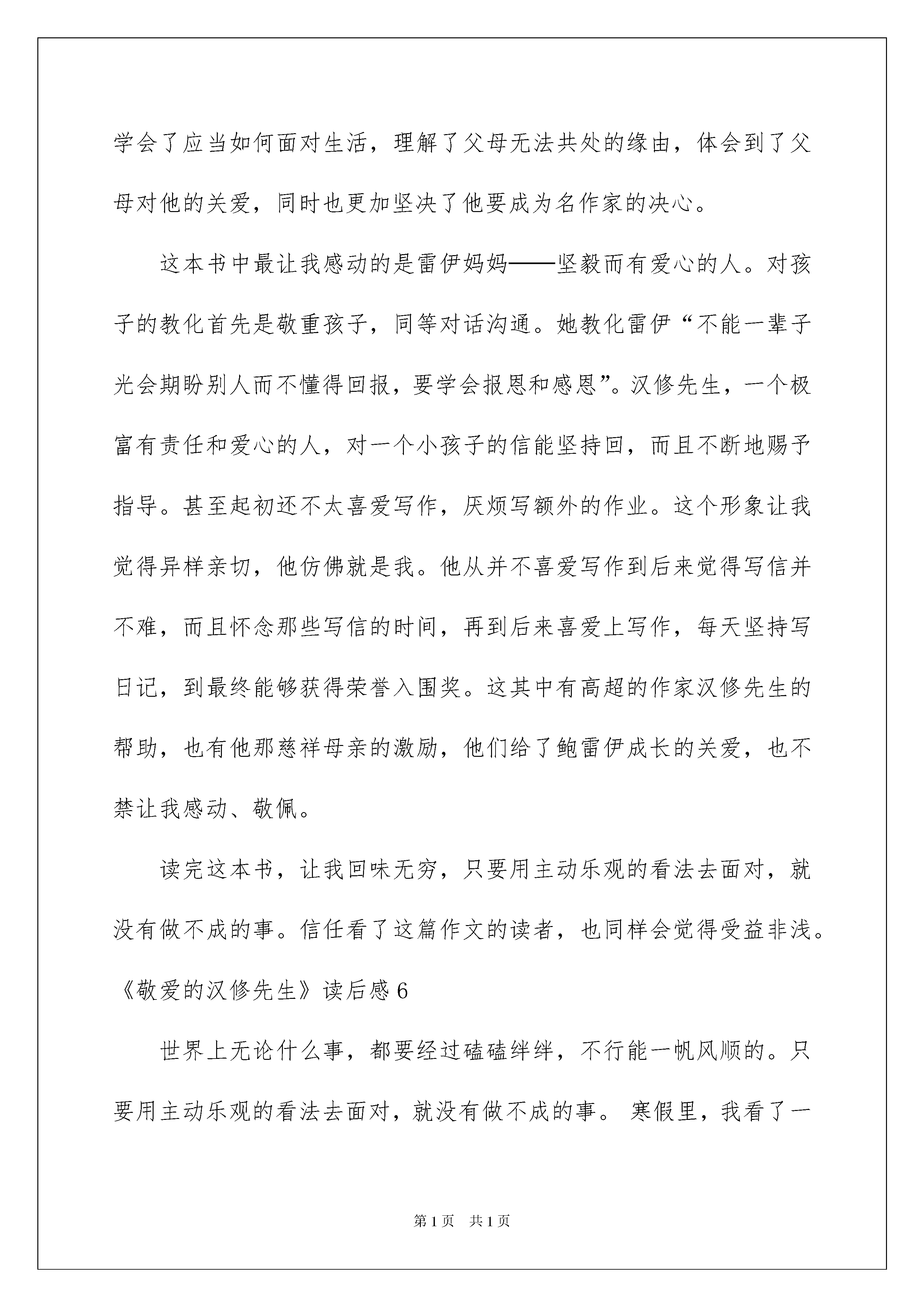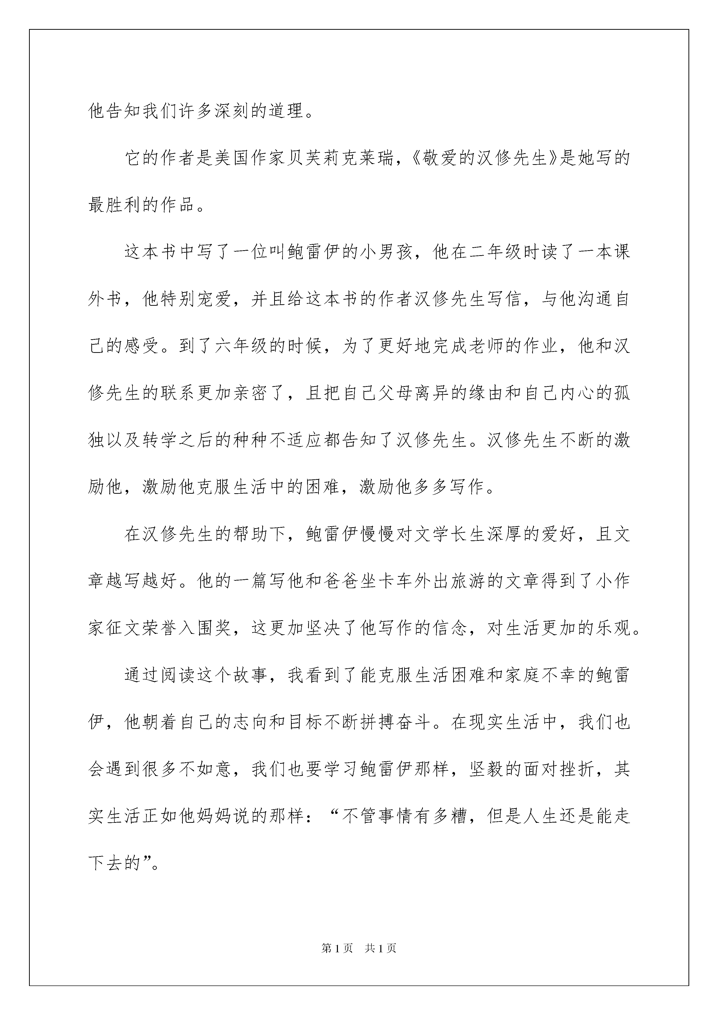 2022《亲爱的汉修先生》读后感《敬爱的汉修先生》读后感当看完一本著作后信任大家的视野肯定开拓了不少不妨坐下来好好写写读后感吧。那么你会写读后感吗?下面是我为大家整理的《敬爱的汉修先生》读后感仅供参考大家一起来看看吧。《敬爱的