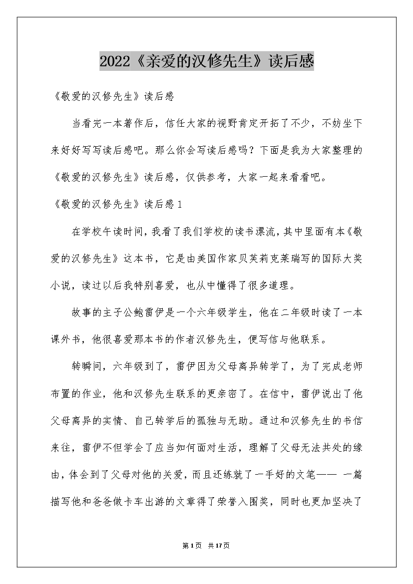 2022《亲爱的汉修先生》读后感《敬爱的汉修先生》读后感当看完一本著作后,信任大家的视野肯定开拓了不少,不妨坐下来好好写写读后感吧。那么你会写读后感吗?下面是我为大家整理的《敬爱的汉修先生》读后感,仅供参考,大家一起来看看吧。《敬爱的汉修先生》读后感1在学校午读时间,我看了我们学校的读书漂流,其中里面有本《敬爱的汉修先生》这本书,它是由美国作家贝芙莉