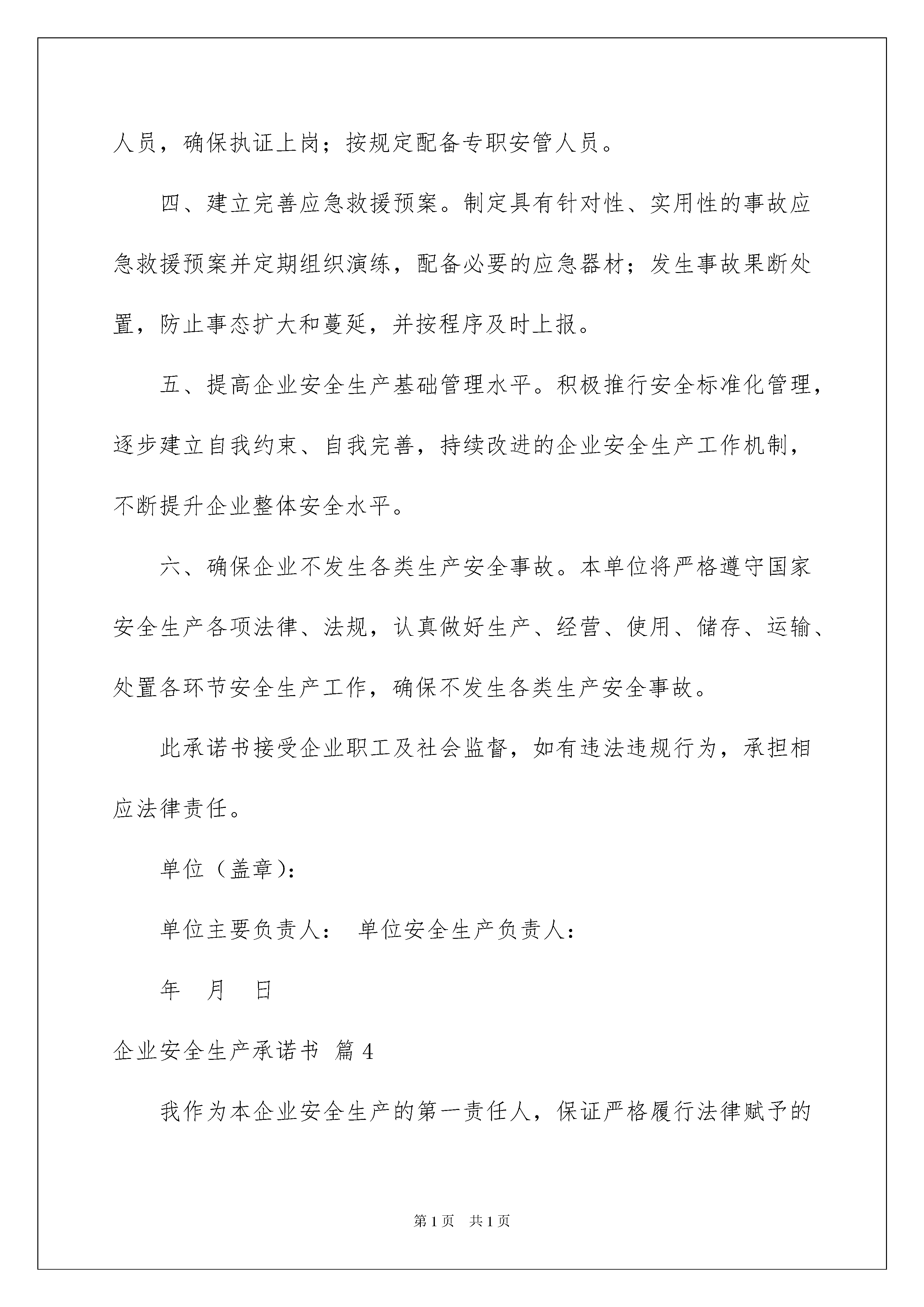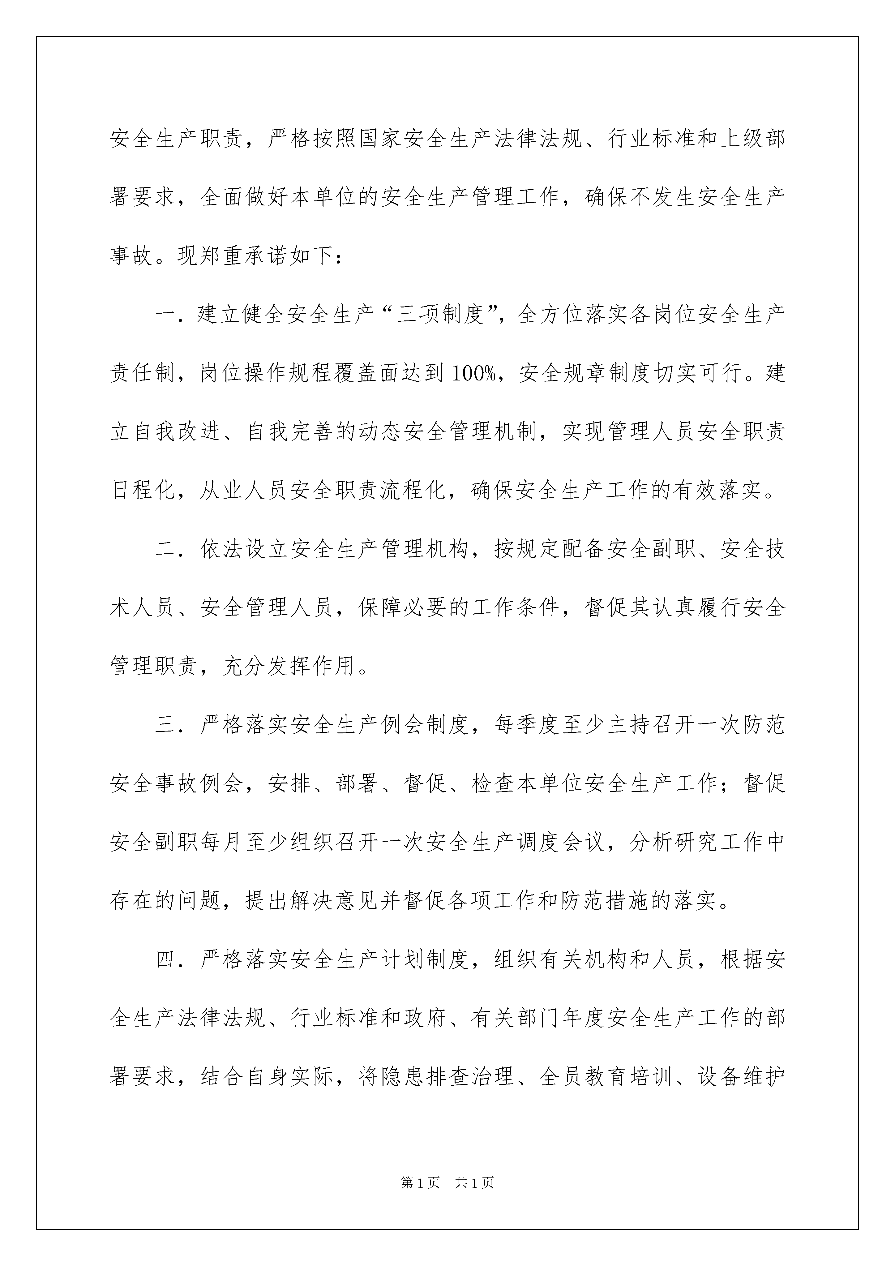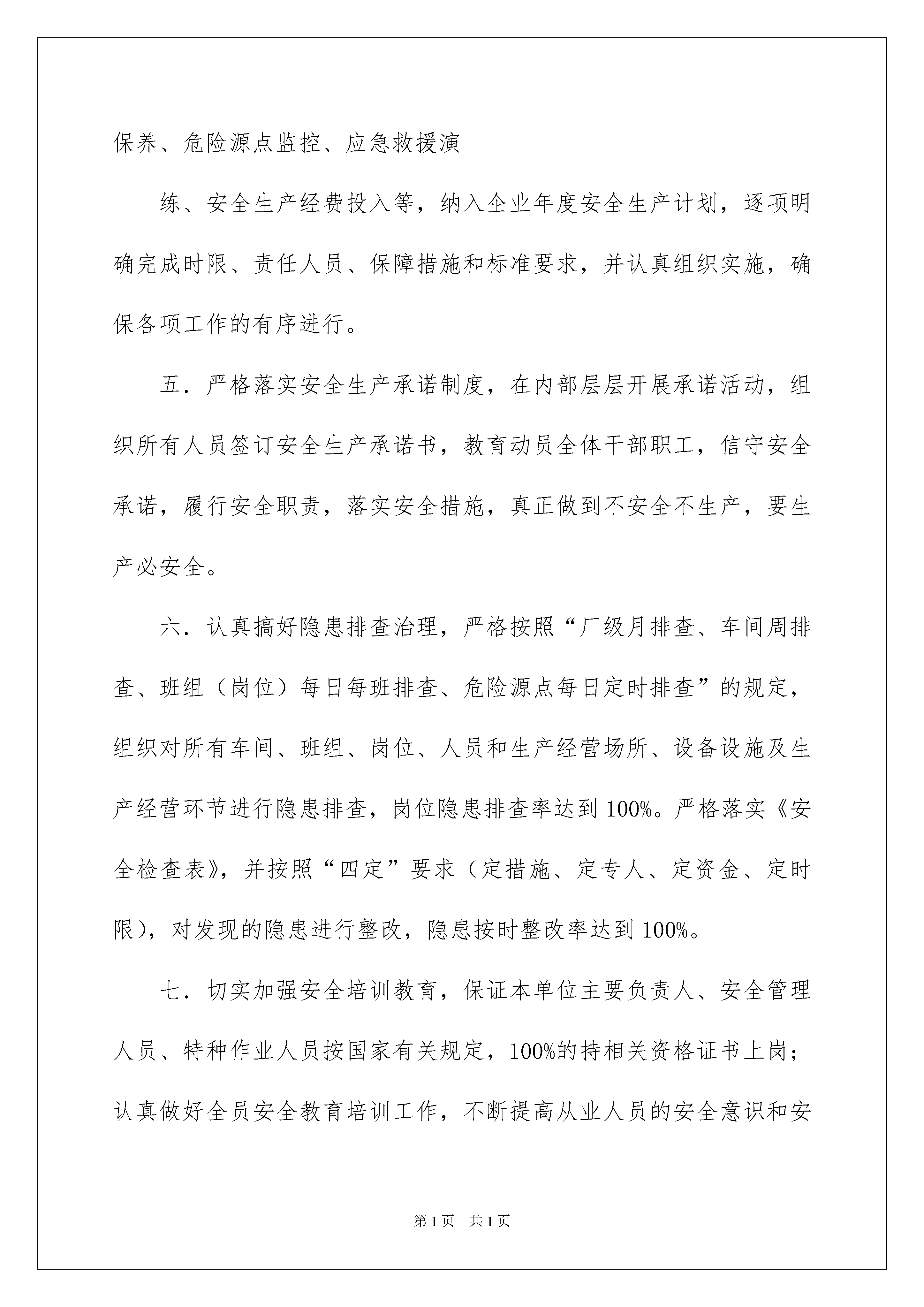 2022企业安全生产承诺书合集7篇企业安全生产承诺书合集7篇在发展不断提速的社会中,我们都可能会用到承诺书,承诺书如经合同认可,可以作为合同的一部分一同履行。那要怎么写好承诺书呢?以下是我为大家整理的企业安全生产承诺书7篇,欢迎阅读与收藏。企业安全生产承诺书篇1我承诺:1.严格遵守单位的安全生产规章制度和操作规程,服从单位的管理。2.自觉接受安全生产教育和培训,掌握本岗位工作的安全生产知识。3.拒绝“三违”,正确佩戴使用劳动防护用品,不伤害自己和他人。4.提高安全生产技能,知晓岗位潜在风险和危害,增强事故预防、应急处理、逃生自救能力。5.自觉对本单位安全生产工作提出建议,对存在的问题提出批评、检举、控告,发现事故隐患或者其他不安全因素立即报告。承诺人:xx20xx年6月xx日企业安全生产承诺书篇2为了确保公司安全生产工作和安全可靠供电,实现全年各项安全生产目标,我公司领导班子全体成员代表全体员工,向人民郑重承诺,在工作中认真履行安全生产职责,忠实执行各项安全工作制度规定,努力做到:1、严格遵守国家法律、法规,坚持贯彻“安全第一,预防为主”的方针,切实落实各级人员安全生产责任制,努力实现安全生产可控、在控和能控。2、建立健全生产安全保证体系和监督体系,完善生产安全指挥系统,健全安全管理与考核制度,制定实现公司年度安全生产工作目标的工作重点要求和措施并跟踪检查执行情况。3、在电网调度、运行、检修等生产工作中开展安全性评价工作,认真做好危险点分析和预控,大力开展标准化作业,对企业和工作现场的安全状况进行科学分析,找出薄弱环节和事故隐患,及时采取有效的防范措施。4、制订重大人员伤亡、大面积停电、设备大范围受损、重要变电所全停等安全事故应急处理预案,建立有系统、分层次、上下一致、分工明确、相互协调的安全事故应急处理体系,并组织实施。5、加强职工安全知识培训教育和安全工作规程的宣贯,并使之能正确运用在实际工作中。做好技术培训工作,特别是采用新工艺、新技术、新材料或者使用新设备时,及时编写相关安全技术规程和规定,培训作业人员掌握其安全技术特性和作业方法。6、严肃事故的调查处理,严格执行“四不放过”的原则。对性质严重或典型的事故,及时掌握事故情况,召开专题事故分析会,提出防止事故重复发生的措施并认真落实。7、确保安全生产所需资金的足额投入,重点保证反事故措施和安全技术劳动保护措施计划(“两措”计划)所需经费的提取和使用,建立安全生产奖励基金,保证安全奖励所需费用的提取和使用。8、督促指导对需求侧安全用电情况进行检查,对存在安全隐患的,下发整改通知书,督促指导用户及时整改,严防用户事故危及人身、电网、设备安全。对用户和农电设备按规定标准检查试验,杜绝不合格的设备接入电网。9、认真贯彻落实国家及上级关于保护电力设施、消防安全和反窃电的政策、法规及规定,切实做好本企业所辖电力设施的安全管理,确保电力设施的安全运行。健全保卫管理制度,落实安全防范措施,定期组织治安、消防安全大检查和消防演习,并配合当地公安部门做好外力破坏及火灾事故的调查处理工作。10、切实落实农电安全工作各项措施,以“三防十要”为重点贯穿于整个农电安全工作中,把“五查、反六不”作为确保农电安全的突破口来抓。11、加强公司安全文化建设,组织政工部门和党团组织,紧密围绕企业的安全生产形势,开展思想政治工作,采用各种生动有效的形式,对职工进行安全思想、敬业精神和遵章守纪等教育,使职工树立起牢固的“安全第一”思想。12、贯彻落实有关多种经营安全工作的规定,督促严格执行承、发包工程和临时工管理制度。规范合同管理,明确安全责任,并检查安全措施落实情况。13、严格执行《生产作业期间领导和各级管理人员必须到场的规定》,加大安全生产工作监督管理力度,在检修、施工和试验工程中,坚持做到“三有三必有”。积极开展现场督查和明查暗访,及时纠正、查处“三违”行为,领导和管理人员不发生违章指挥,强令冒险作业的行为。承诺单位(章):日期:企业安全生产承诺书篇3为进一步落实枣强县企业安全生产主体责任,防止和减少各类生产事故发生,确保枣强县安全生产形势稳定,本单位郑重承诺如下:一、认真落实安全生产主体责任。企业主要负责人是企业安全生产的第一责任人,对企业的安全生产工作全面负责。建立健全并严格执行安全生产责任制,强化企业基层和基础工作。二、做好安全大检查工作。建立并完善安全生产检查台帐,对查出的安全隐患,落实整改内容、整改措施、整改时限、整改部门、整改人员,按时完成整改。三、不断提高从业人员安全素质。对企业职工定期进行安全教育,建立企业、车间、班组“三级教育”档案;