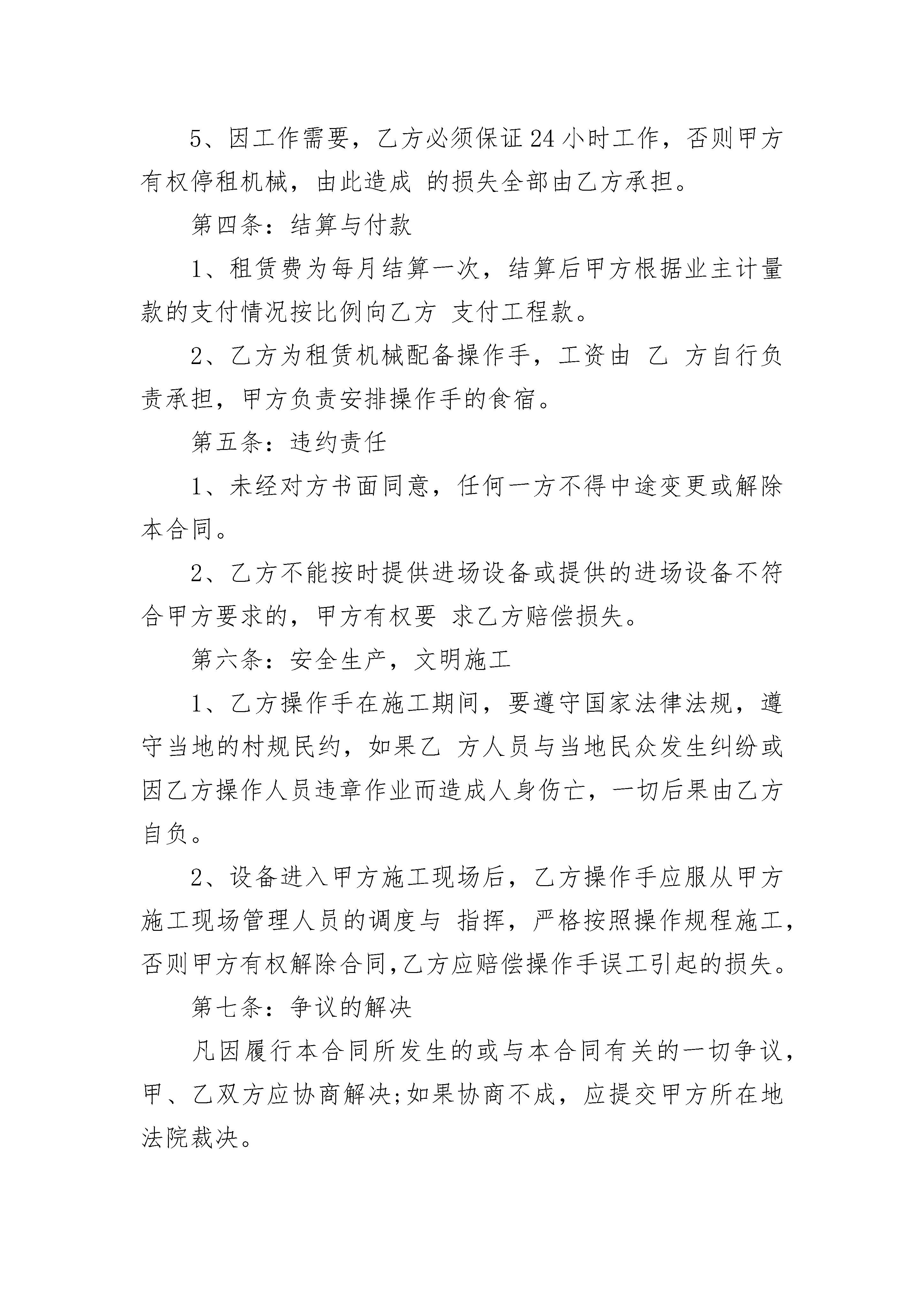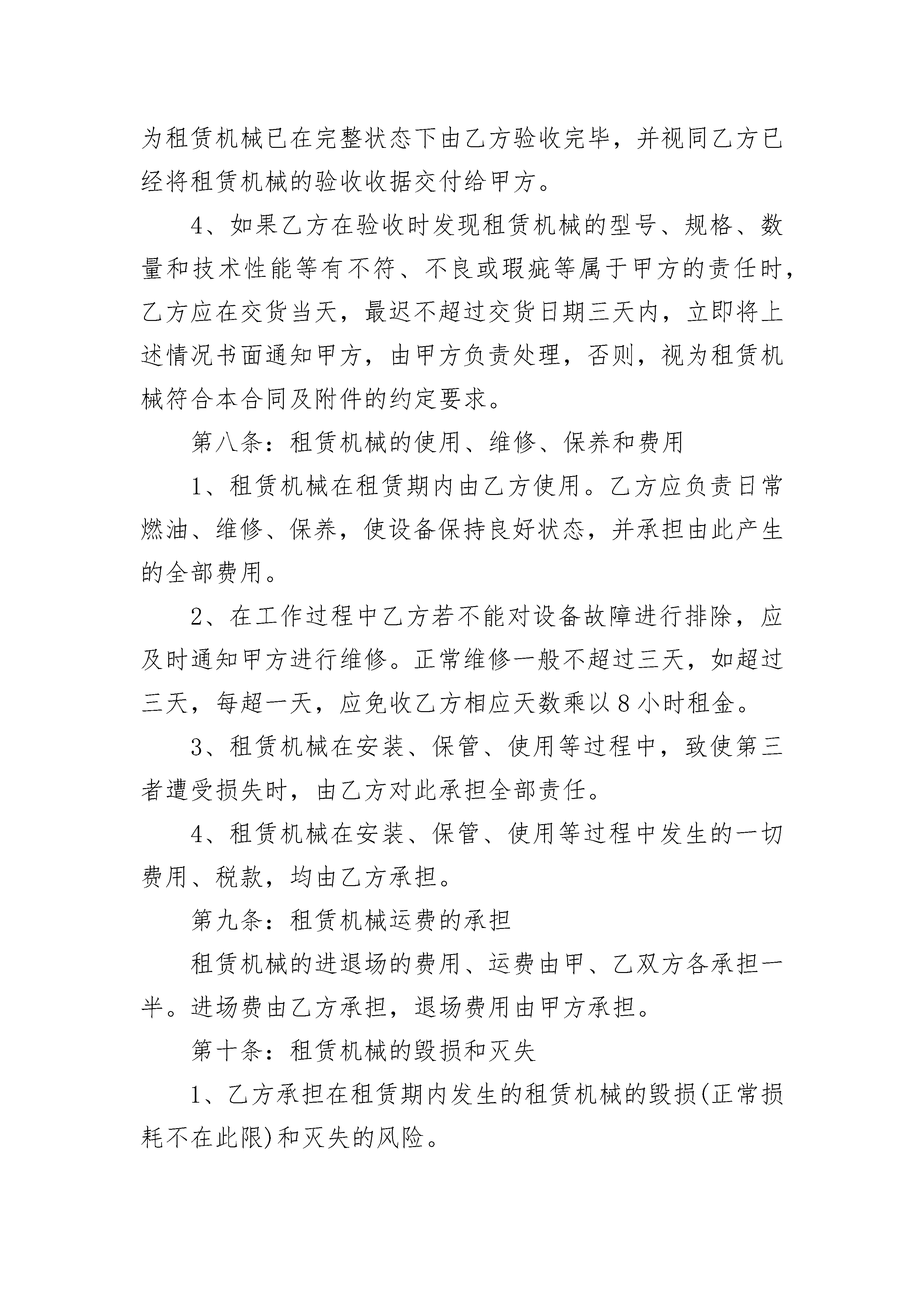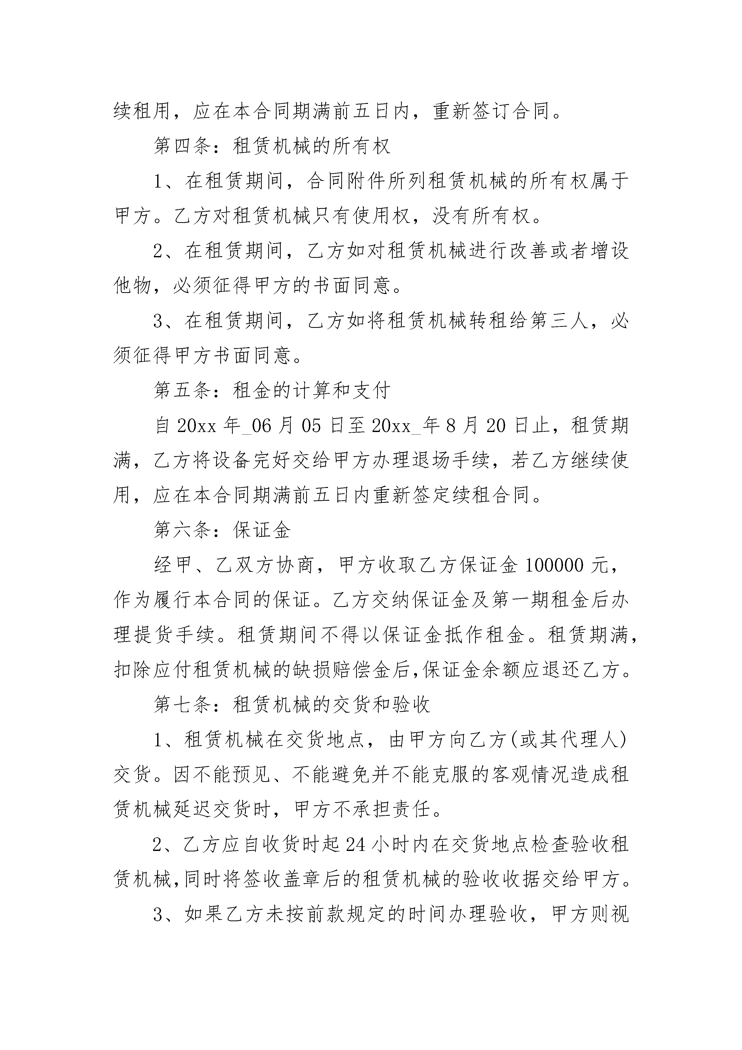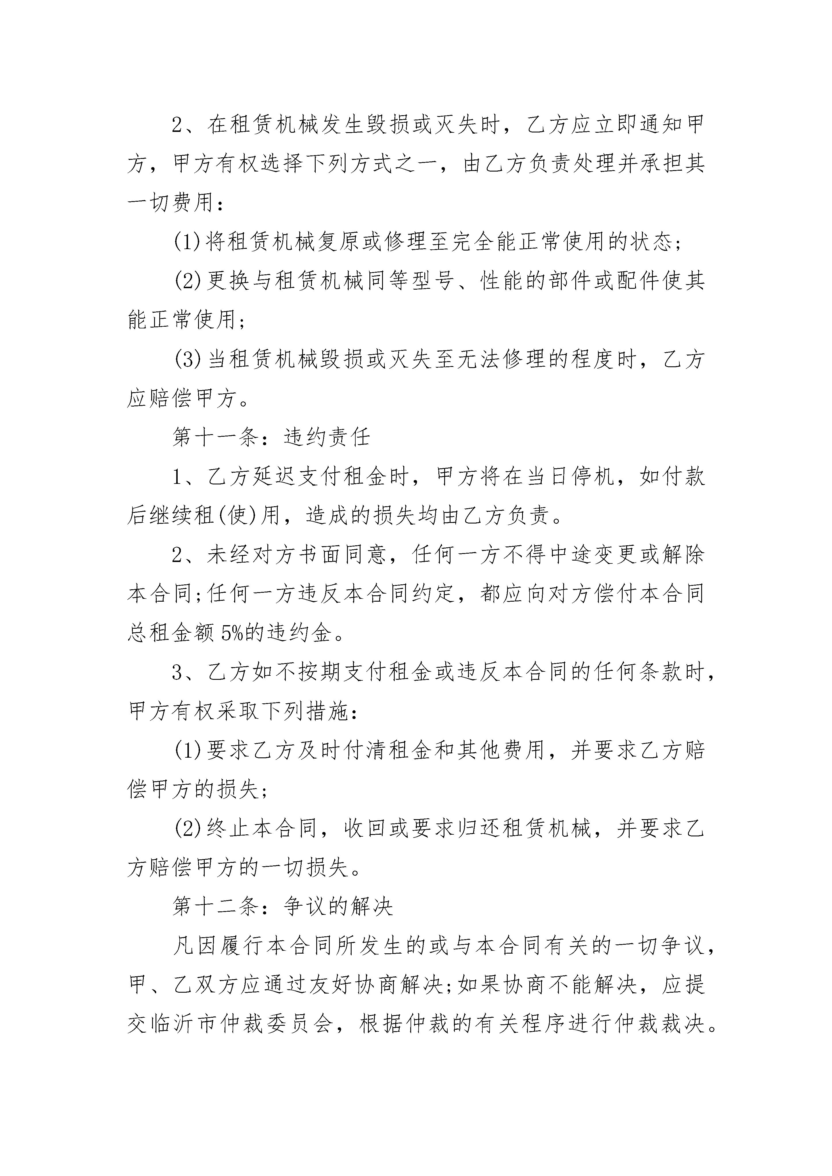 吊车机械租赁合同范本甲方:乙方:签订时间:根据《中华人民共和国合同法》的有关规定,按照平等互利的原则,经甲、乙双方充分协商同意后,特签订本合同:第一条:租赁机械概况第二条:租赁期限、地点、工作内容及单价1、租赁期限:乙方机械到达甲方工地后,从甲方使用之日起开始计租,至甲方下达停租通知之日起停租。2、使用地点:涧东大桥3、工作内容:桥面系及其它零星工程4、租赁价格(以月租计):26000元/月,单价含税金。租赁费按月租结算时,必须依据项目部机械设备部发放的《行车命令本》为准,天对天为整月,不足一个月的部分,