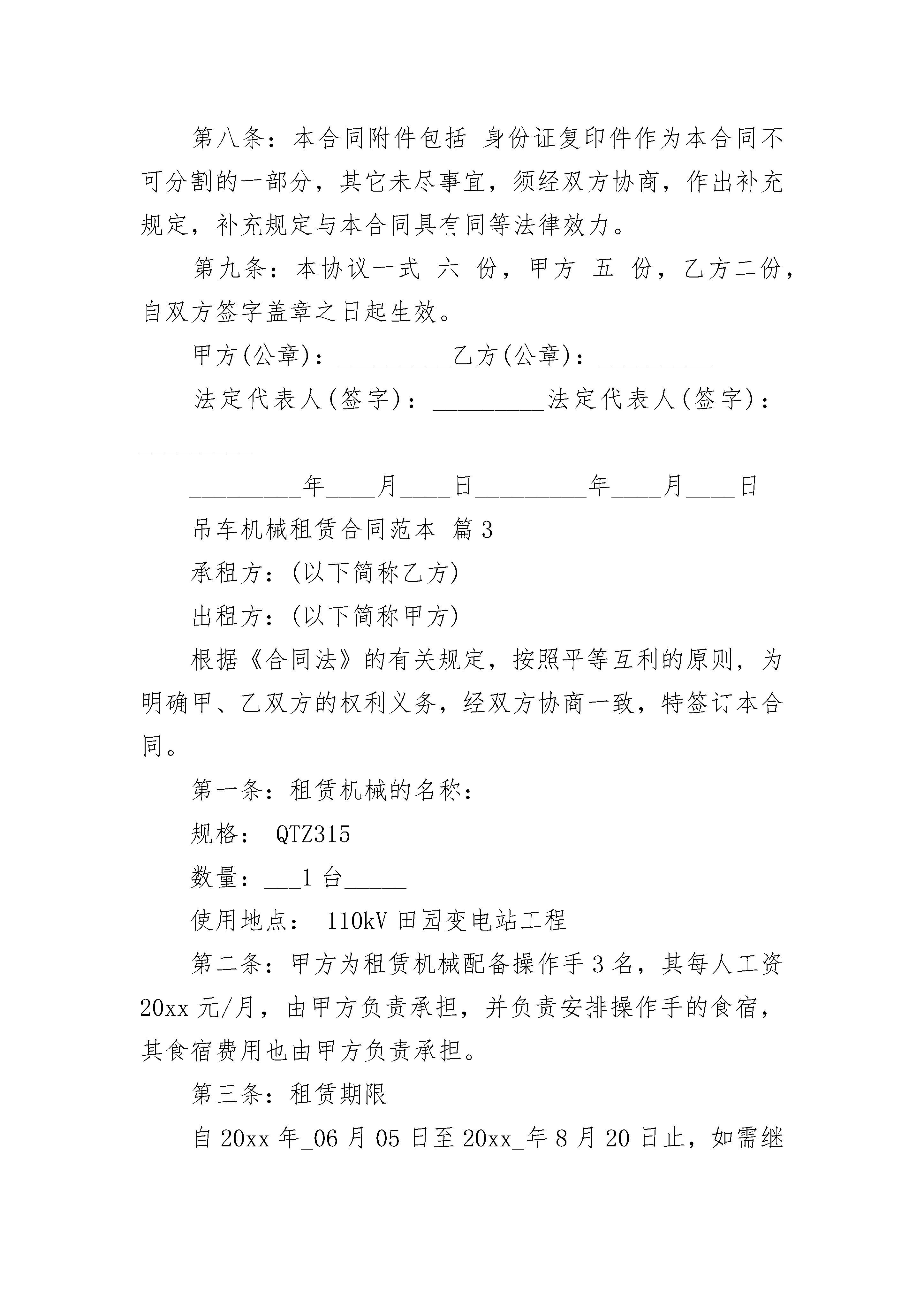 吊车机械租赁合同范本吊车机械租赁合同范本(精选19篇)吊车机械租赁合同范本篇1承租方:(以下简称甲方)出租方:(以下简称乙方)甲乙双方根据《中华人民共和国合同法》的有关规定,根据平等互利的原则,以双方协商,就机械租赁事宜达成以下协议条款,双方共同遵守:一、租用机械名称和规格:T汽车吊、轮胎式。二、租赁期限:从20xx年5月15日开工到20xx年11月15日结束。租赁期限暂定为6个月合同暂定期满后,甲方如果继续使用应在租赁期限到期前5日之内向乙方提成协商,另行签订补充协议。三、燃料乙方四、作业地点:鄞奉