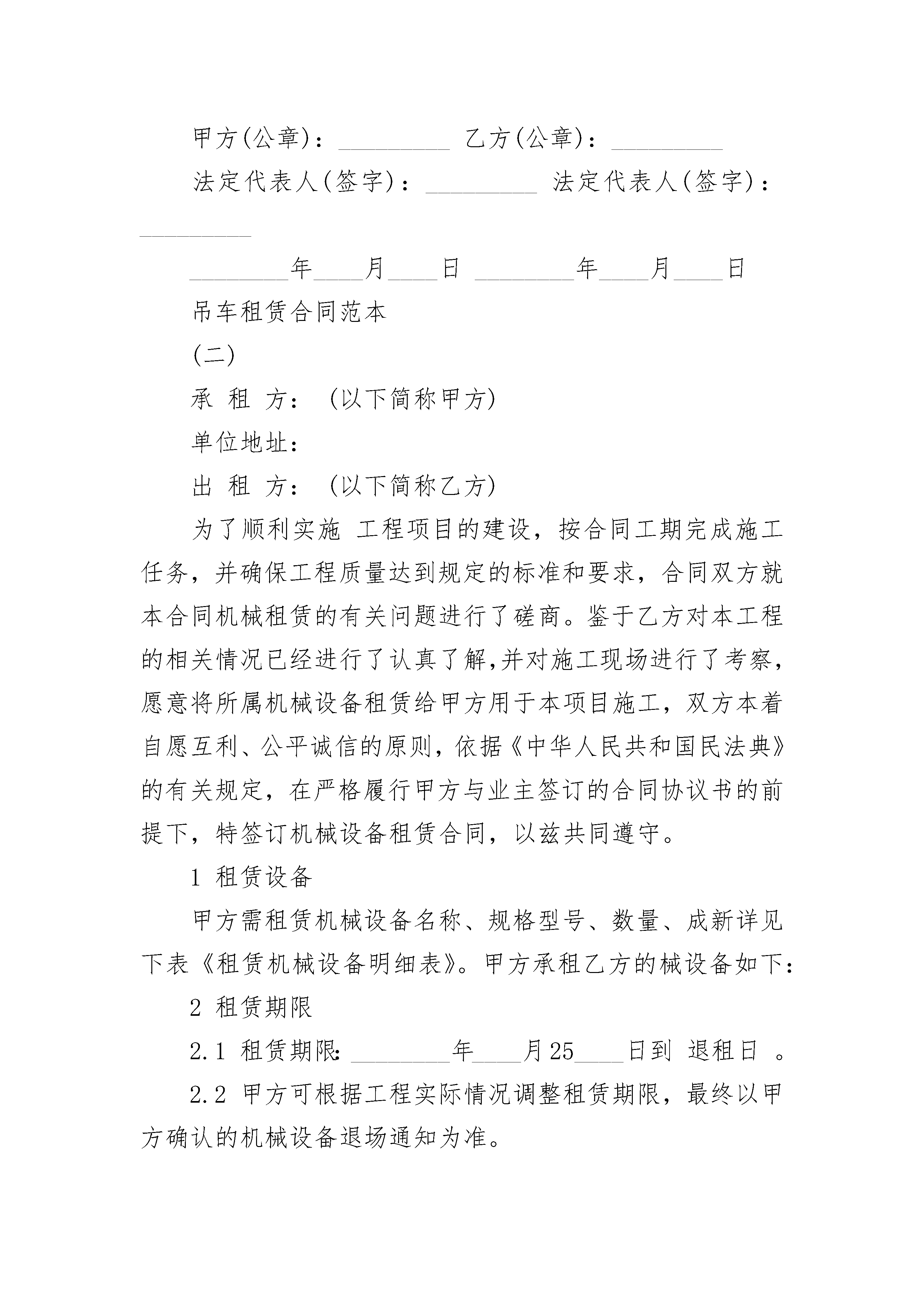 吊车租赁合同2023吊车租赁合同2023(通用23篇)吊车租赁合同2023篇1承租方:?(简称甲方)出租方:?(简称乙方)根据双方共同协商,同意租用吊车,配合甲方吊装,具体内容磋商如下:一、施工机械名称?吨吊车,数量:?台。二、施工内容和地点:?。三、租赁时间从?年?月?日至?年?月?日。四、甲方同意支付乙方设备进出场费用?元整。五、税后计_____标准?元/月,没有满月按?元/天计算,租用费用按月付款,租赁时间每满一个月时,承租方在三天内汇入出租方指定帐户。甲方退场当天结清所有月租金,如未结清乙方有