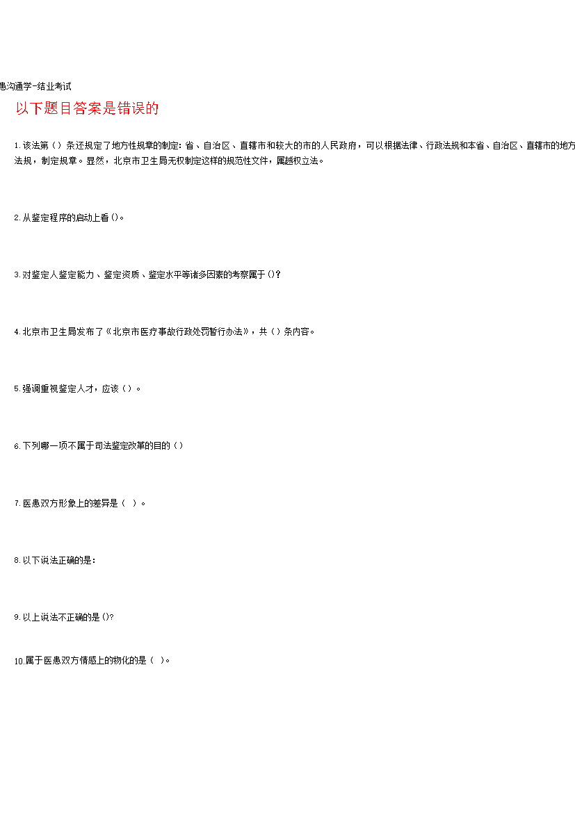 医患沟通学-结业考试以下题目答案是错误的1.该法第()条还规定了地方性规章的制定:省、自治区、直辖市和较大的市的人民政府可以根据法律、行政法规和本省、自治区、直辖市的地方性法规制定规章。显然北京市卫生局无权制定这样的规范性文件属越权立法。2.从鉴定程序的启动上看()。3.对鉴定人鉴定能力、鉴定资质、鉴定水平等诸多因素的考察属于()?4.北京市卫生局发布了《北京市医疗事故行政处罚暂行办法》共()条内容。5.强调重视鉴定人才应该()。6.下列哪一项不属于司法鉴定改革的目的()7.医患双方形象上的