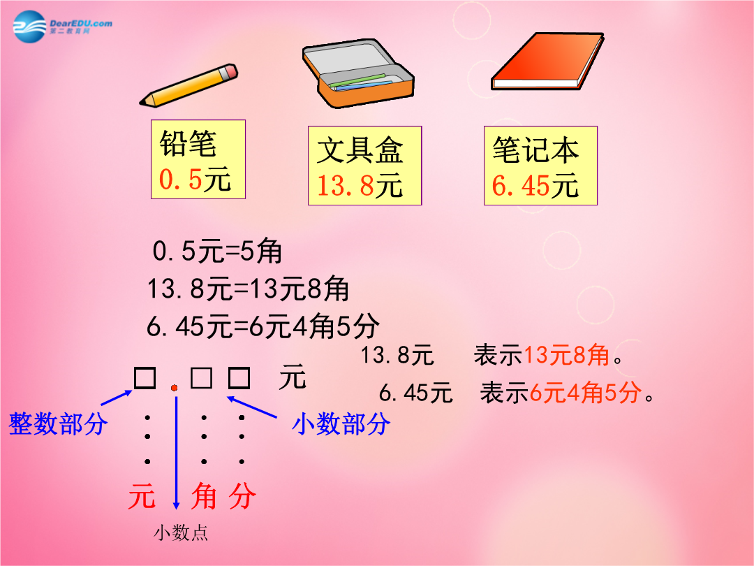 认识小数2分钟倒计时1分钟倒计时笔记本6.45元注意:陆地上最大的动物是非洲象,它的高度可达3.5米,重可达5.25吨。13.8元表示13元8角。只用米作单位怎样表示?只用米作单位怎样表示?1104、小华身高是一点四五米,写作()米,体重二十五点五千克,写作()千克。了解历史,拓展认识我国古代用小棒表示数。为了表示小数,就把小数点后面的数放低一格。例如:在西方,小数出现很晚。最早使用小圆点作为小数点的是德国数学家克拉维斯。还有一部分国家是用逗号表示小数点的。我要迟到了!我赶紧