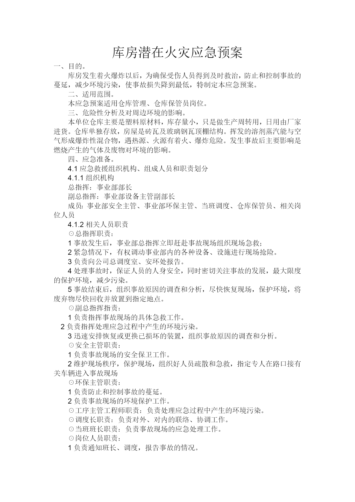库房潜在火灾应急预案一、目的。库房发生着火爆炸以后,为确保受伤人员得到及时救治,防止和控制事故的蔓延,减少环境污染,使事故损失降到最低,特制定本应急预案。二、适用范围。本应急预案适用仓库管理、仓库保管员岗位。三、危险性分析及对周边环境的影响。本单位仓库主要是塑料原材料,库存量小,只是做生产周转用,日用由厂家进货。仓库单独存放,房屋是砖瓦及玻璃钢瓦顶棚结构。挥发的溶剂蒸汽能与空气形成爆炸性混合物,遇热源、火源有着火、爆炸危险。发生事故后主要影响是燃烧产生的气体及废物对环境的影响。四、应急准备。4.1应急救援