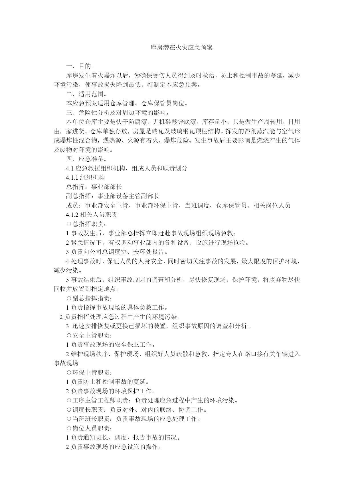库房潜在火灾应急预案一、目的。库房发生着火爆炸以后,为确保受伤人员得到及时救治,防止和控制事故的蔓延,减少环境污染,使事故损失降到最低,特制定本应急预案。二、适用范围。本应急预案适用仓库管理、仓库保管员岗位.三、危险性分析及对周边环境的影响。本单位仓库主要是快干防腐漆、无机硅酸锌底漆,库存量小,只是做生产周转用,日用由厂家进货。仓库单独存放,房屋是砖瓦及玻璃钢瓦顶棚结构。挥发的溶剂蒸汽能与空气形成爆炸性混合物,遇热源、火源有着火、爆炸危险.发生事故后主要影响是燃烧产生的气体及废物对环境的影响.四、应急准备