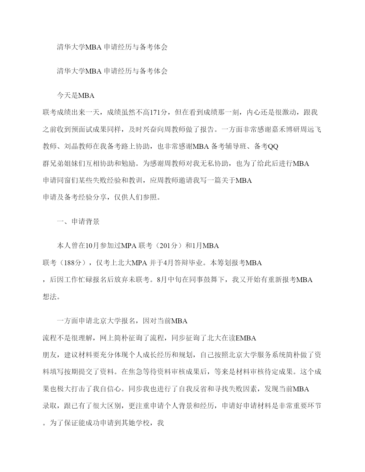 清华大学MBA申请经历与备考体会清华大学MBA申请经历与备考体会今天是MBA联考成绩出来一天,成绩虽然不高171分,但在看到成绩那一刻,内心还是很激动,跟我之前收到预面试成果同样,及时兴奋向周教师做了报告。一方面非常感谢嘉禾博研周远飞教师、刘晶教师在我备考路上协助,也非常感谢MBA备考辅导班、备考QQ群兄弟姐妹们互相协助和勉励。为感谢周教师对我无私协助,也为了给此后进行MBA申请同窗们某些失败经验和教训,应周教师邀请我写一篇关于MBA申请及备考经验分享,仅供人们参照。一、申请背景本人曾在10月参加过MPA