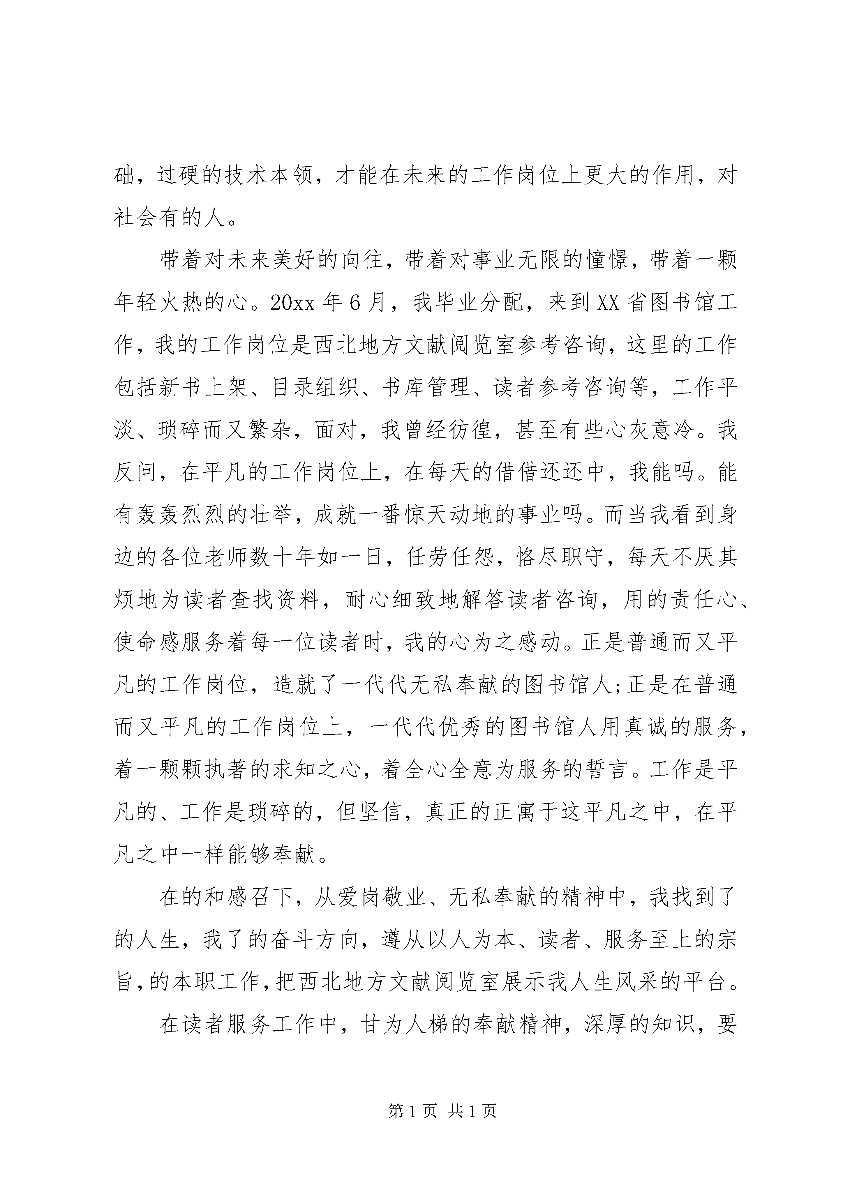 图书馆管理员演讲稿花朵的守护者是园丁,书籍的守护者是图书管理员。下面小编为你介绍关于图书管理员演讲稿,希望能帮到你。篇一有人说,图书馆工作是神圣的,因为它守望着人类精神的家园;也有人说,图书馆工作是平凡的,因为它只是众多职业中很普通的一种。一位科学家说:我好像在海边捡拾贝壳的小孩。生活似海,知识似海,在图书馆岗位上的我,更感觉自己好像在海边捡拾贝壳的小孩。在图书馆工作的时光如水一般在静静的流淌。我从一个稚嫩的孩子在慢慢走向成熟,这段悠闲又紧张、优雅且充实、从容而智慧的航程,作为生活的回报,正在慢慢的融入我