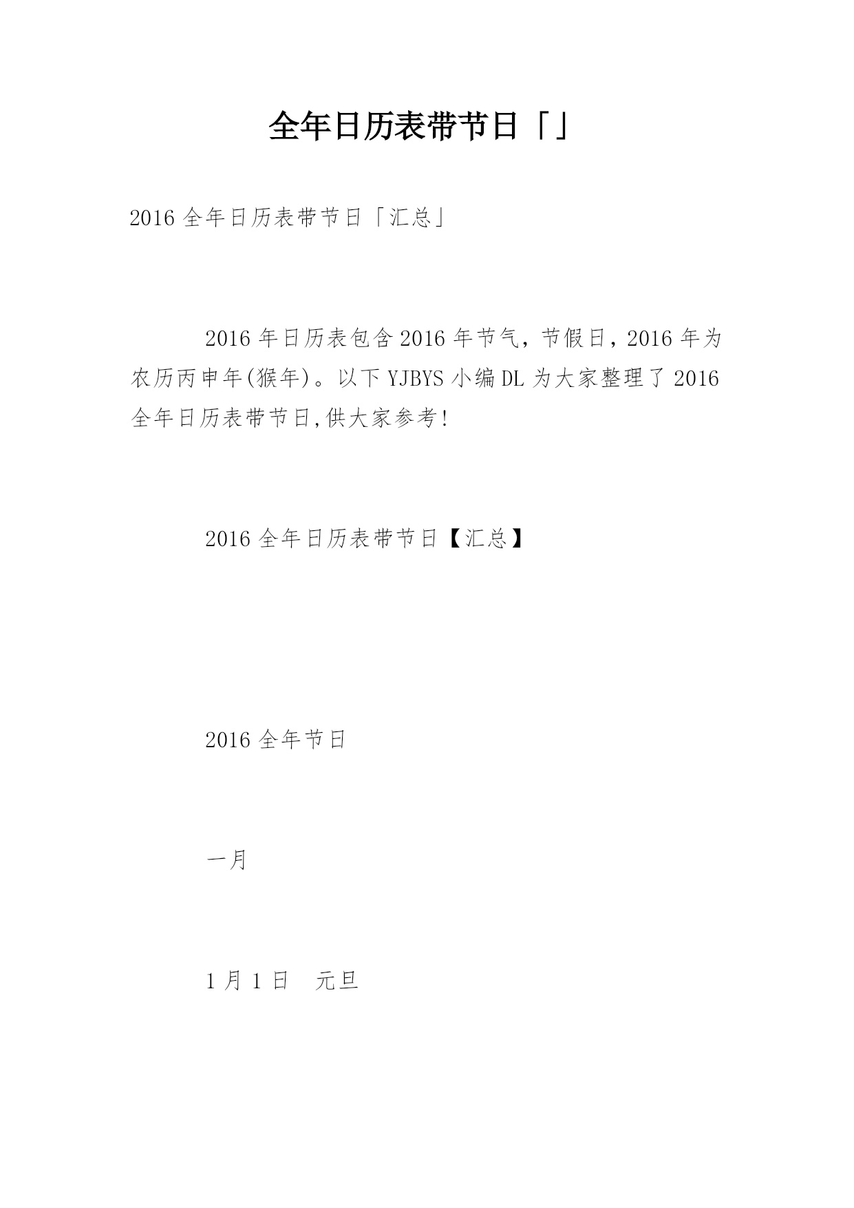全年日历表带节日「」2016全年日历表带节日「汇总」2016年日历表包含2016年节气,节假日,2016年为农历丙申年(猴年)。以下YJBYS小编DL为大家整理了2016全年日历表带节日,供大家参考!2016全年日历表带节日【汇总】2016全年节日一月1月1日元旦1月17日腊八节二月2月1日祭灶节2月7日除夕2月8日春节2月12日破五2月14日情人节2月22日元宵节2月23日芦笙节(苗族)三月3月8日三八妇女节3月10日二月二龙抬头3月12日植树节3月15日3·15消费者权益日3月27日复活