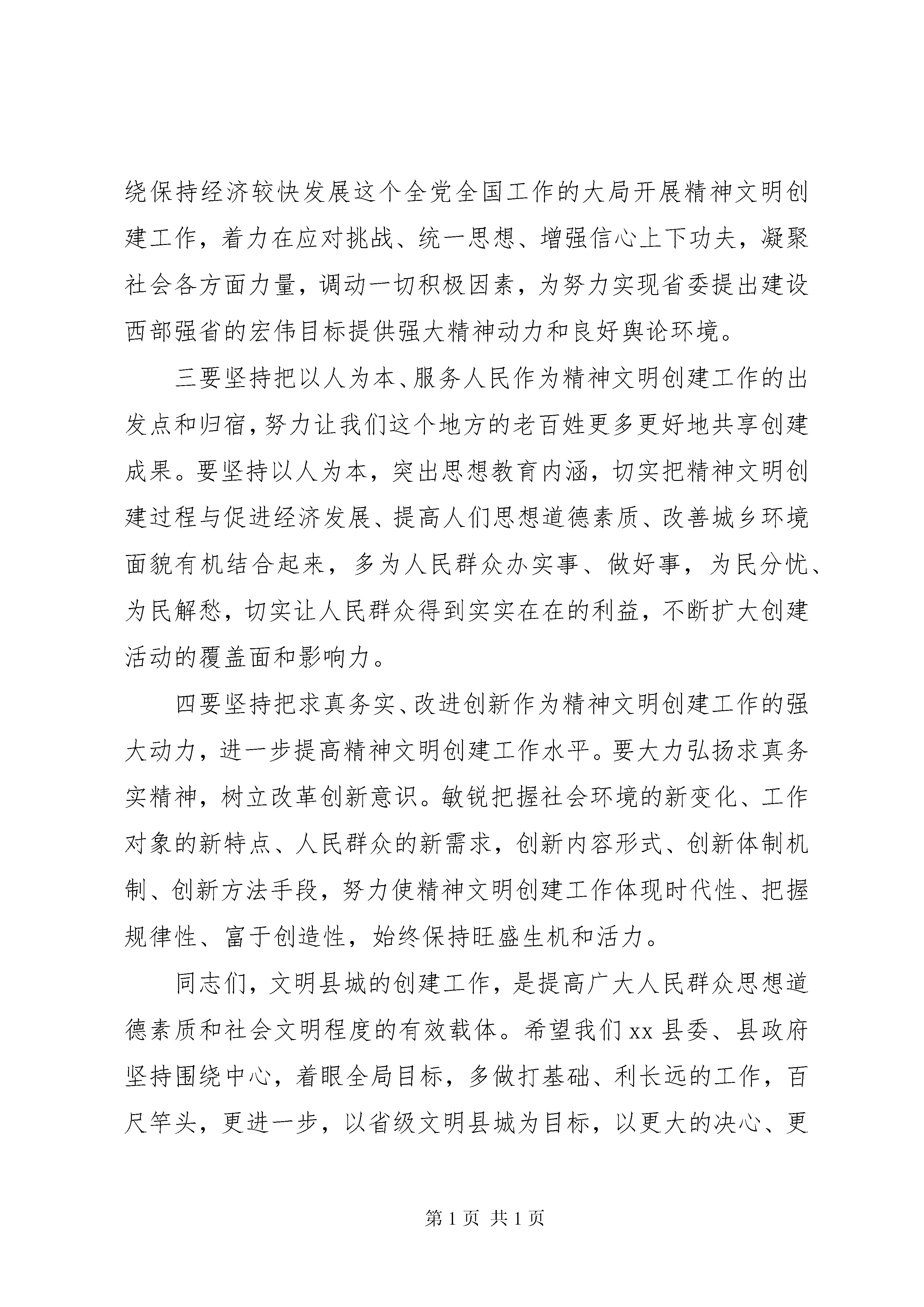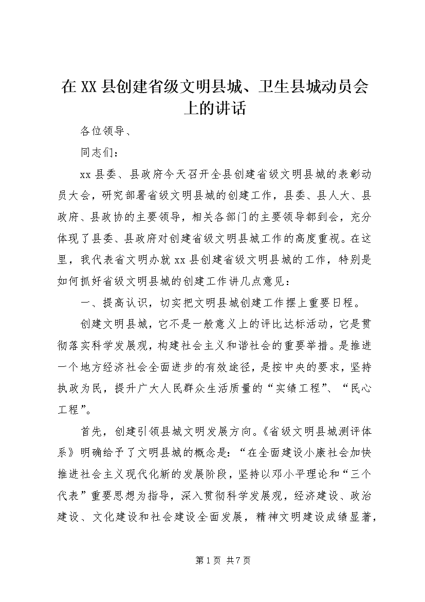 第PAGE\*Arabic\*MERGEFORMAT7页共NUMPAGES\*MERGEFORMAT7页在XX县创建省级文明县城、卫生县城动员会上的讲话各位领导、同志们:xx县委、县政府今天召开全县创建省级文明县城的表彰动员大会,研究部署省级文明县城的创建工作,县委、县人大、县政府、县政协的主要领导,相关各部门的主要领导都到会,充分体现了县委、县政府对创建省级文明县城工作的高度重视。在这里,我代表省文明办就xx县创建省级文明县城的工作,特别是如何抓好省级文明县城的创建工作讲几点意见:一、提高认