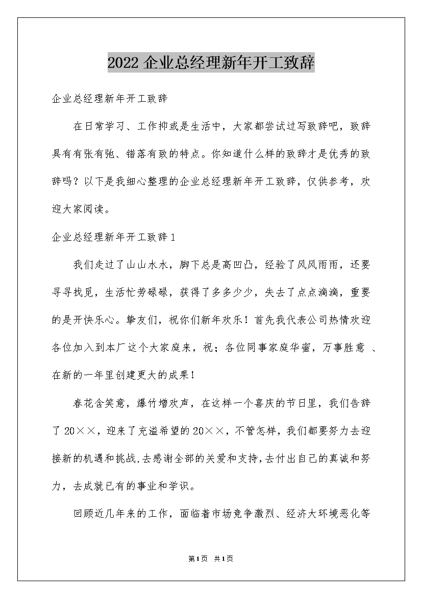 2022企业总经理新年开工致辞企业总经理新年开工致辞在日常学习、工作抑或是生活中,大家都尝试过写致辞吧,致辞具有有张有弛、错落有致的特点。你知道什么样的致辞才是优秀的致辞吗?以下是我细心整理的企业总经理新年开工致辞,仅供参考,欢迎大家阅读。企业总经理新年开工致辞1我们走过了山山水水,脚下总是高凹凸,经验了风风雨雨,还要寻寻找觅,生活忙劳碌碌,获得了多多少少,失去了点点滴滴,重