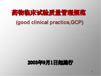 药物临床试验的有关法规《中华人民共和国药品管理法》2001《中华人民共和国药品管理法实施条例》2002《药物临床试验质量管理规范》2003《药品注册管理办法》2005《药品临床研究的若干规定》2000《药品不良反应报告和检测管理办法》2004《药物临床试验机构资格认定办法(试行)》2004《药物临床试验机构资格复核检查标准》《药物临床试验伦理审查工作指导原则》《医疗器械注册管理办法》2004《药物临床试验机构管理指导原则》待颁布第一章总则(1-4条)遵循GCP的重要性第二章临床试验前的准备和必要条件(5-
