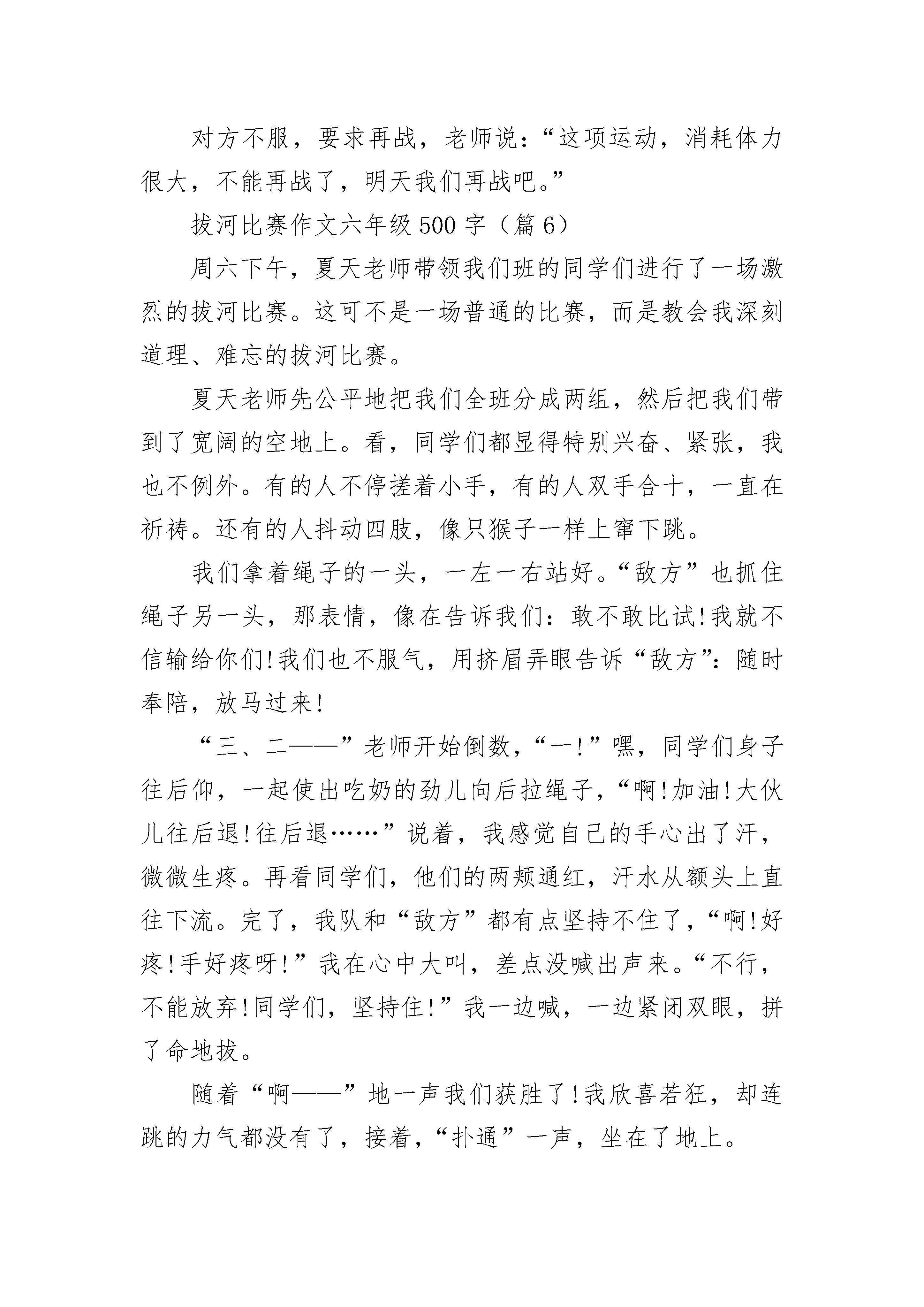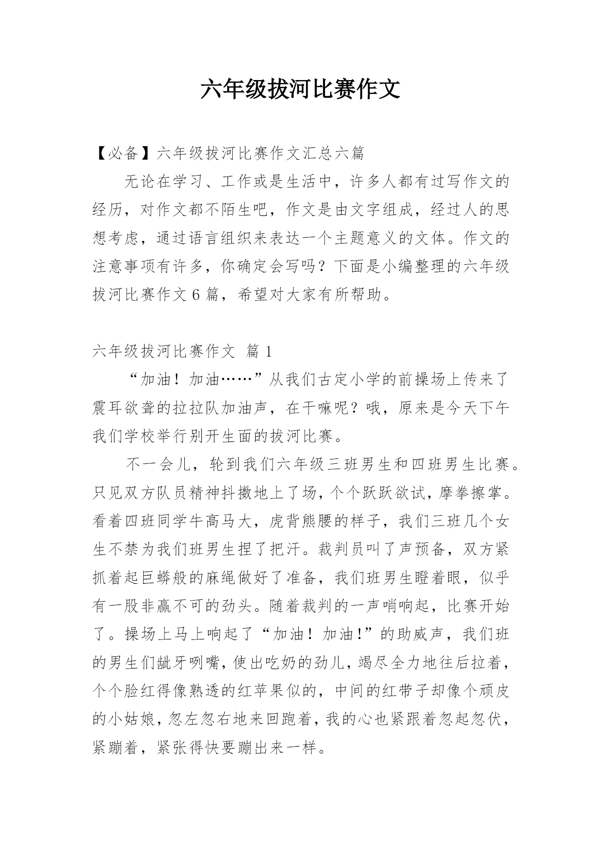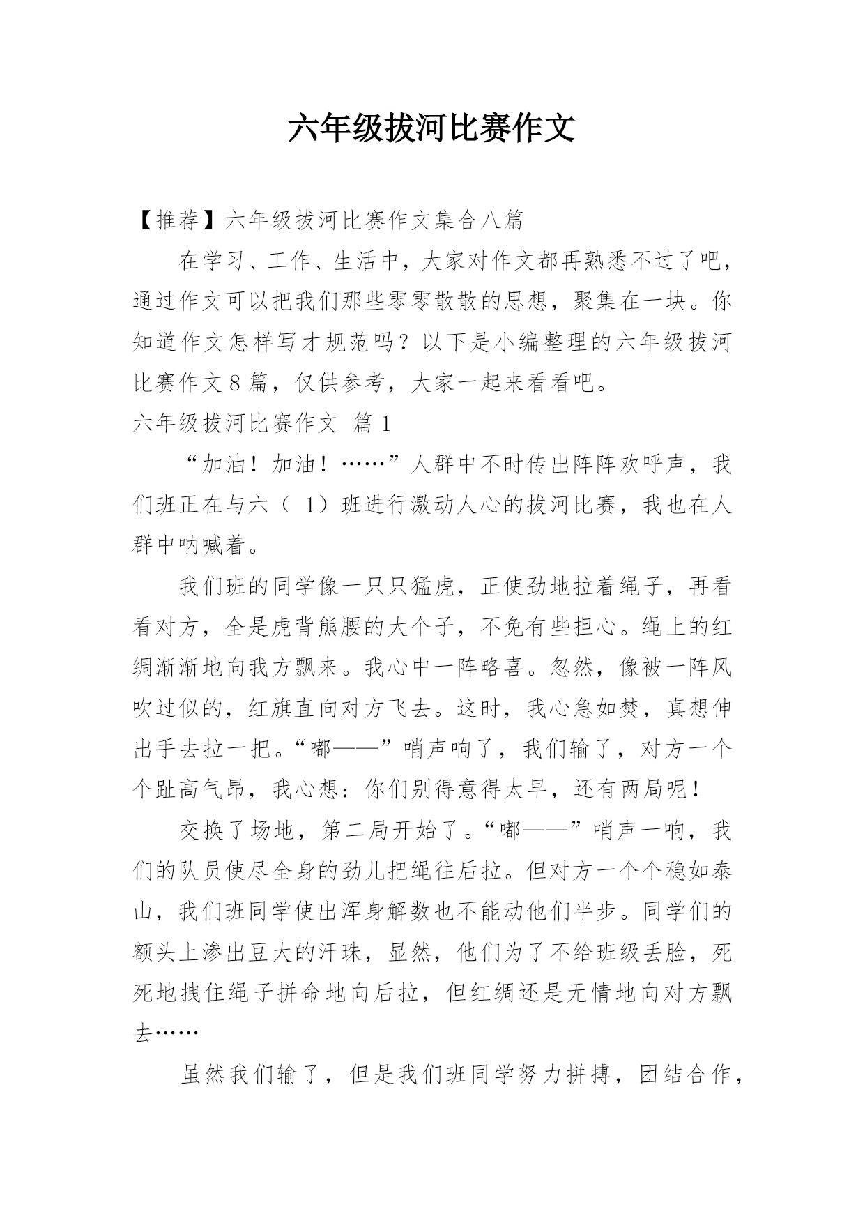 拔河竞赛小学六年级作文【六年级作文】拔河竞赛可谓是体育运动中最受欢迎的工程之一下面我们来看看拔河竞赛小学六年级作文欢迎阅读借鉴。拔河竞赛小学六年级作文1星期四下午活动时间的铃声响了同学们快步走出教室参加一年一度的拔河竞赛。首场竞赛是五年级的男同学和六年级的男同学竞赛。首先每班各派出一名同学代表本班抽签用“石头剪子布”的方式觉得南北方向。结果五年级在北六年级在南。只见他们每个班的同学用手紧握粗绳两脚互相抵着身子向后倾两眼注视着裁判。当裁判吹响哨子是时两队的队员用劲拉着拽着。围观的人不停地