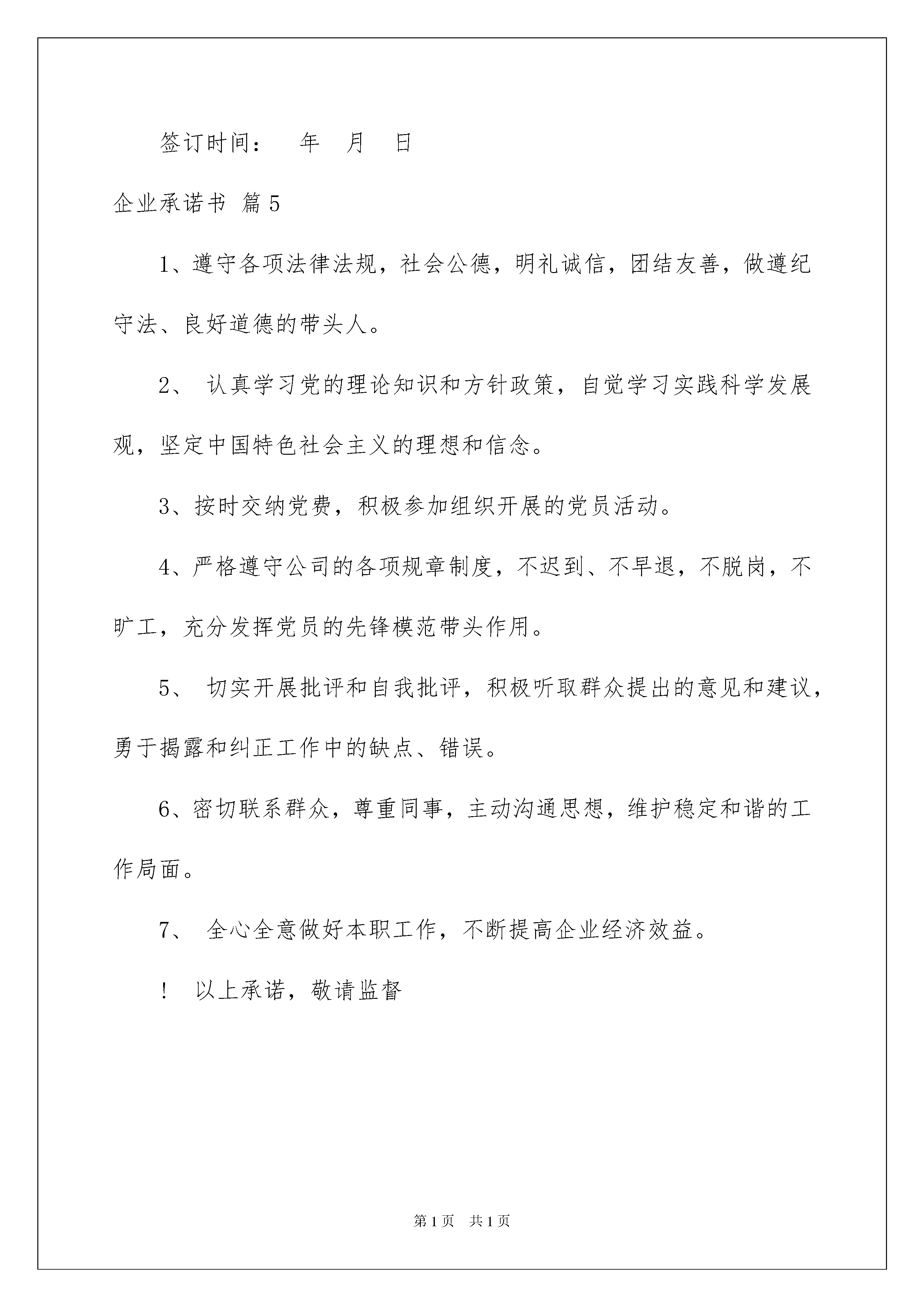 2022企业承诺书汇总5篇企业承诺书汇总5篇随着社会不断地进步,承诺书应用范围愈来愈广泛,承诺书是承诺人对要约完全的、单纯的同意,并以书面的形式表示。如何写一份恰当的承诺书呢?下面是我为大家收集的企业承诺书5篇,欢迎大家分享。企业承诺书篇120xx年,集团公司党委开展的“我在企业有责任”和“创先争优”主题教育活动,是新时期加强企业党的建设的重要举措。我作为xxxxxx的班子成员,我积极响应组织的号召,把这个主题教育活动融入到日常的管理中,用主题教育活动切实提高员工的责任意识、大局意识,起到了比较好的效果。而我本人也要从自身做起,从小事做起,严整纪律,规范行为,做好本职工作,以实际行动发挥党员干部的先锋模范作用,现做如下承诺,请各级领导和员工给予监督:一、带头学习,建立学习型组织。现今社会是知识型社会,没有知识或知识更新不及时都将面临淘汰。作为xxxxxx的带头人,我将认真学习实践科学发展观,学习新的管理知识,新技能,加强项目管理等业务知识学习,切实提高自身的.工作能力和水平。我将带领全体员工建立定期学习制度,集中学习和自学相结合,加大培训投入,为员工购置图书、光盘等各种培训资料,确实将xxxxxx建立成一个学习型组织。二、爱岗敬业,全面提高业务水平。1、以高度的事业心和责任感不断加强业务能力的学习和积累,抓好项管部全面工作。2、在施工过程中要注重科学管理和技术创新,积极推行各项新工艺和现代管理手段和方法。3、在现场管理中要做到文明施工、厉行节约,积极开展“双增双节”活动,达到工地标准化作业,保证施工环境良好。4、严格按照施工程序施工,均衡组织人力、物力、设备,随时掌握工程进度、质量状况,把好各工序之间的质量安全关。5、充分调动项目全体人员的积极性,努力提高经济效益。三、以“一家人”理念团结职工、维护职工合法权益。我继续以“一家人”为理念,团结职工,维护职工的合法权益,确保《集体合同》有效落实。1、确保职工“三险一金”及时足额上交。2、确保职工工资和各项福利的及时发放。3、做好企务公开,尊重职工知情权。4、按集团公司十字建家标准做好建家建线工作,改善职工工作生活环境,提高职工生产积极性。四、科学发展,创誉增效,实现项管部发展目标。人才是企业发展的根基,要让真正德才兼备的有理想、有能力、有才华的优秀人才走上重要岗位,鼓励和支持、帮助他们充分发挥聪明才智,为公司的发展做出积极的贡献,推动xxxxxx做大、做强、做好、做精。以高度的事业心和责任感带领项目部全体员工认真践行“诚信创新永恒、精品人品同在”的企业价值观,以干好在建促承揽,实实处处为企业发展着想,在业主中树立良好的企业形象,努力实现云南水利水电市场的大发展。以上承诺,请上级党组织及项目部全体员工给予监督。企业承诺书篇2根据《中华人民共和国劳动合同法》第五十条规定:“用人单位应当在解除或者终止劳动合同时出具解除或者终止劳动合同的证明,并在十五日内为劳动者办理档案和社会保险关系转移手续。”和《天津市就业促进条例》第十九条规定:“用人单位招用劳动者,应当自录用之日起30日内到公共就业服务机构为劳动者办理就业登记手续;用人单位与劳动者终止或者解除劳动关系后,应当自终止或者解除之日起15日内到用人单位所在地的公共就业服务机构办理备案手续。”现我单位(单位名称)由于原因,未在(用工/退工)(30日/15日)内办理(就业登记/退工备案)手续,如由此引起在规定时限内不能退档至户籍地、不能享受失业保险待遇、不能在户籍地办理失业登记、不能在户籍地个人缴费、不能享受失业期间相关促进就业政策等后果,由我单位承担全部责任。(单位名称)(公章)年月日超期人员名单如下:企业承诺书篇3根据精准扶贫工作要求,按自愿的原则,我与结对帮扶,并作出承诺:一、帮扶目标二、承诺内容(一)基本承诺1、按照“两入一公示”(入户、入心、公示)的要求建立帮扶关系;2、协调帮扶对象制定脱贫计划,选择脱贫途径,发展致富项目;3、主动给帮扶对象送惠农政策、致富信息、送技能技术,增强发展能力;(二)具体措施三、完成时限年脱贫其他本承诺一式四份,承诺人、联系户、监督人、扶贫办各执一份。企业承诺书篇4为了确保食品质量安全,保障人民群众的身体健康和生命安全,本企业特向社会郑重承诺:一、本企业生产的食品符合国家法律、法规和国家标准、行业标准、地方标准的质量安全规定,满足保障身体健康、生命安全的要求。二、严格按照国家的法律、法规和相关标准的规定组织生产,保证持续满足食品质量安全的环境条件和相应的卫生条件。三、严格执行原辅材料、食品添加剂和食品包装材料、容器的进货验收制度,核对每批原辅材料检