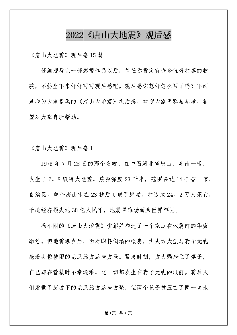 2022《唐山大地震》观后感《唐山大地震》观后感15篇仔细观看完一部影视作品以后,信任你肯定有许多值得共享的收获,不妨坐下来好好写写观后感吧。观后感你想好怎么写了吗?下面是我为大家整理的《唐山大地震》观后感,欢迎大家借鉴与参考,希望对大家有所帮助。《唐山大地震》观后感11976年7月28日的那个夜晚,在中国河北省唐山、丰南一带,发生了7。8级特大地