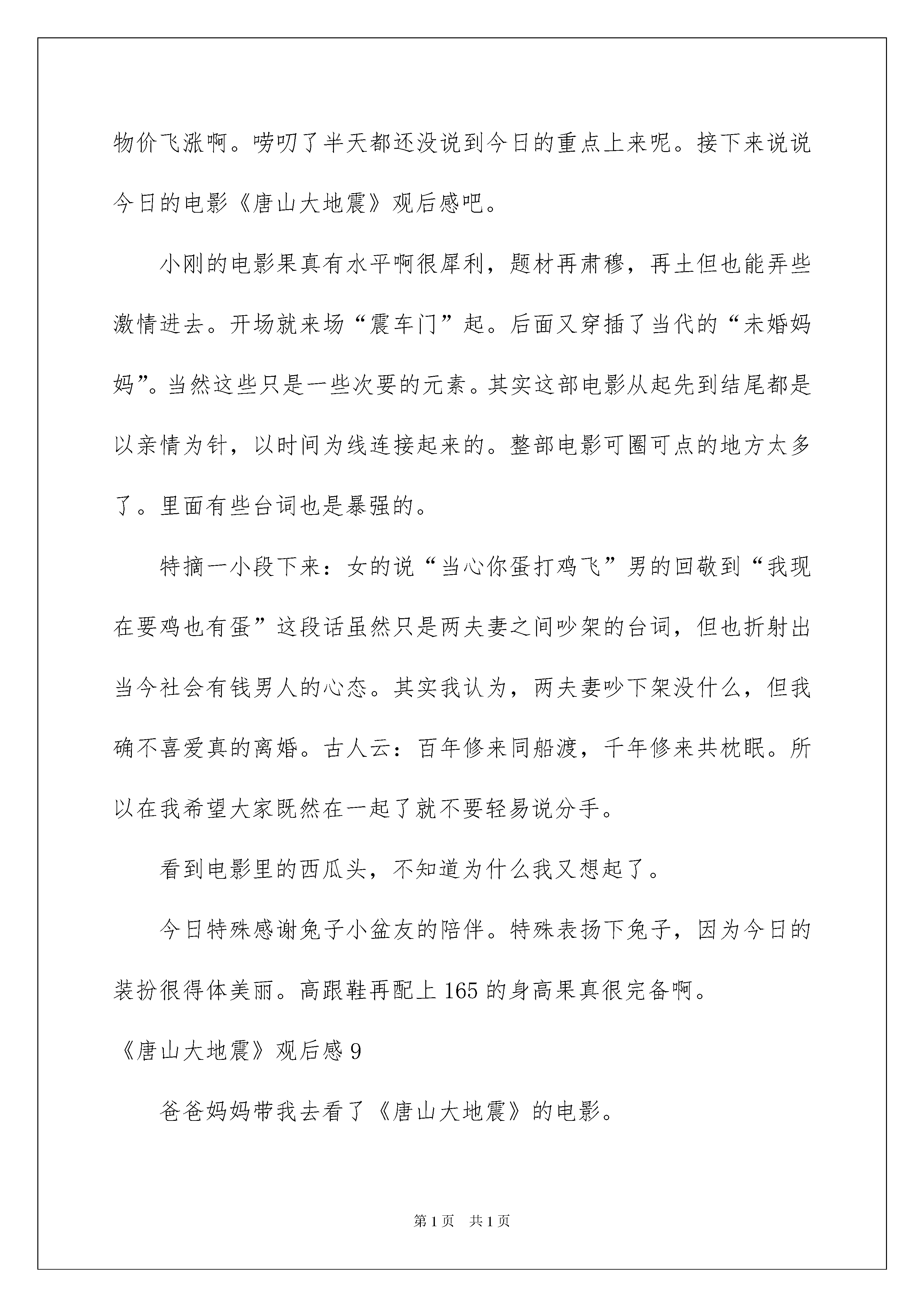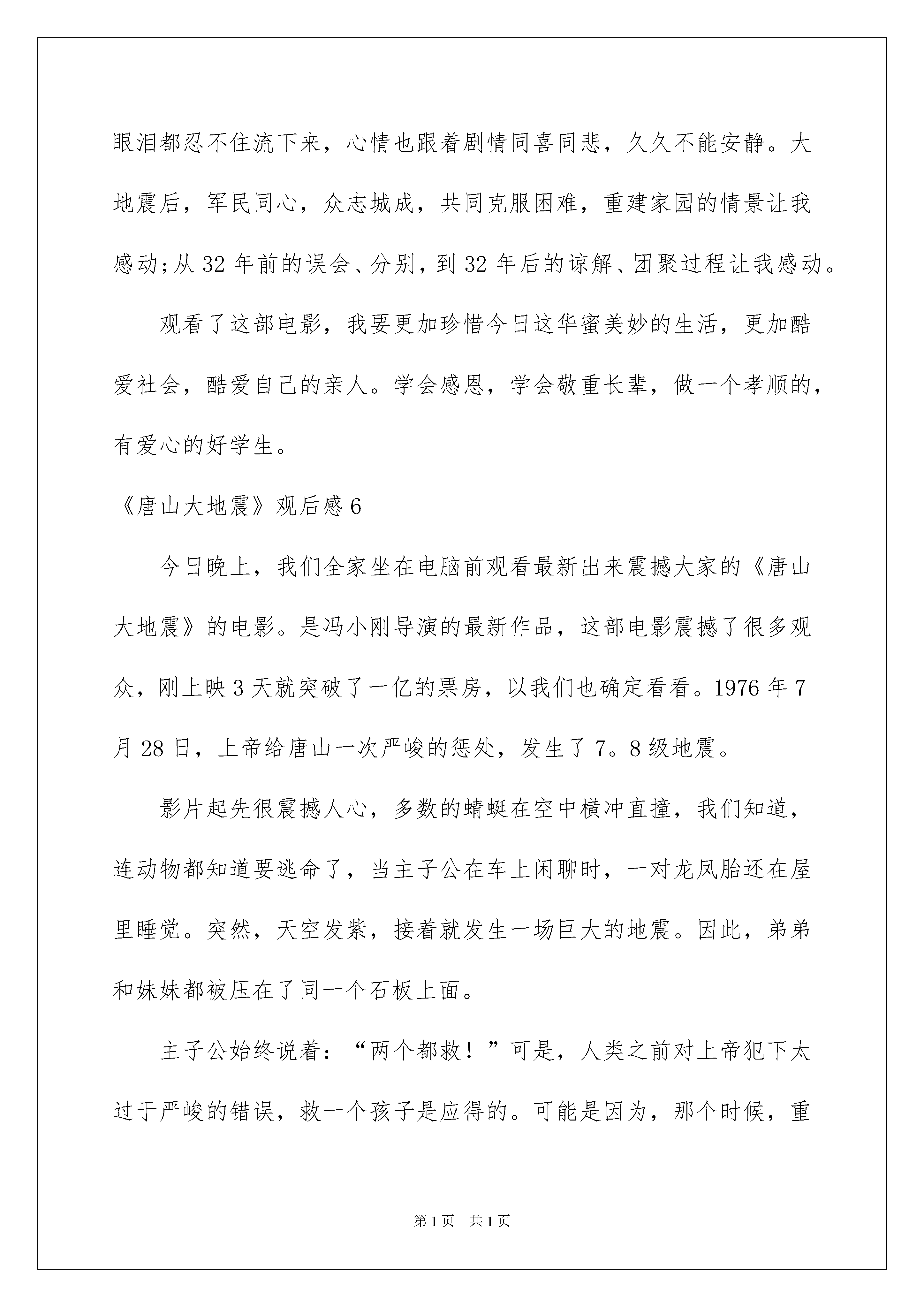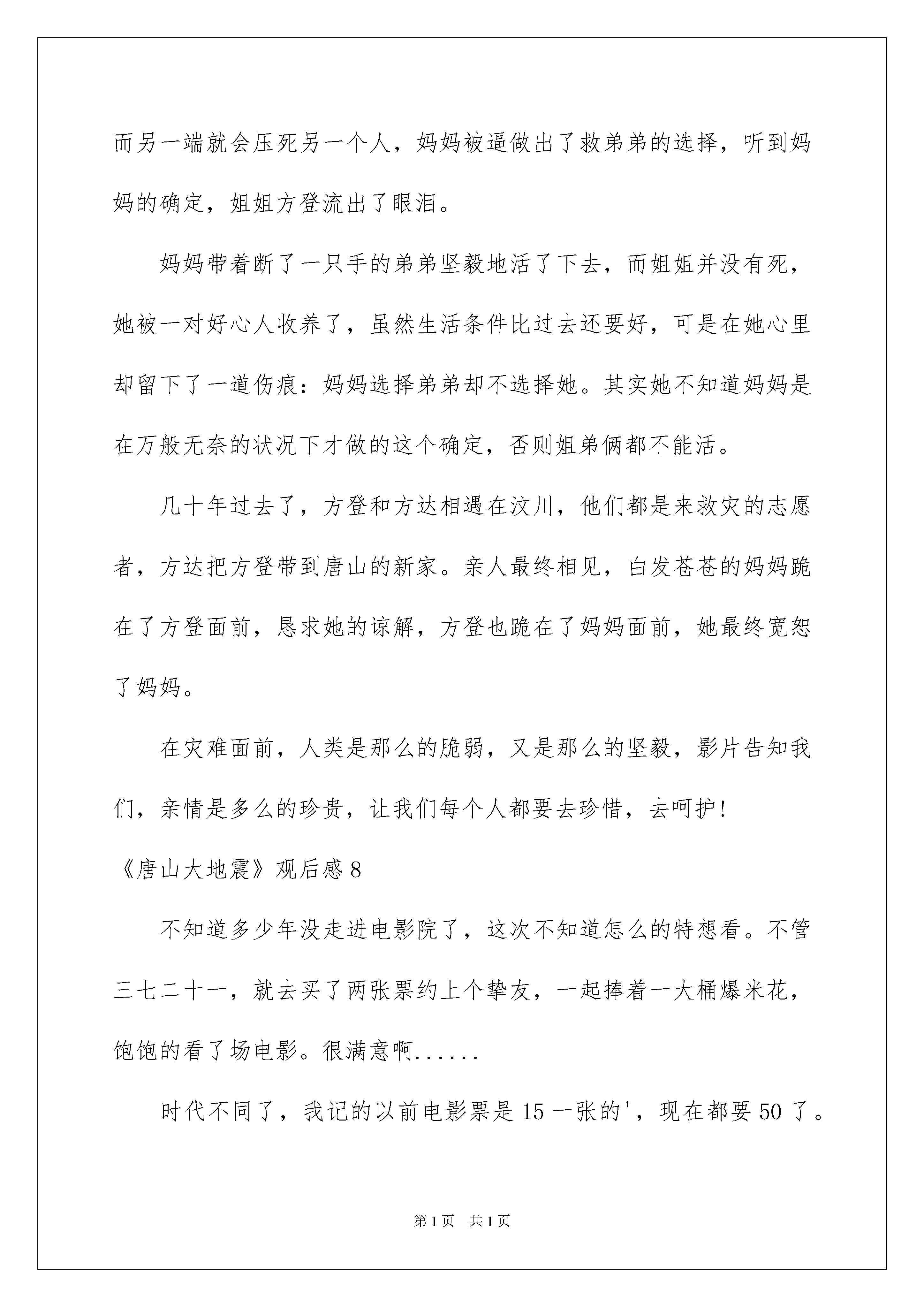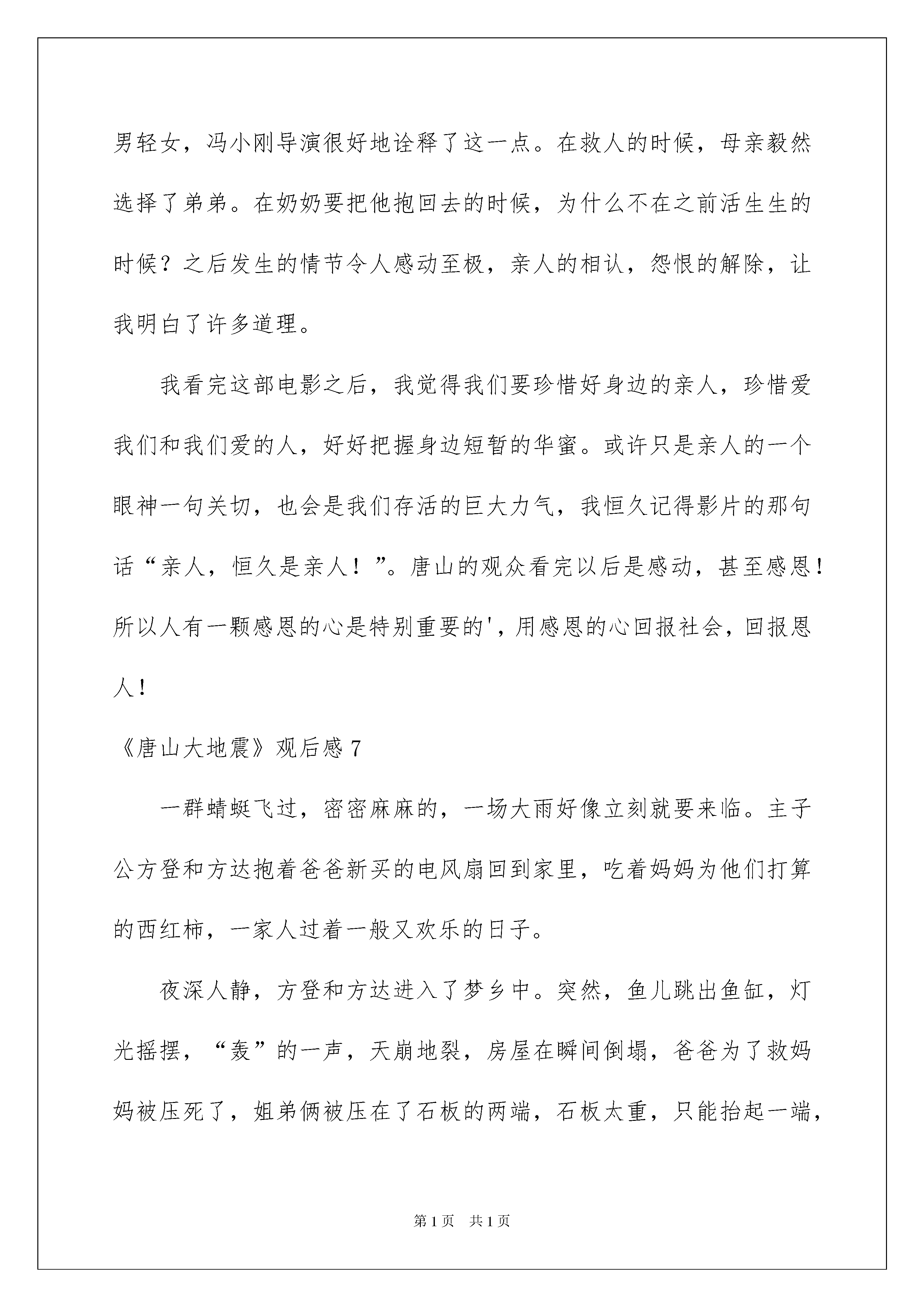 2022唐山大地震观后感唐山大地震观后感看完一部作品以后,对人生或者事物肯定产生了很多感想吧,写一份观后感,记录收获与付出。观后感你想好怎么写了吗?以下是我细心整理的唐山大地震观后感,仅供参考,希望能够帮助到大家。唐山大地震观后感1昨天,我看了电影《唐山大地震》:1976年7月28日,发生于中国唐山的里氏7、8级大地震,造成242769人死亡;本片依据温州张翎的小说《余震》改