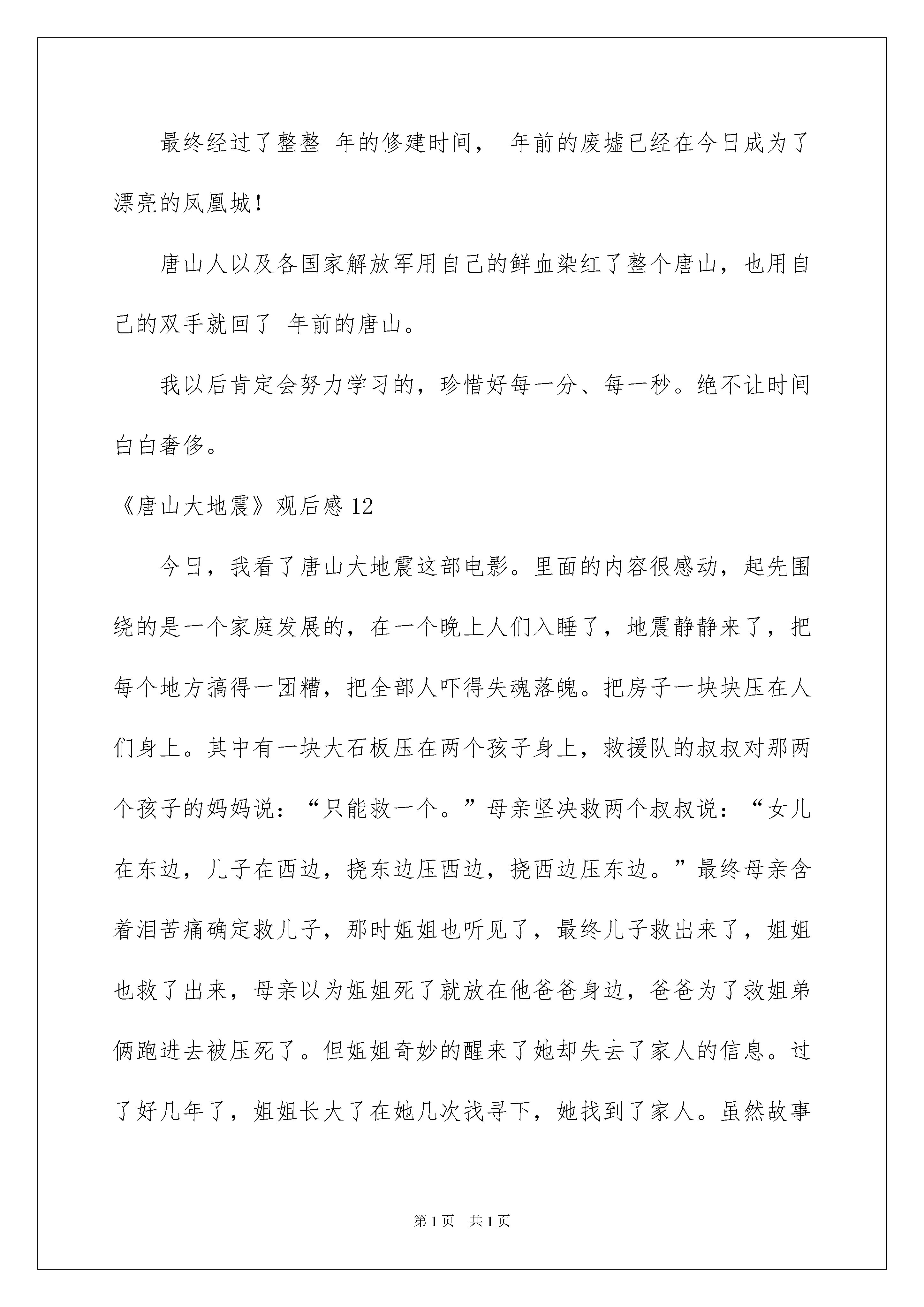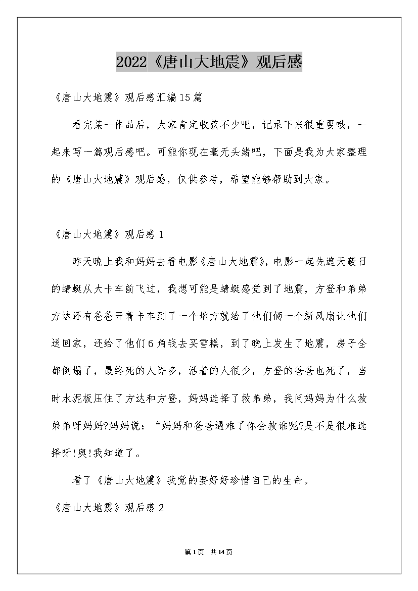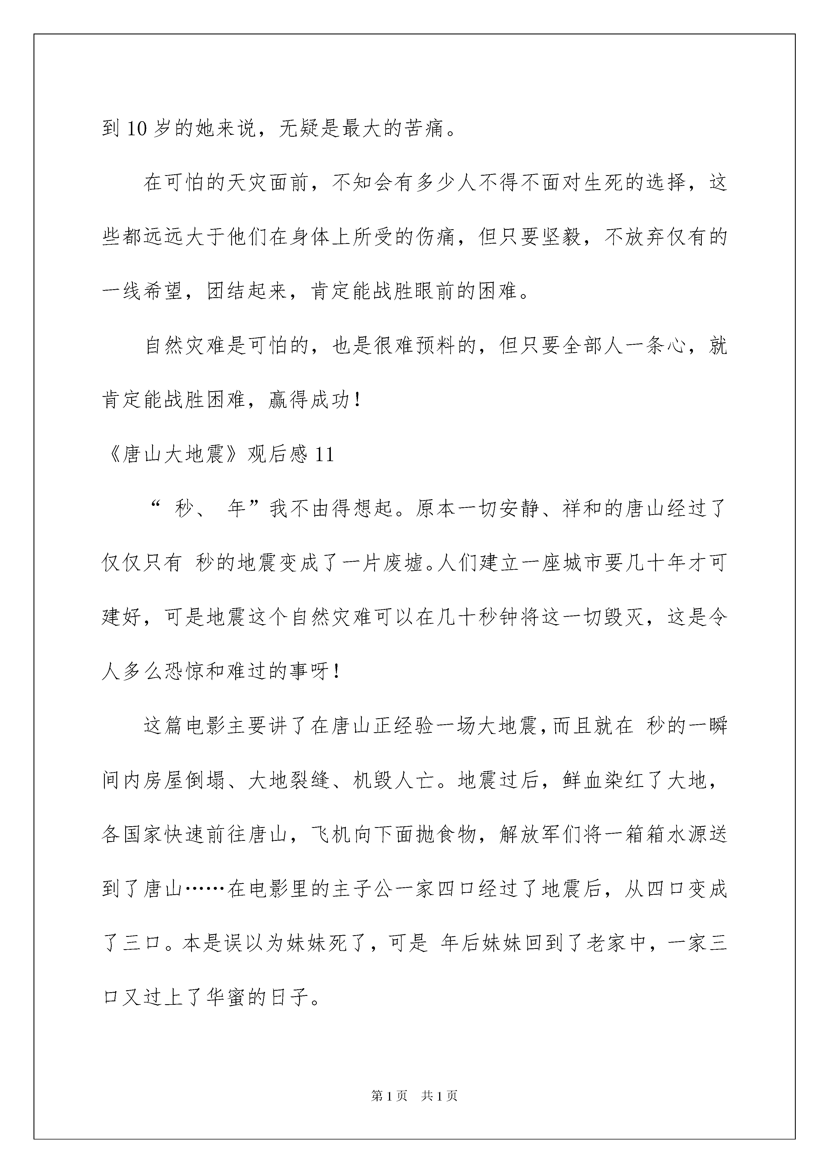 2022《唐山大地震》观后感《唐山大地震》观后感汇编15篇看完某一作品后,大家肯定收获不少吧,记录下来很重要哦,一起来写一篇观后感吧。可能你现在毫无头绪吧,下面是我为大家整理的《唐山大地震》观后感,仅供参考,希望能够帮助到大家。《唐山大地震》观后感1昨天晚上我和妈妈去看电影《唐山大地震》,电影一起先遮天蔽日的蜻蜓从大卡车前飞过,我想可能是蜻蜓感觉到
