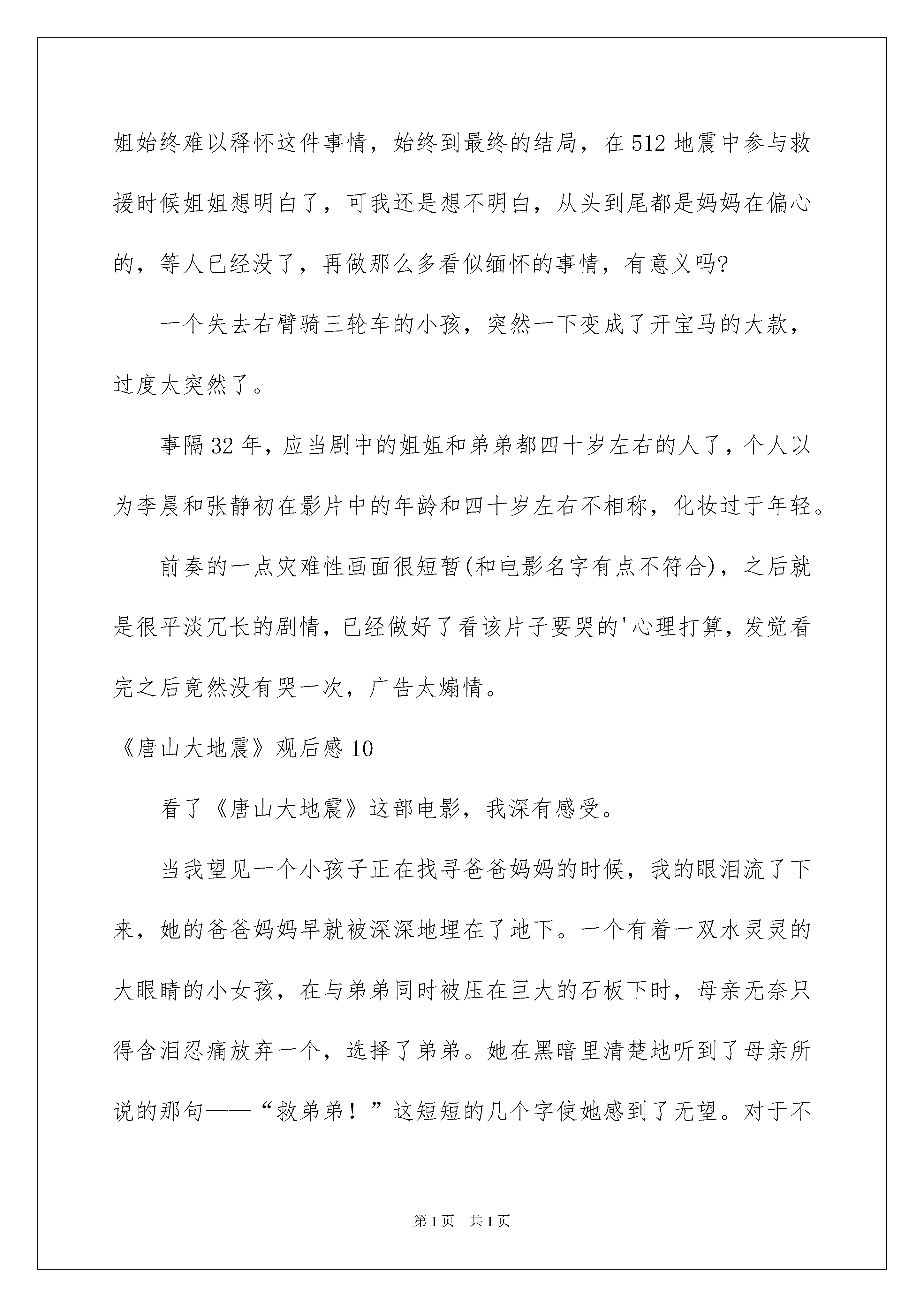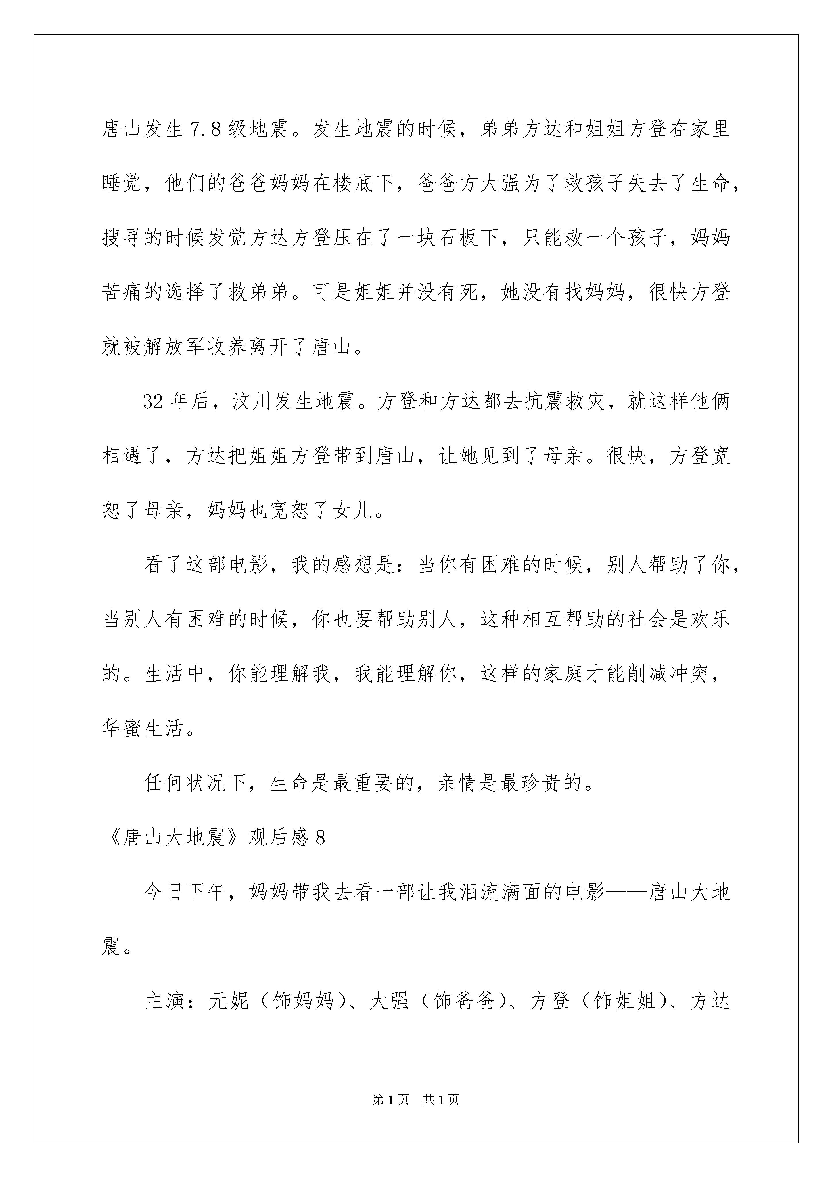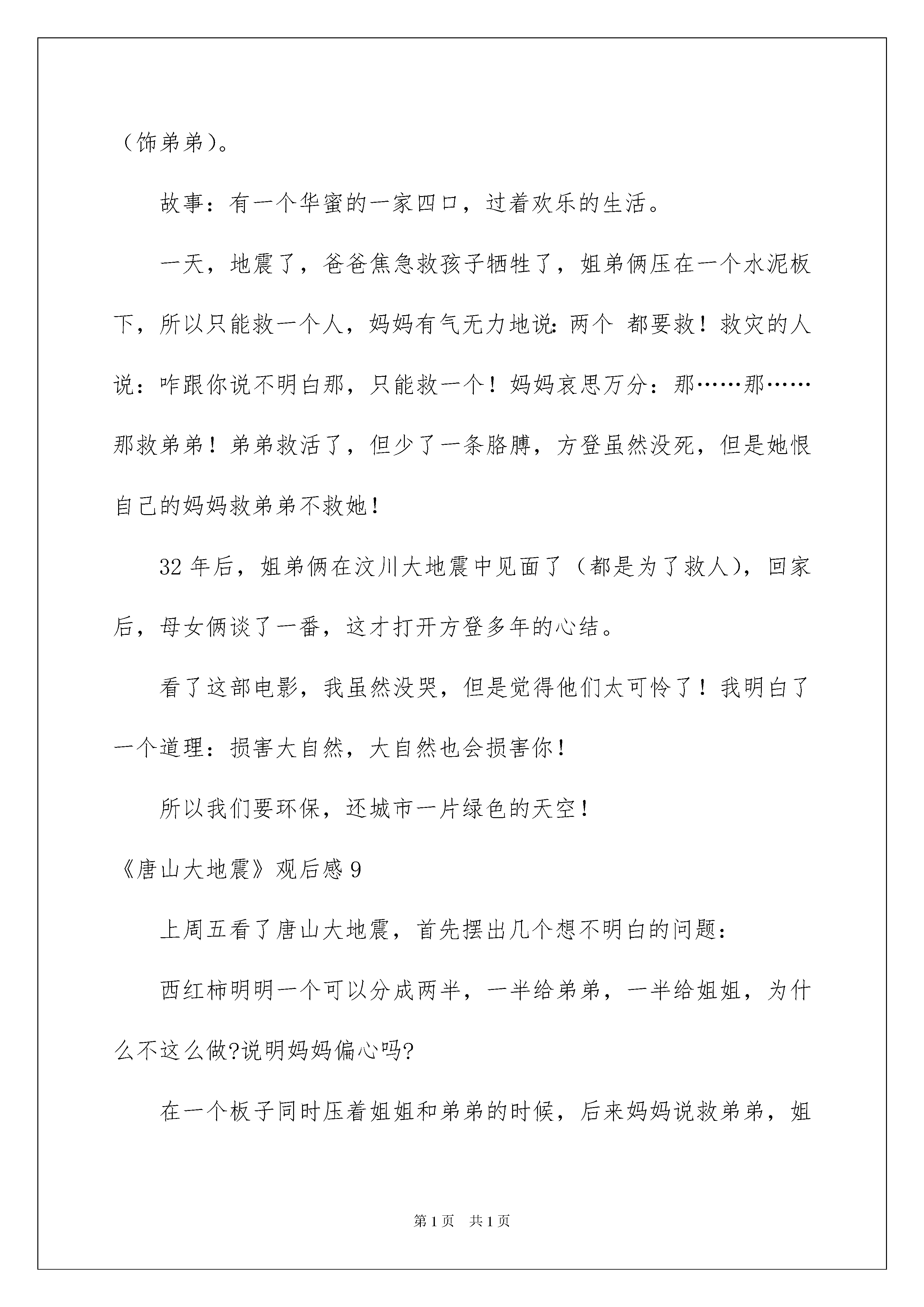 2022《唐山大地震》观后感《唐山大地震》观后感汇编15篇看完某一作品后,大家肯定收获不少吧,记录下来很重要哦,一起来写一篇观后感吧。可能你现在毫无头绪吧,下面是我为大家整理的《唐山大地震》观后感,仅供参考,希望能够帮助到大家。《唐山大地震》观后感1昨天晚上我和妈妈去看电影《唐山大地震》,电影一起先遮天蔽日的蜻蜓从大卡车前飞过,我想可能是蜻蜓感觉到