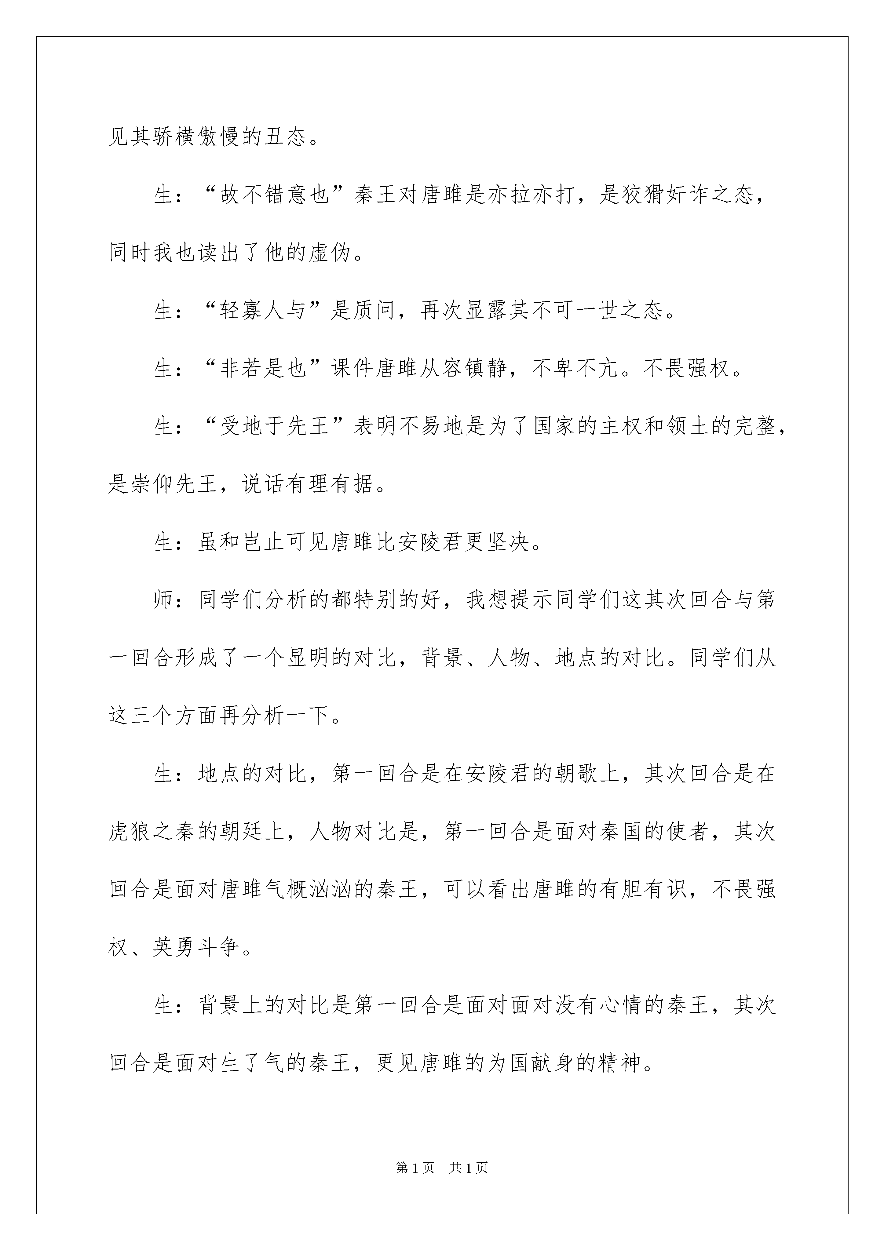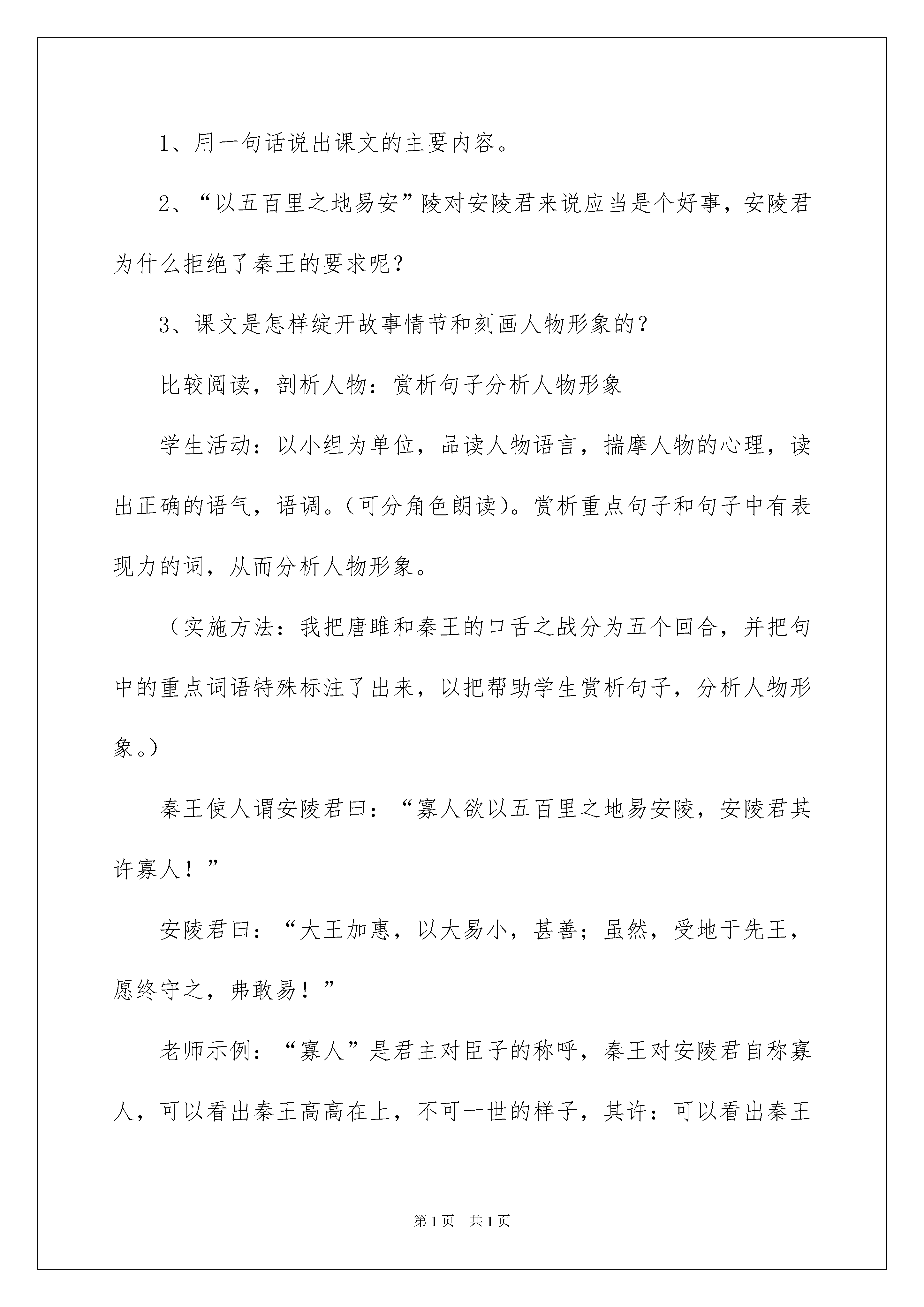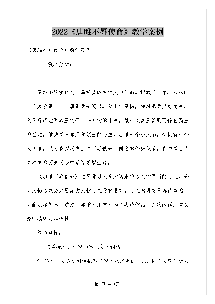 2022《唐雎不辱使命》教学案例《唐雎不辱使命》教学案例教材分析:唐雎不辱使命是一篇经典的古代文学作品。记叙了一个小人物的一个大故事。——唐雎奉安陵君之命出访秦国,面对暴秦英勇无畏、义正辞严地同秦王绽开针锋相对的斗争,最终使秦王折服而保全国土的经过,维护国家尊严和领土的完整。唐雎一个小人物,却拥有一个大故事,成为我国历史上“不辱使命”闻名的外交使节