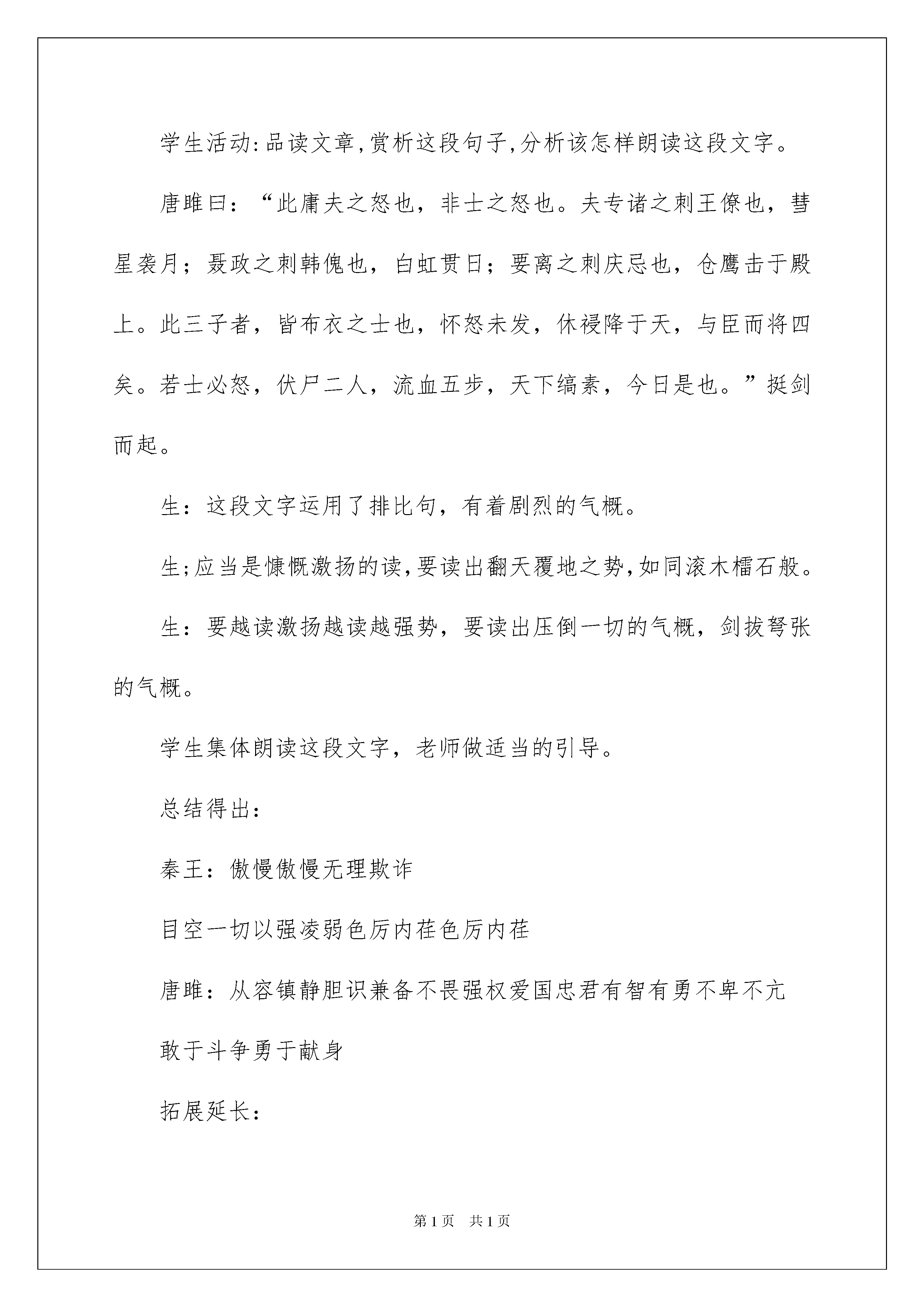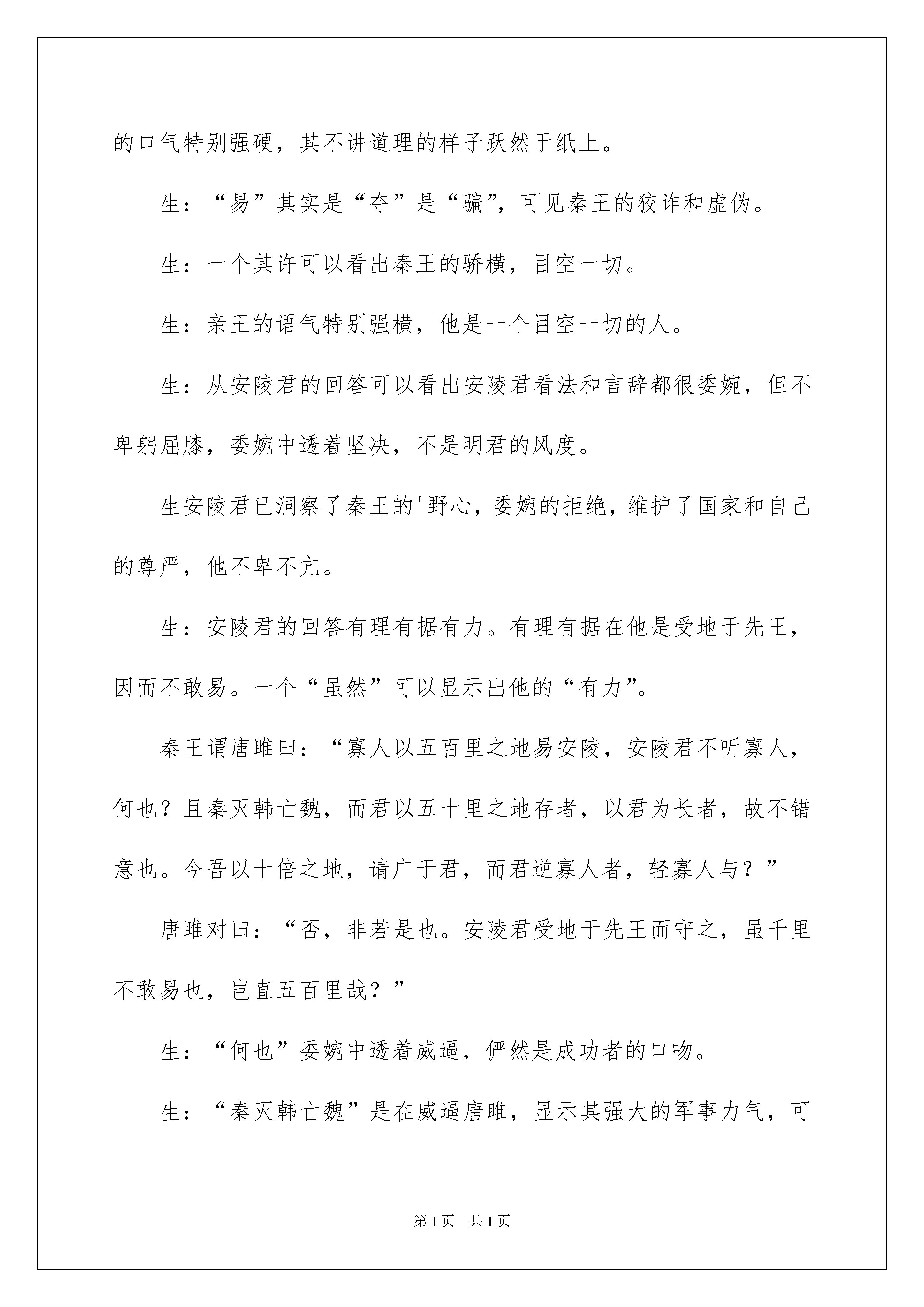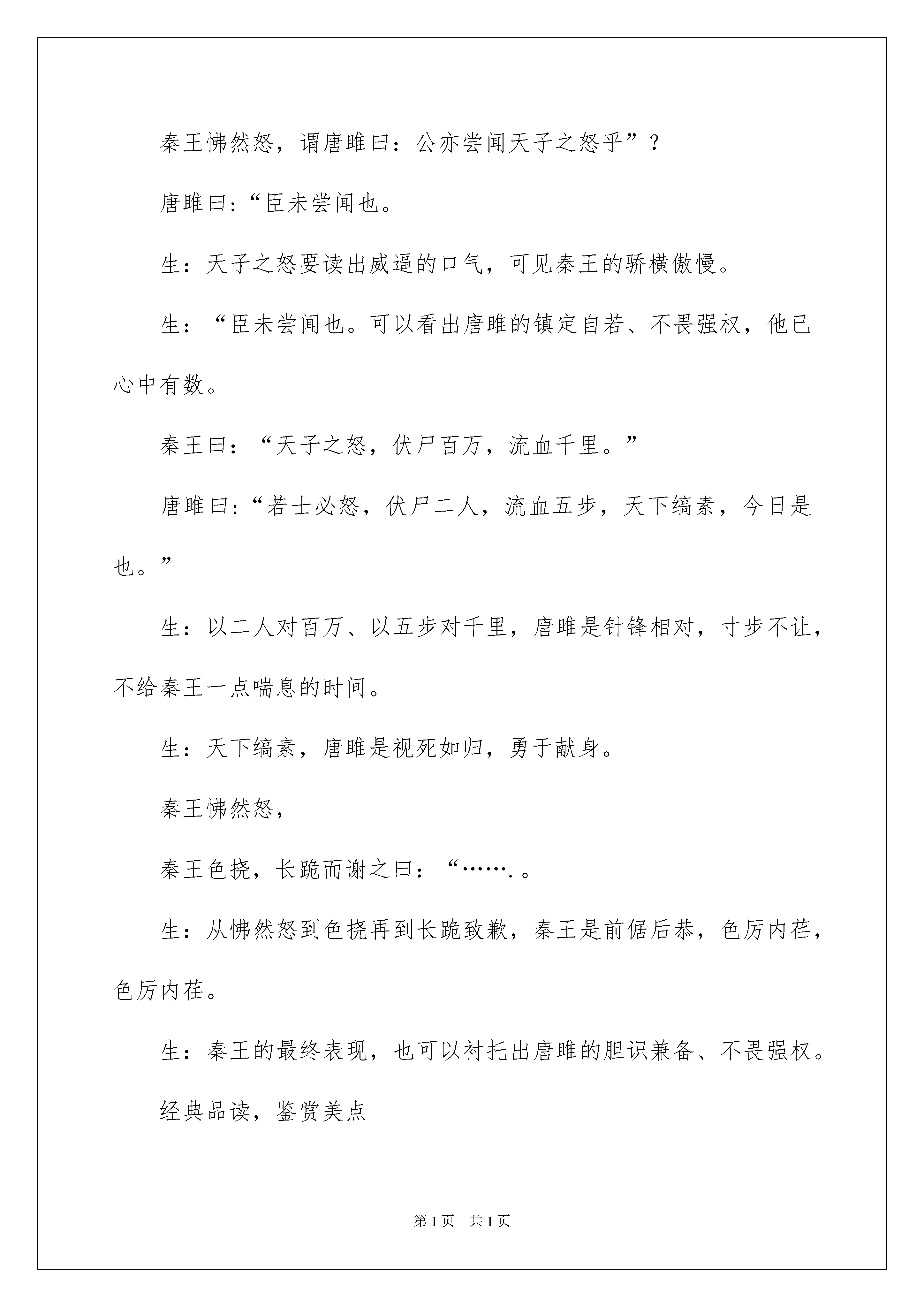 2022《唐雎不辱使命》教学案例《唐雎不辱使命》教学案例教材分析:唐雎不辱使命是一篇经典的古代文学作品。记叙了一个小人物的一个大故事。——唐雎奉安陵君之命出访秦国,面对暴秦英勇无畏、义正辞严地同秦王绽开针锋相对的斗争,最终使秦王折服而保全国土的经过,维护国家尊严和领土的完整。唐雎一个小人物,却拥有一个大故事,成为我国历史上“不辱使命”闻名的外交使节