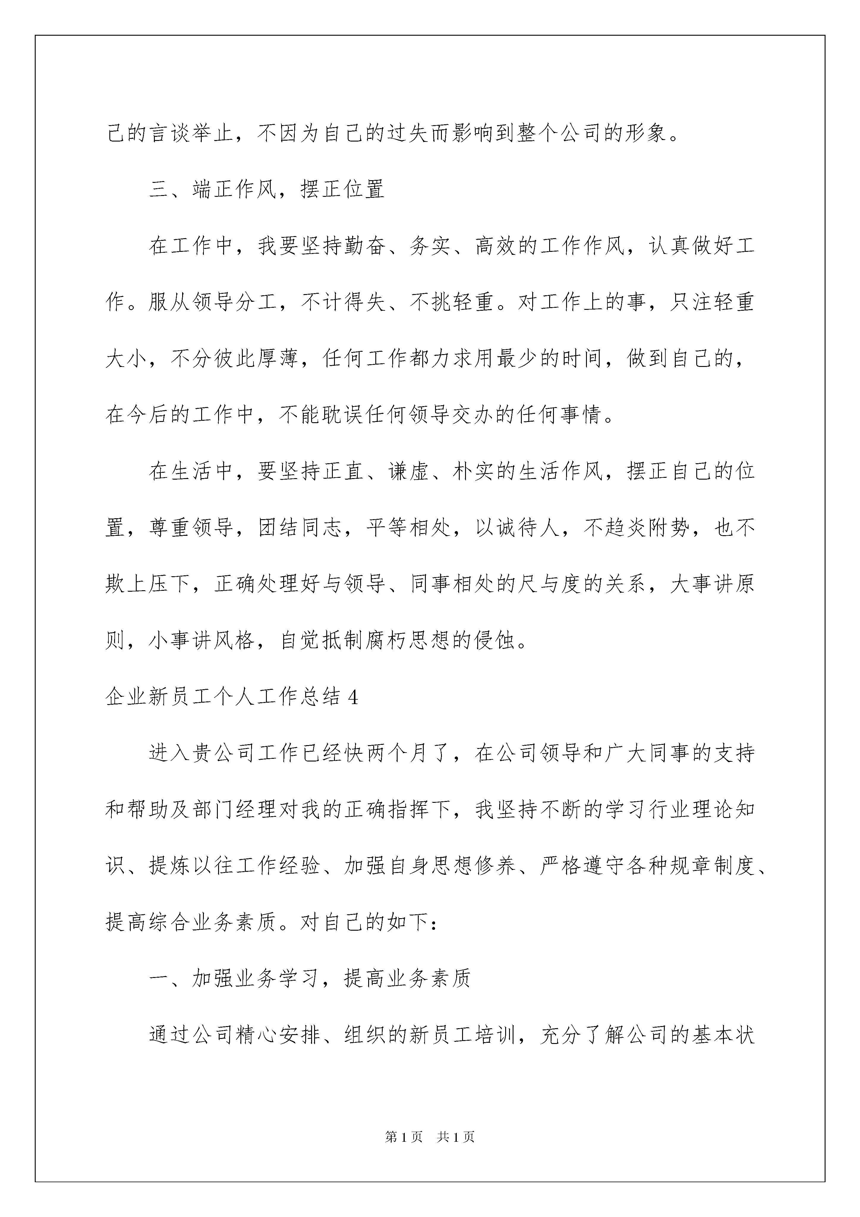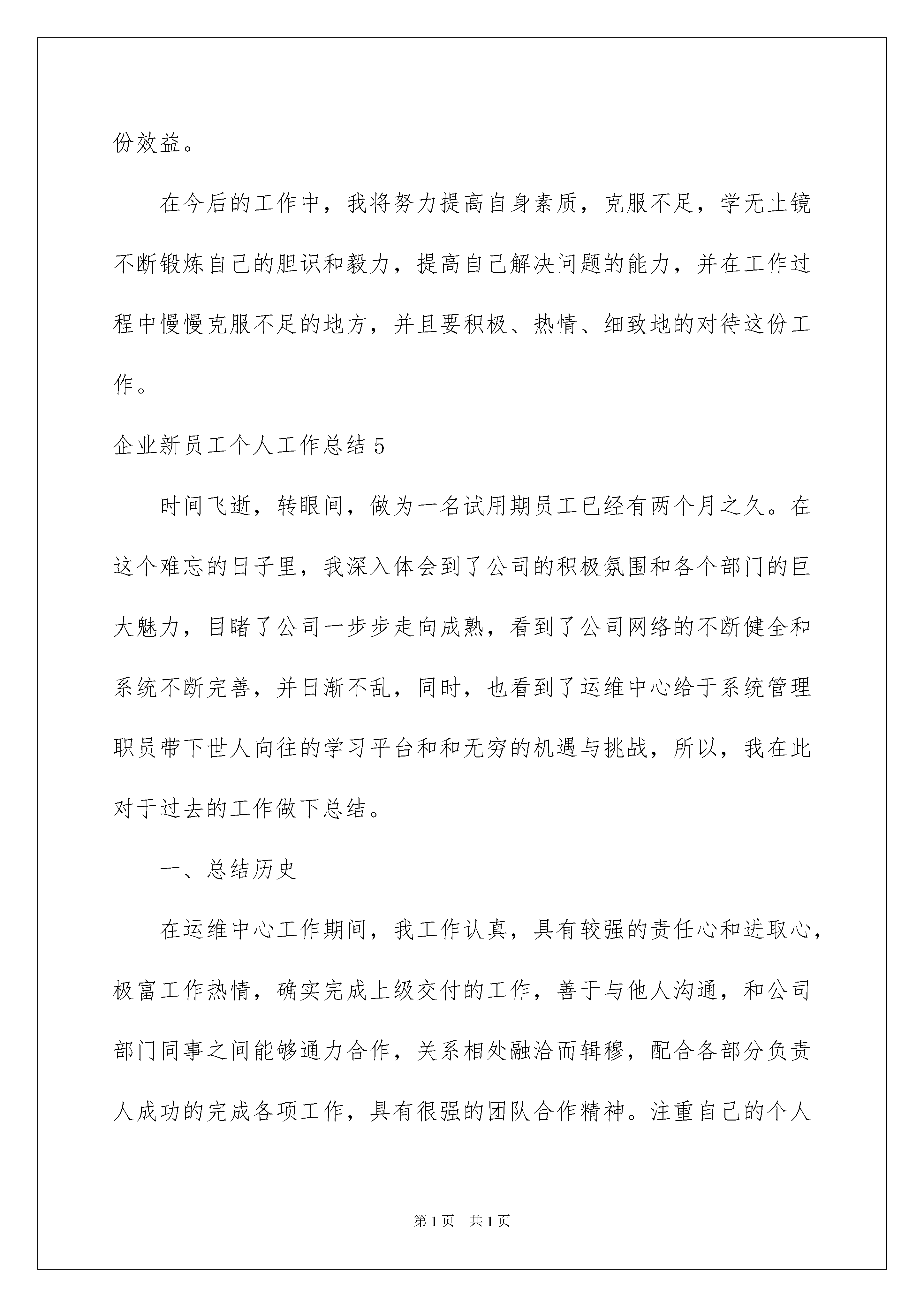 此资料由网络收集而来,如有侵权请告知上传者立即删除。资料共分享,我们负责传递知识。企业新员工个人工作总结企业新员工个人工作总结工作总结是我们每一个员工都要撰写的,我们新员工也是。下面是小编搜集整理的企业新员工个人工作总结,欢迎阅读。更多资讯尽在个人工作总结栏目!企业新员工工作总结结束了四年丰富多彩的大学生活,我憧憬着自己能够进入一个在社会上有地位、受人尊重、有良好发展前景的大企业工作。经过努力,终于圆了自己的梦我获得了贵州电网公司赐予的这一就业机会。在激情似火的七月我怀者激