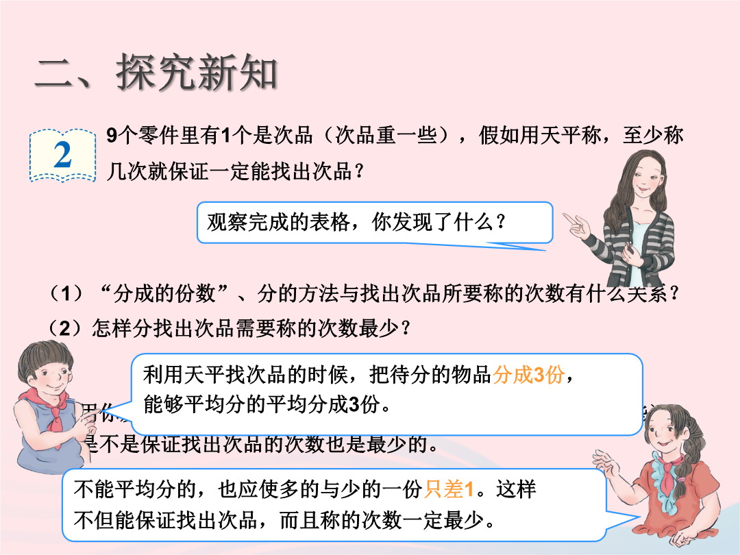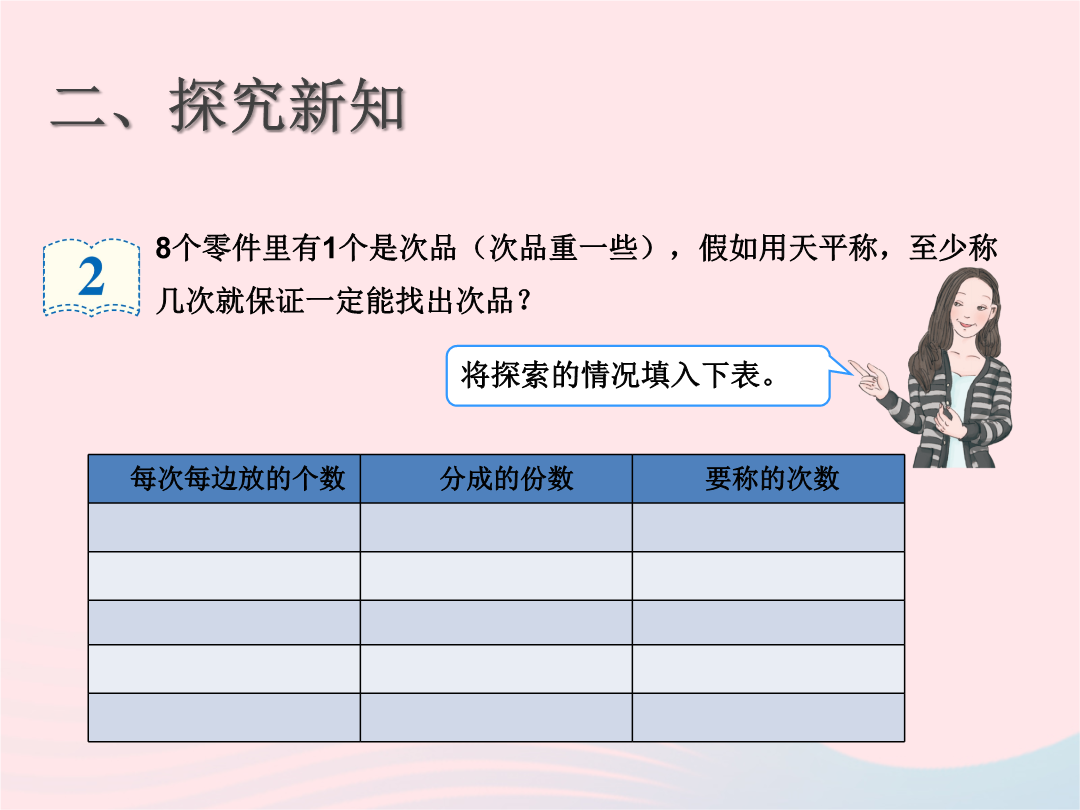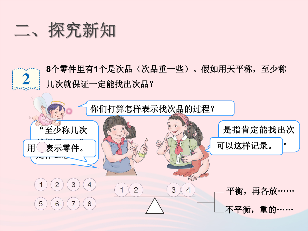 找次品同学们,大家会使用天平吗?如果天平平衡说明什么?二、探究新知二、探究新知8个零件里有1个是次品(次品重一些),假如用天平称,至少称几次就保证一定能找出次品?(1)“分成的份数”、分的方法与找出次品所要称的次数有什么关系?有28瓶水,其中27瓶质量相同,另有1瓶是盐水,比其他的水略重一些。至少称几次能保证找出这瓶盐水?
