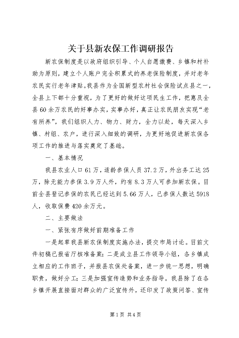 关于县新农保工作调研报告新农保制度是以政府组织引导、个人自愿缴费、乡镇和村补助为原则,建立个人账户完全积累式的养老保险制度,并对老年农民实行老年津贴。我县作为全国新型农村社会保险试点县之一,全县上下都十分重视,为了更好的做好这项民生工作,把惠及全县60余万农民的好事办实,实事办好,真正让农民朋友实现“老有所养”,我们组织人力、物力、财力,全力以赴,每天深入乡镇、村组、农户,进行深入细致的调研,为更好地促进新农保各项工作的推进与落实奠定了基础。一、基本情况我县农业人口61万,适龄参保人员37.2万,外出务工