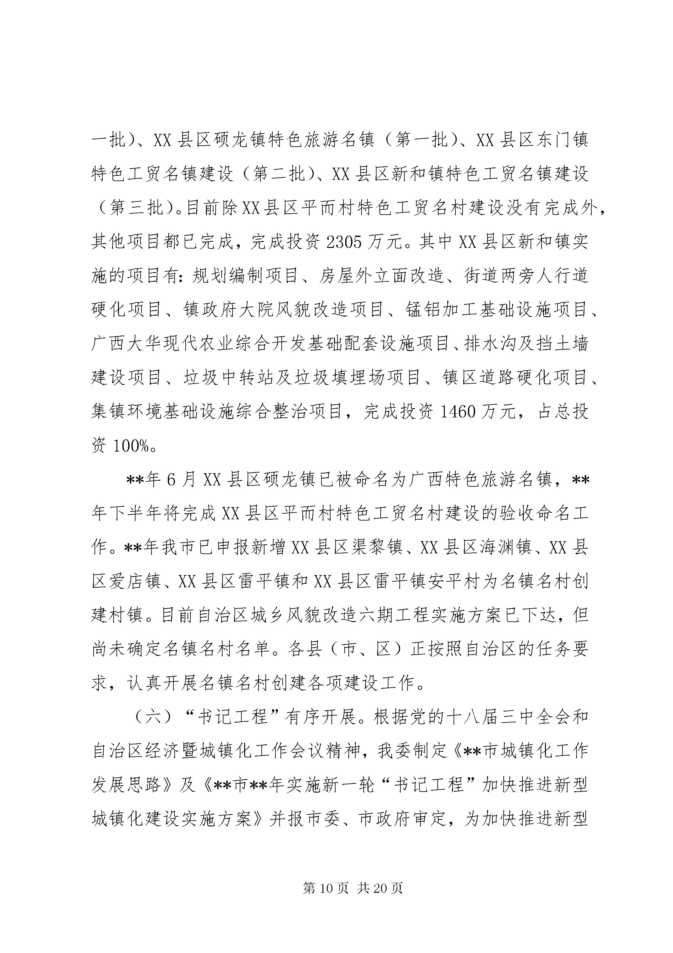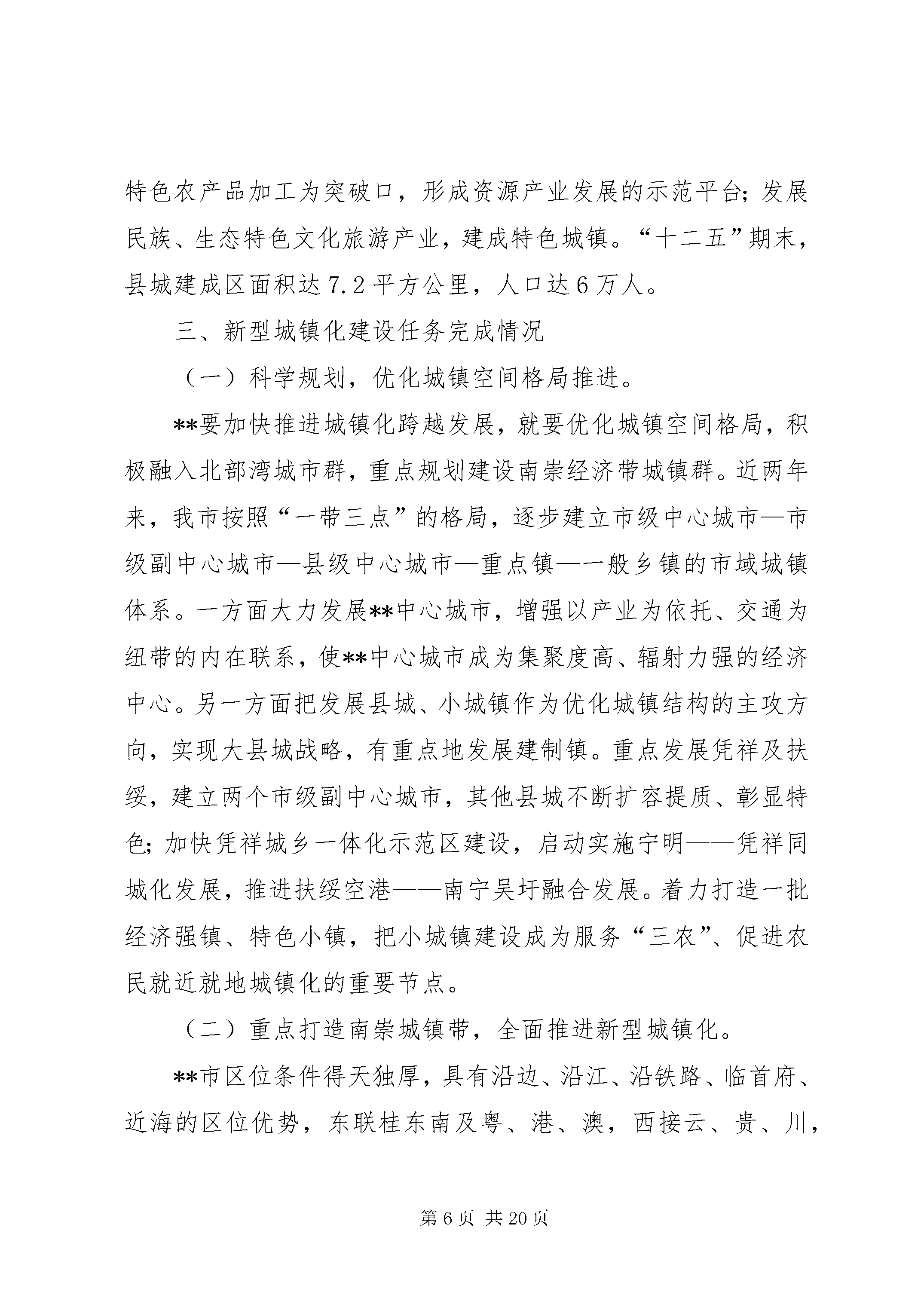 第PAGE\*Arabic\*MERGEFORMAT20页共NUMPAGES\*MERGEFORMAT20页城镇化工作推进情况自查报告为加快推进**市城镇化跨越发展,**市委、市政府根据自治区人民政府《关于加快推进我区城镇化跨越发展的决定》、历年《广西城镇化工作要点》及相关配套文件精神,提出了把**“建成面向东盟开发合作的新高地、成为提升广西沿边开放水平的桥头堡”的战略。今年以来,全市上下围绕建设面向东盟开放合作的新高地目标,按照“特色立城,特色建城,特色兴城”要求,抢抓机遇,狠抓落实,加大城