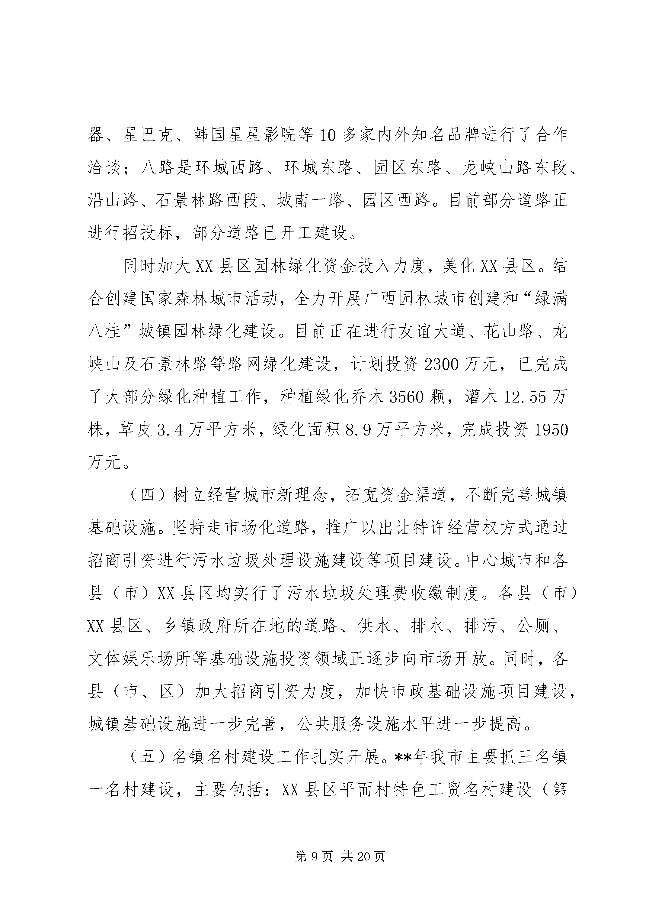 城镇化工作推进情况自查报告为加快推进**市城镇化跨越发展,**市委、市政府根据自治区人民政府《关于加快推进我区城镇化跨越发展的决定》、历年《广西城镇化工作要点》及相关配套文件精神,提出了把**“建成面向东盟开发合作的新高地、成为提升广西沿边开放水平的桥头堡”的战略。今年以来,全市上下围绕建设面向东盟开放合作的新高地目标,按照“特色立城,特色建城,特色兴城”要求,抢抓机遇,狠抓落实,加大城乡基础设施建设投入,认真研究制定具体工作措施,改善、保障民生,加快推进城镇化进程,实现城市建设科学发展、和谐发展、跨越发