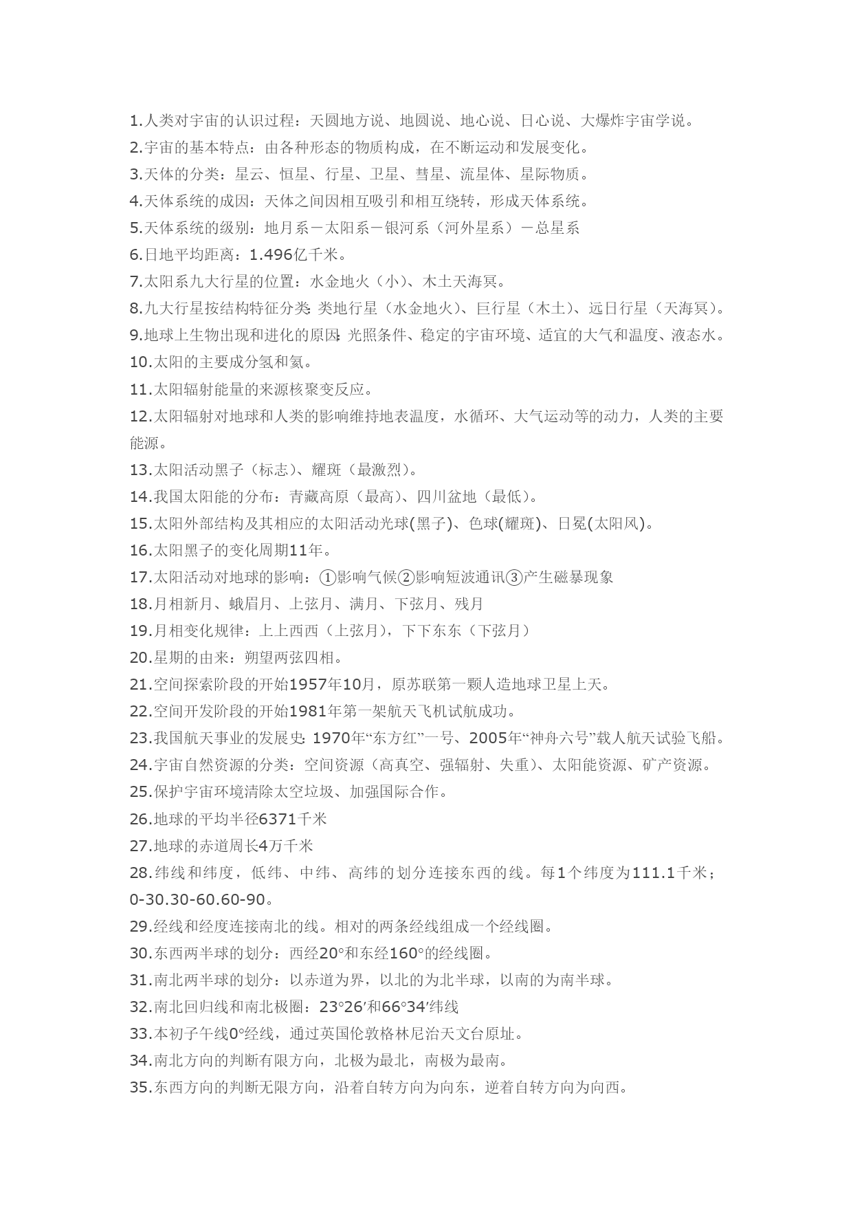 1.人类对宇宙的认识过程:天圆地方说、地圆说、地心说、日心说、大爆炸宇宙学说。2.宇宙的基本特点:由各种形态的物质构成,在不断运动和发展变化。3.天体的分类:星云、恒星、行星、卫星、彗星、流星体、星际物质。4.天体系统的成因:天体之间因相互吸引和相互绕转,形成天体系统。5.天体系统的级别:地月系-太阳系-银河系(河外星系)-总星系6.日地平均距离:1.496亿千米。7.太阳系九大行星的位置:水金地火(小)、木土天海冥。8.九大行星按结构特征分类:类地行星(水金地火)、巨行星(木土)、远日行星(天海冥)。9