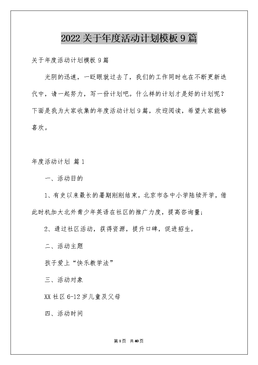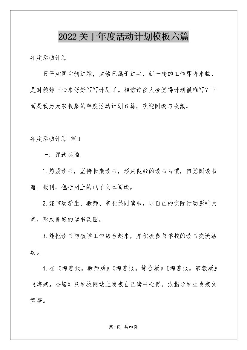 2022关于年度活动计划模板六篇年度活动计划日子如同白驹过隙,成绩已属于过去,新一轮的工作即将来临,是时候静下心来好好写写计划了。相信许多人会觉得计划很难写?下面是我为大家收集的年度活动计划6篇,欢迎阅读与收藏。年度活动计划篇1一、评选标准1.热爱读书,坚持长期读书,形成良好的读书习惯,自觉阅读书籍、报刊,包括网上的电子文本阅读。2.能带动学生、教师、家长共同读书,以自己的实际行动影响大家,形成良好的读书氛围。3.能把读书与教学工作结合起来,并积极参与学校的读书交流活动。4.在《海燕报。教师版》《海燕报。综合版》《海燕报。家教版》《海燕。杏坛》及学校网站上发表自己读书心得,或指导学生发表文章等。5.有自己的博客。6.个人藏书不少于200册;每年购书不少于15册。7.在市级以上(含市级)报刊杂志发表文章,或者指导学生发表文章。二、评选办法1.各级部(处室)各推荐2名教师参加学校初评。2.参评教师填写“十佳读书人物”推荐表。3.提交材料:教师本人发表或获奖的文章(20xx年以来,最多5篇),指导学生撰写的文章(20xx年以来,最多10篇)。4.20xx年的读书笔记或者随笔感悟等证明自己读书的相关资料。5.个人藏书照片。6.评选结果公示3天,最后给予表彰。(另外,各级部(处室)要发现新人才;去年荣获“十佳读书人物”的老师也可以参加今年的评选,除按照以上办法参加评选外,还要提交一年来的读书总结。)三、奖励措施荣获本届“年度十佳读书人物”的教师,自行购书专业书籍(可含部分人文性书籍)200元以上,学校报销200元(在20xx年3月30日前凭购书发票办理)。四、评选材料上交时间:20xx年1月18日前。年度活动计划篇2为了让我院广大师生认识到吸烟的危害,使吸烟者为了自己和他人的健康而丢掉手中的香烟,武汉工交职业学院青年志愿者协会特面向全院开展并宣传无烟活动。一、活动参与对象:全院师生二、活动安排:1、5月23日5月25日青协各分会出海报对活动进行宣传。2、5月26日进行签名和问卷调查活动。3、关于世界无烟日调查问卷共300份,调查结(20xx年商场促销活动方案)果由秘书处统计、调查结果于5月30日、31日进行公布。三、活动要求:各分会必须积极参与、服从安排、大力配合院青年志愿者协会总会的签名、宣传活动,所有参与活动的志愿者要佩带会员证、戴会帽。四、奖励方法:对积极配合总会,认真组织活动的分会,将按协会评比条例予以加分20xx年度世界无烟日主题活动方案活动方案附:活动具体分配及负责人情况1、宣传期:5月23日~5月25日分会会长负责,总会统一协调。2、签名活动:5月26日联络部负责(包括各分会联络部成员,机电系5人、汽运系5人、计算机系4、光电系2人、管理系3人、艺术设计系2人、环化系2人)3、问卷调查:5月26日秘书处负责人员安排,各分会报4~6名会员参加(名单于23日前上报)。具体分配以当日安排为准。4、调查结果统计:5月27日~5月29日进行,由秘书处负责,其他部门协助。5月30日~5月31日进行公布。年度活动计划篇3一、指导思想以“研究”为先导,以“创新教研”为手段,以“新课程”为中心,以学生为本,以质量为魂,以课堂教改为中心,结合低段语文教研组全体教师的教研实际,为教师营造良好的教研氛围,为学生提供广阔有趣的语文学习空间。二、工作重点:1.认真学习,不断提升教学底蕴:深入学习、领会《课程标准》。坚持参加市内外教研活动,外出进修的教师应及时将新的信息在教研活动时进行反馈、交流。鼓励教师多读书,常交流,积极撰写反思。2.加强备课:教师认真记录“备课自查记载表”,每2周1次上交备课组长。3.加强课堂教学研究:教研组发挥集体智慧,群策群力,做好宁波教坛新秀评比教师的练兵工作。以学校教育教学展示月活动为契机,开展系列活动,反映学校教学教研成果。4.开展丰富多彩的受学生欢迎的教育教学活动,为学生创建展示自己的舞台,扎实开展有实效的学科竞赛;继续加强课外阅读习惯的培养,开展“买一本读六本”活动,并初步探索课外阅读的评价途径;与德育融合,展开“欢乐中国年,童心迎奥运”主题系列活动。5.常抓不懈,加强教研组、备课组建设:①教研组、备课组活动定时,定点,定主要内容,定中心发言人。教研组活动时间:(每周四下午二、三两节课)②教研组活动要在“实”字上下功夫,在“研”字上求发展,使教研活动经常化、专题化和规范化。③充分发挥备课组力量,各备课组内开展1—2次同课异构活动。6.积极参与校第三届教师基本功竞赛,切实提高老师们的专业素质。三、工作安排:二月份1、1——3年级语文教师制定好本学期的教学计划,超周