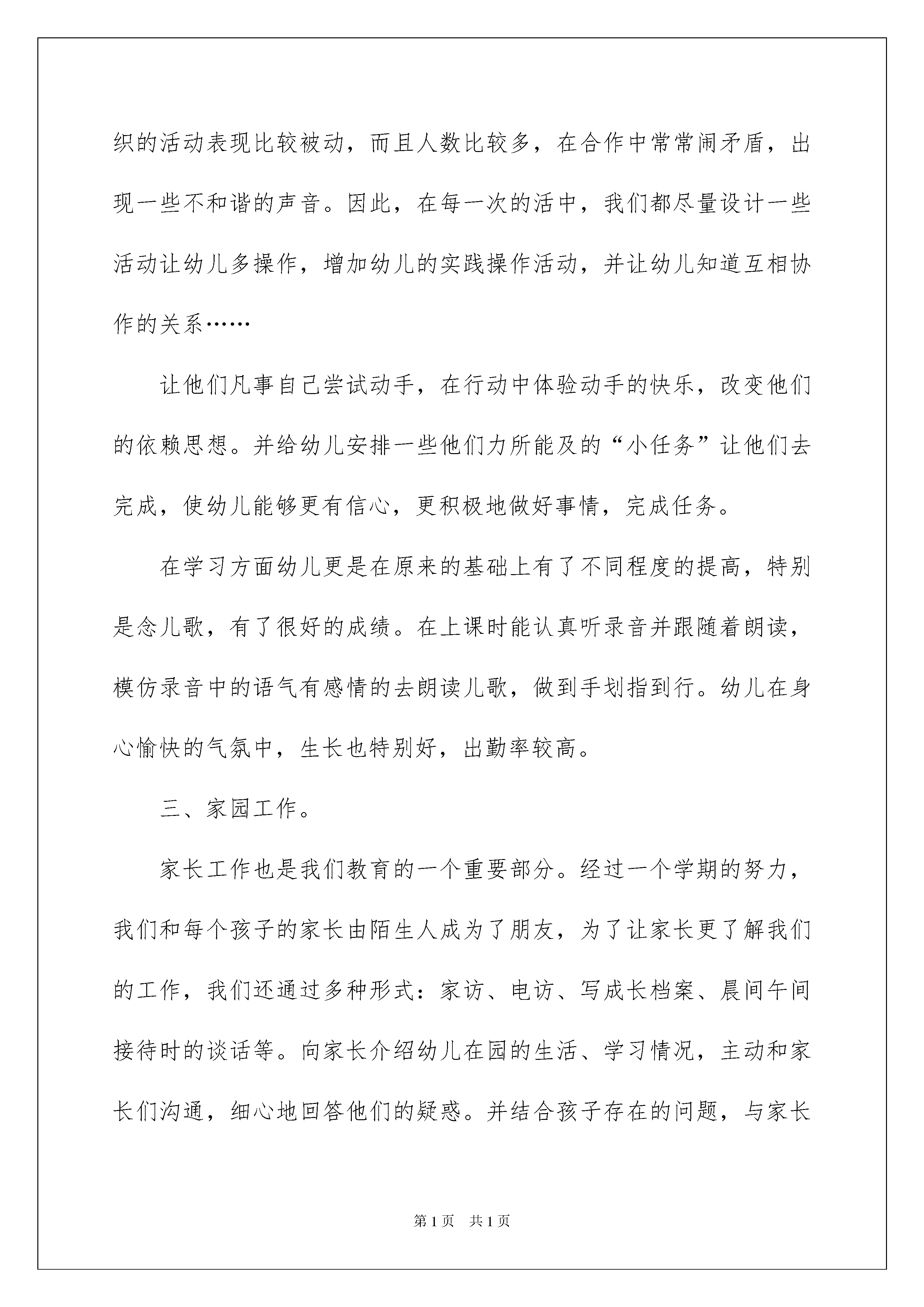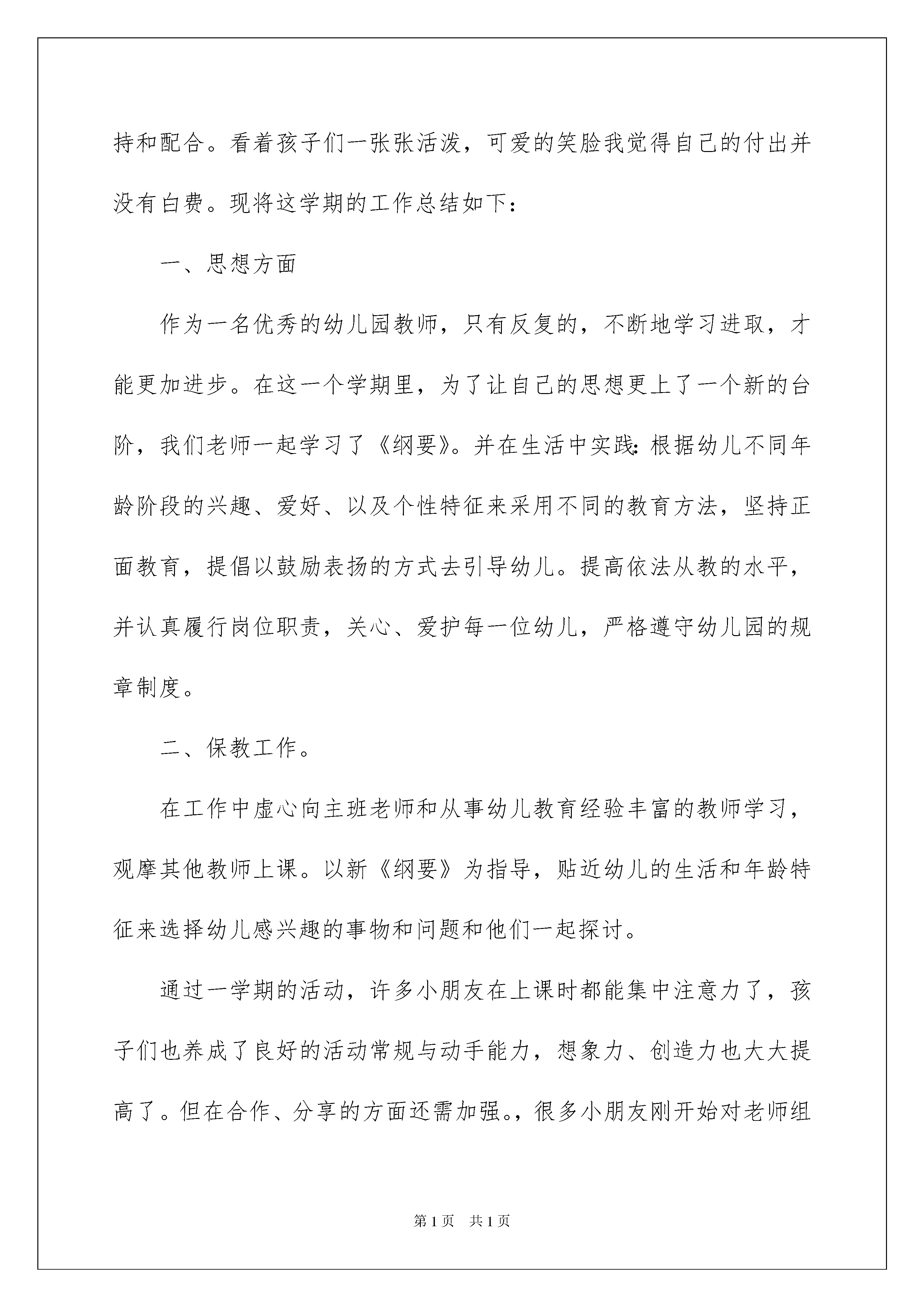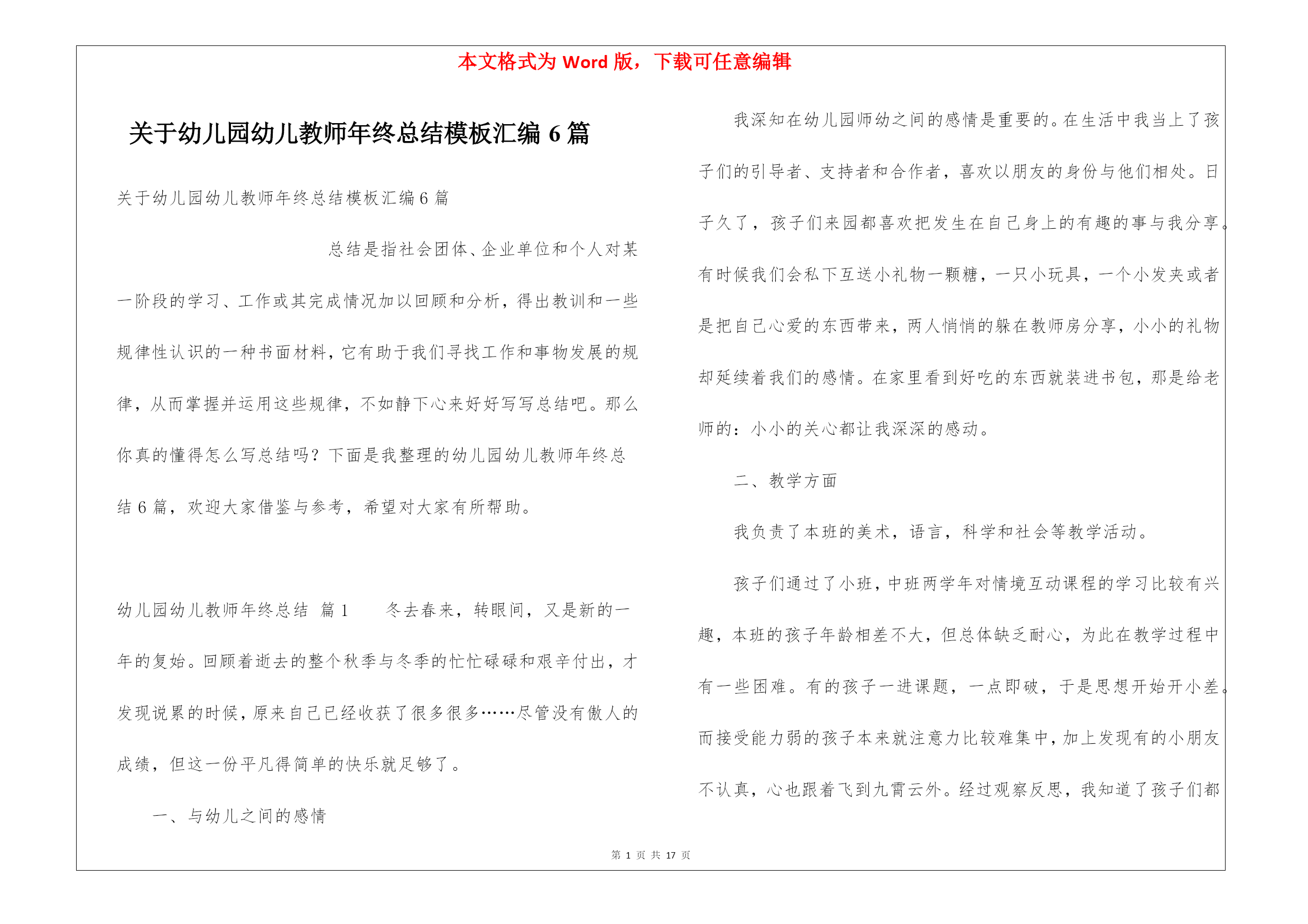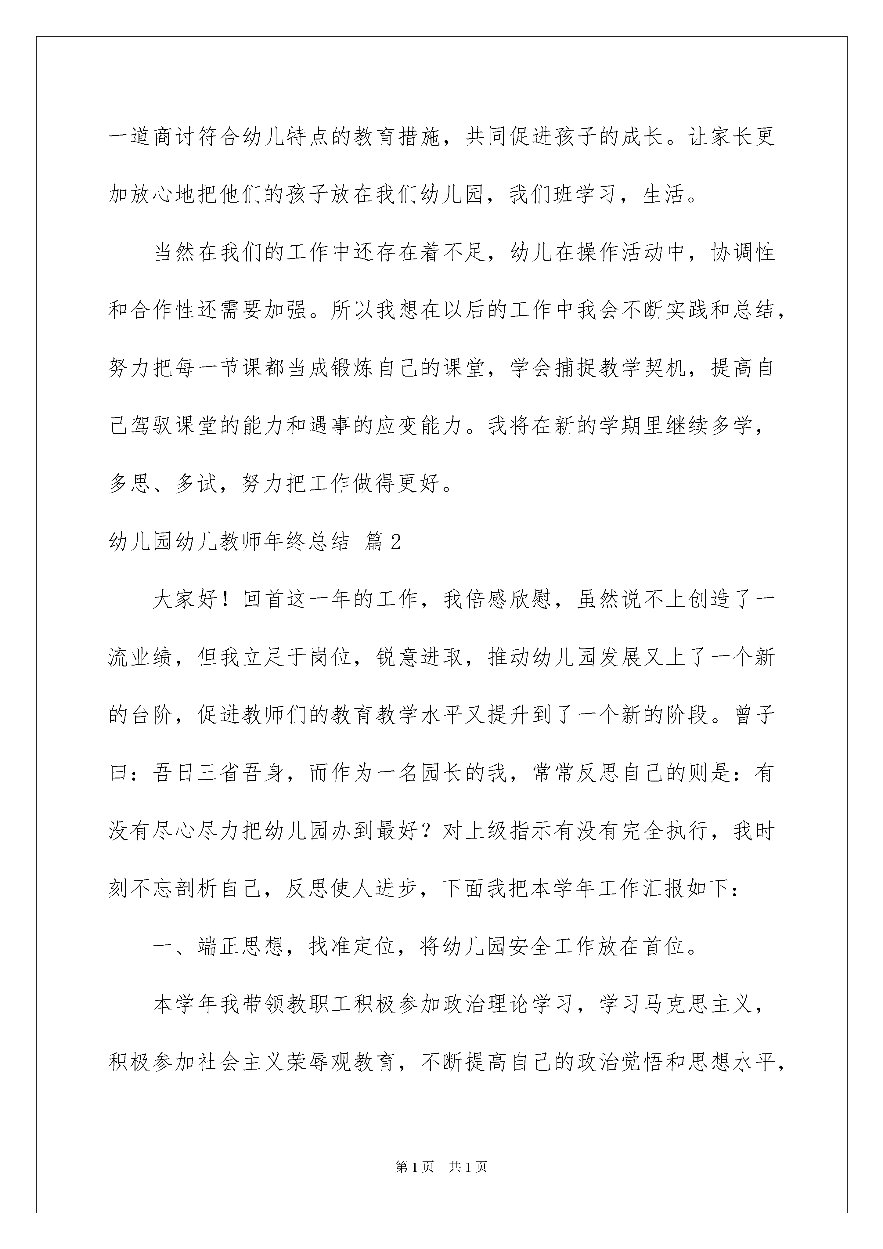 本文格式为Word版,下载可任意编辑第PAGE\*MERGEFORMAT17页共NUMPAGES\*MERGEFORMAT17页关于幼儿园幼儿教师年终总结模板汇编6篇关于幼儿园幼儿教师年终总结模板汇编6篇总结是指社会团体、企业单位和个人对某一阶段的学习、工作或其完成情况加以回顾和分析,得出教训和一些规律性认识的一种书面材料,它有助于我们寻找工作和事物发展的规律,从而掌握并运用这些规律,不如静下心来好好写写总结吧。那么你真的懂得怎么写总结吗?下面是我整理的幼儿园幼儿教师年终总结6篇,欢迎大家借鉴