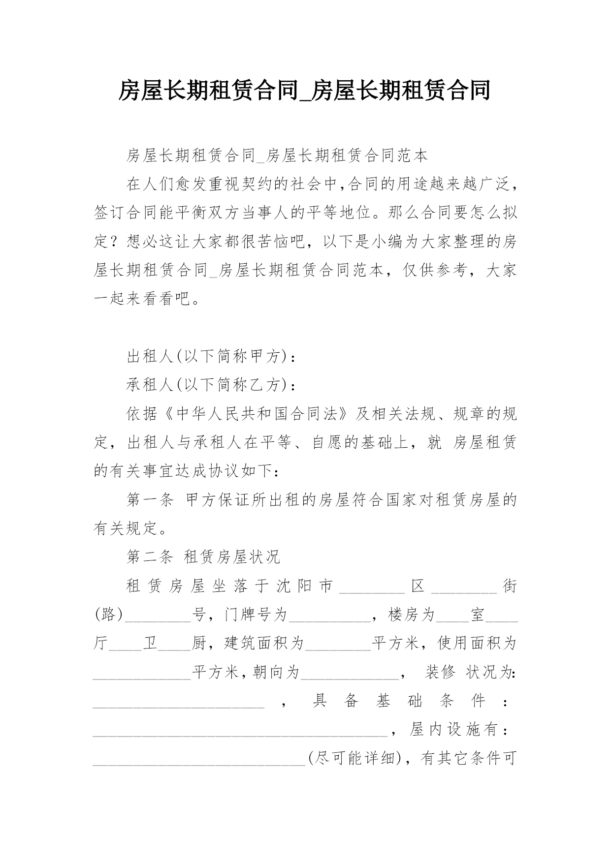 房屋长期租赁合同_房屋长期租赁合同出租人(以下简称甲方):承租人(以下简称乙方):依据《中华人民共和国合同法》及相关法规、规章的规定,出租人与承租人在平等、自愿的基础上,就房屋租赁的有关事宜达成协议如下:第一条甲方保证所出租的房屋符合国家对租赁房屋的有关规定。第二条租赁房屋状况租赁房屋坐落于沈阳市________区________街(路)________号,门牌号为__________,楼房为____室____厅____卫____厨,建筑面积为________平方米,使用面积为____________平方