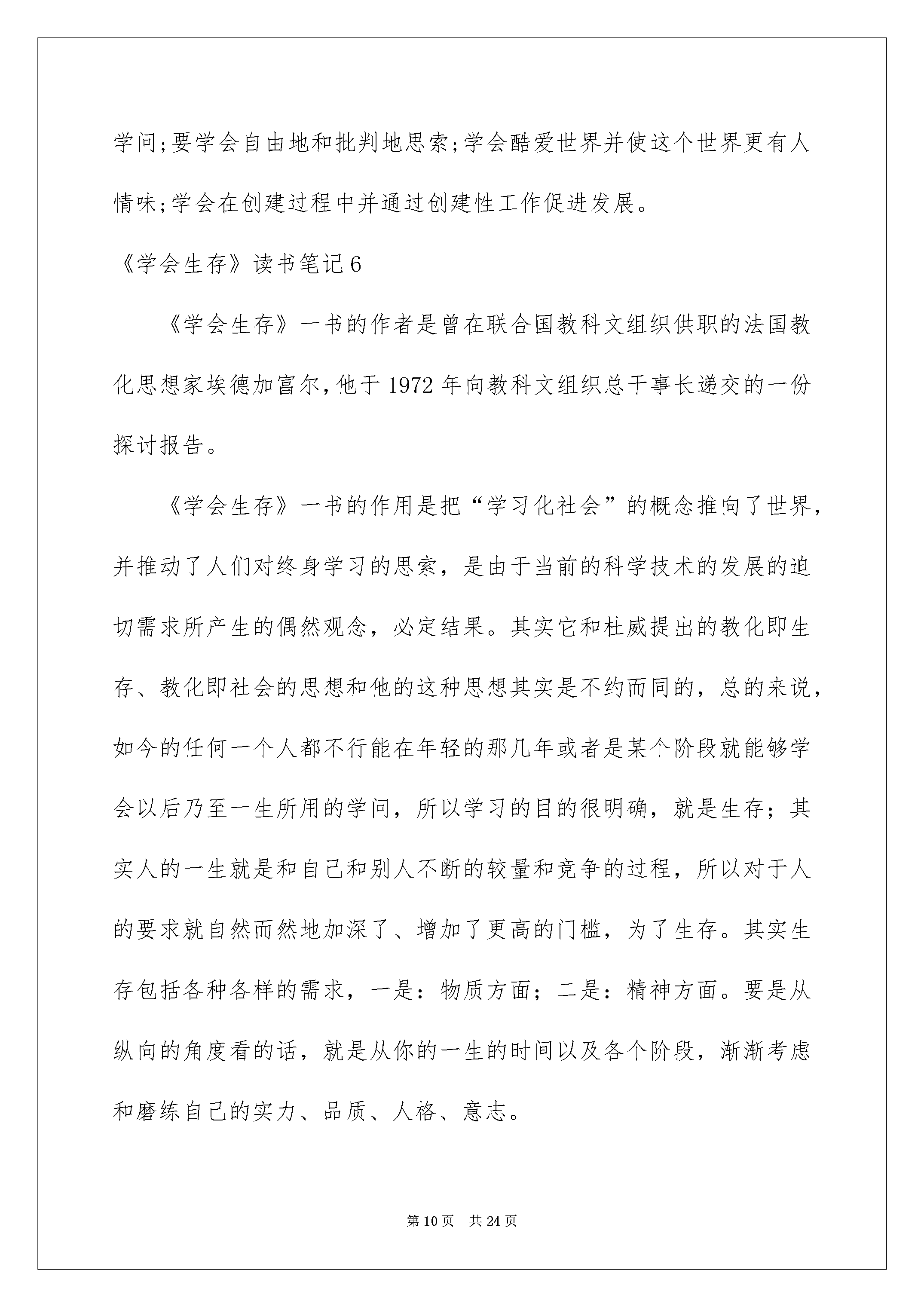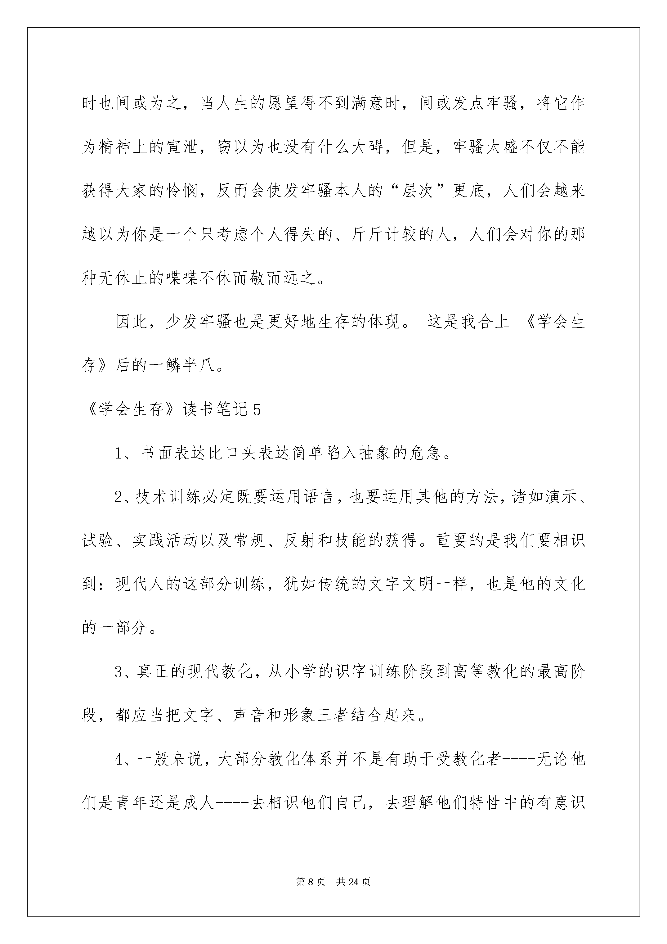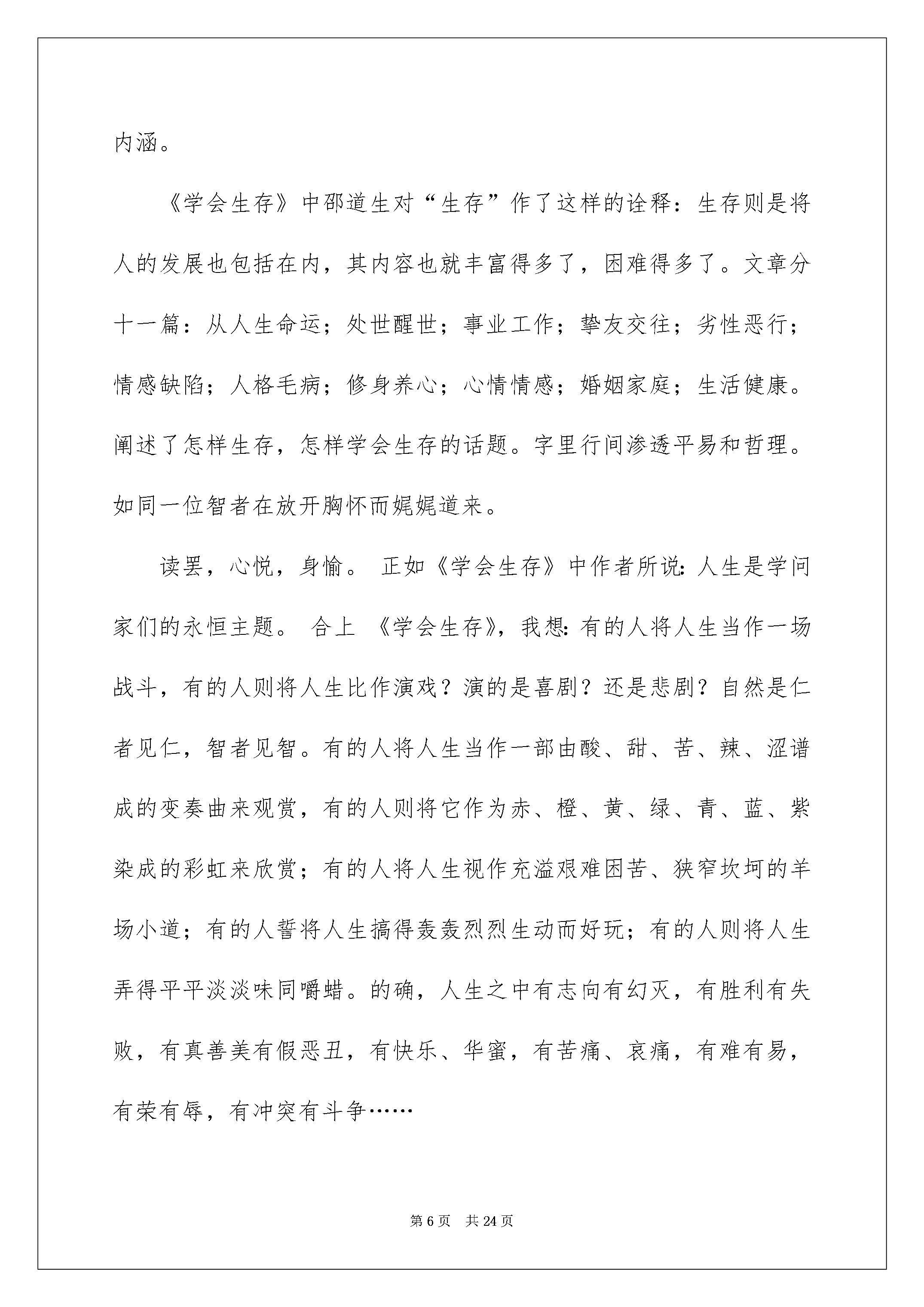 2022《学会生存》读书笔记《学会生存》读书笔记当品读完一部作品后,大家心中肯定是萌生了不少心得,现在就让我们写一篇走心的读书笔记吧。你想好怎么写读书笔记了吗?以下是我为大家整理的《学会生存》读书笔记,欢迎大家借鉴与参考,希望对大家有所帮助。《学会生存》读书笔记1“学会生存”包括三个层面的意思。一是学会维持生活的学问与技能。这包括就业前接受教化和就