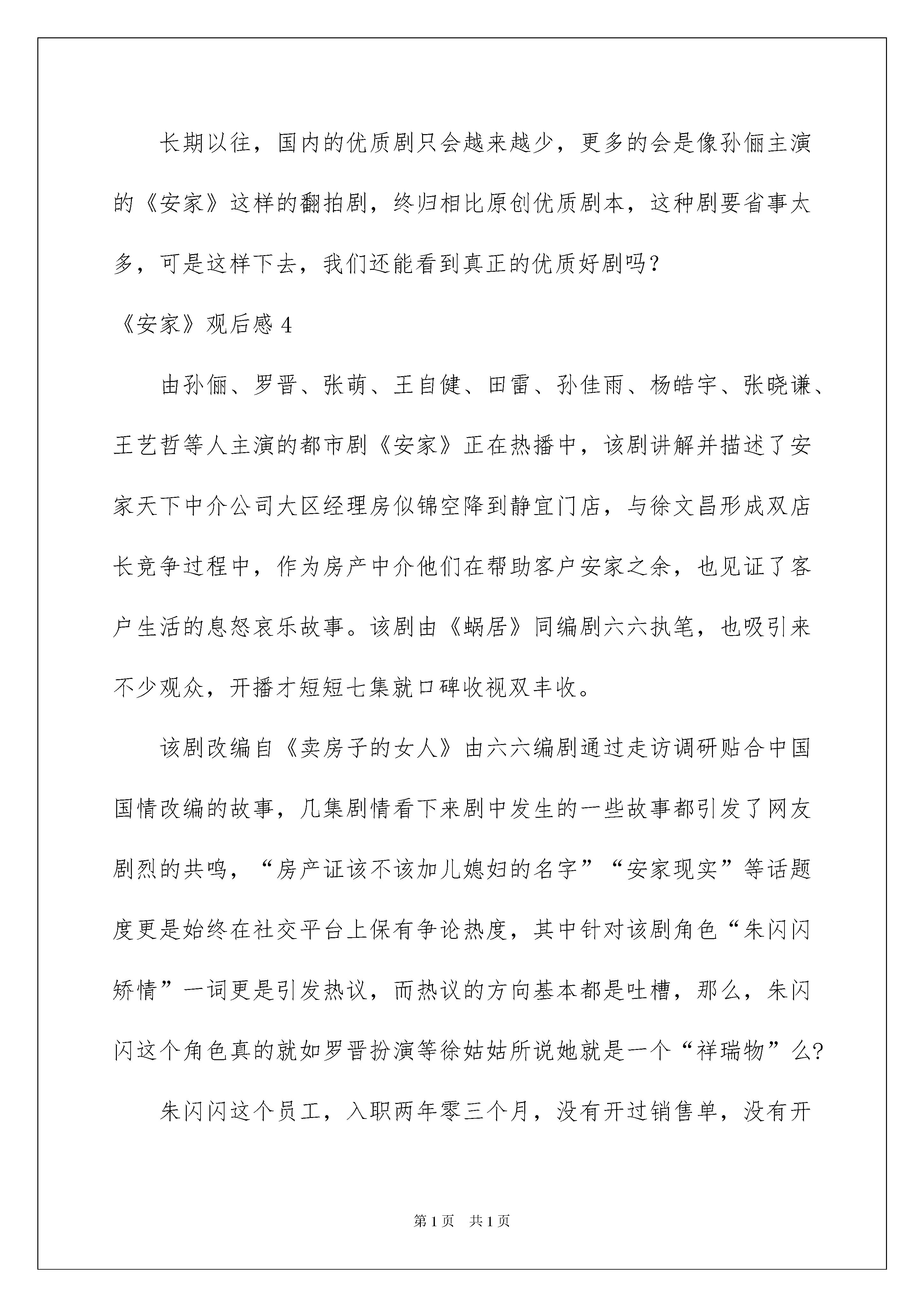 2022《安家》观后感《安家》观后感15篇仔细品尝一部作品后,想必你有不少可以共享的东西,须要回过头来写一写观后感了。可能你现在毫无头绪吧,下面是我整理的《安家》观后感,欢迎大家共享。《安家》观后感1《安家》观看的过程中,竟然不经意哭了几次,有点泪点低吧,可是也是有缘,《安家》的女主角房似锦是家中排行老四,我在家中也是排行老四,所不同的是,比房似锦