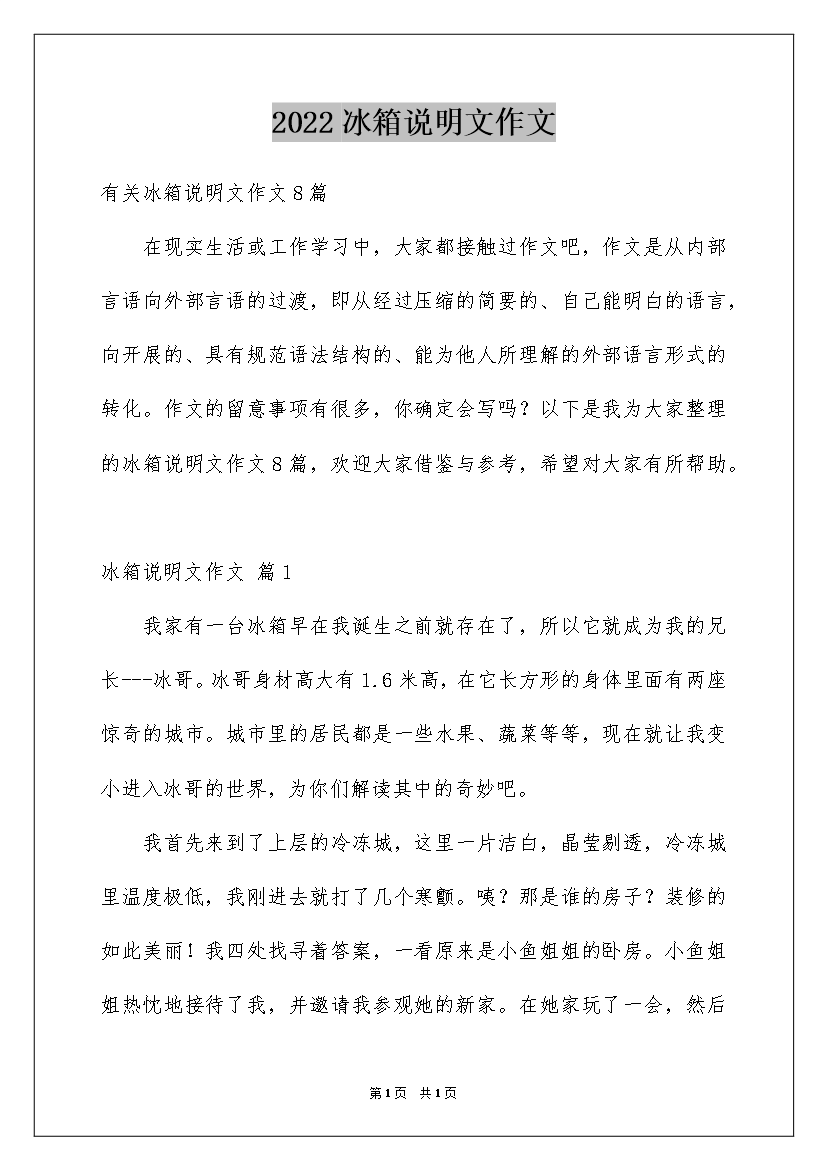2022冰箱说明文作文有关冰箱说明文作文8篇在现实生活或工作学习中,大家都接触过作文吧,作文是从内部言语向外部言语的过渡,即从经过压缩的简要的、自己能明白的语言,向开展的、具有规范语法结构的、能为他人所理解的外部语言形式的转化。作文的留意事项有很多,你确定会写吗?以下是我为大家整理的冰箱说明文作文8篇,欢迎大家借鉴与参考,希望对大家有所帮助。冰箱说明文作文篇1我家有一台冰箱早