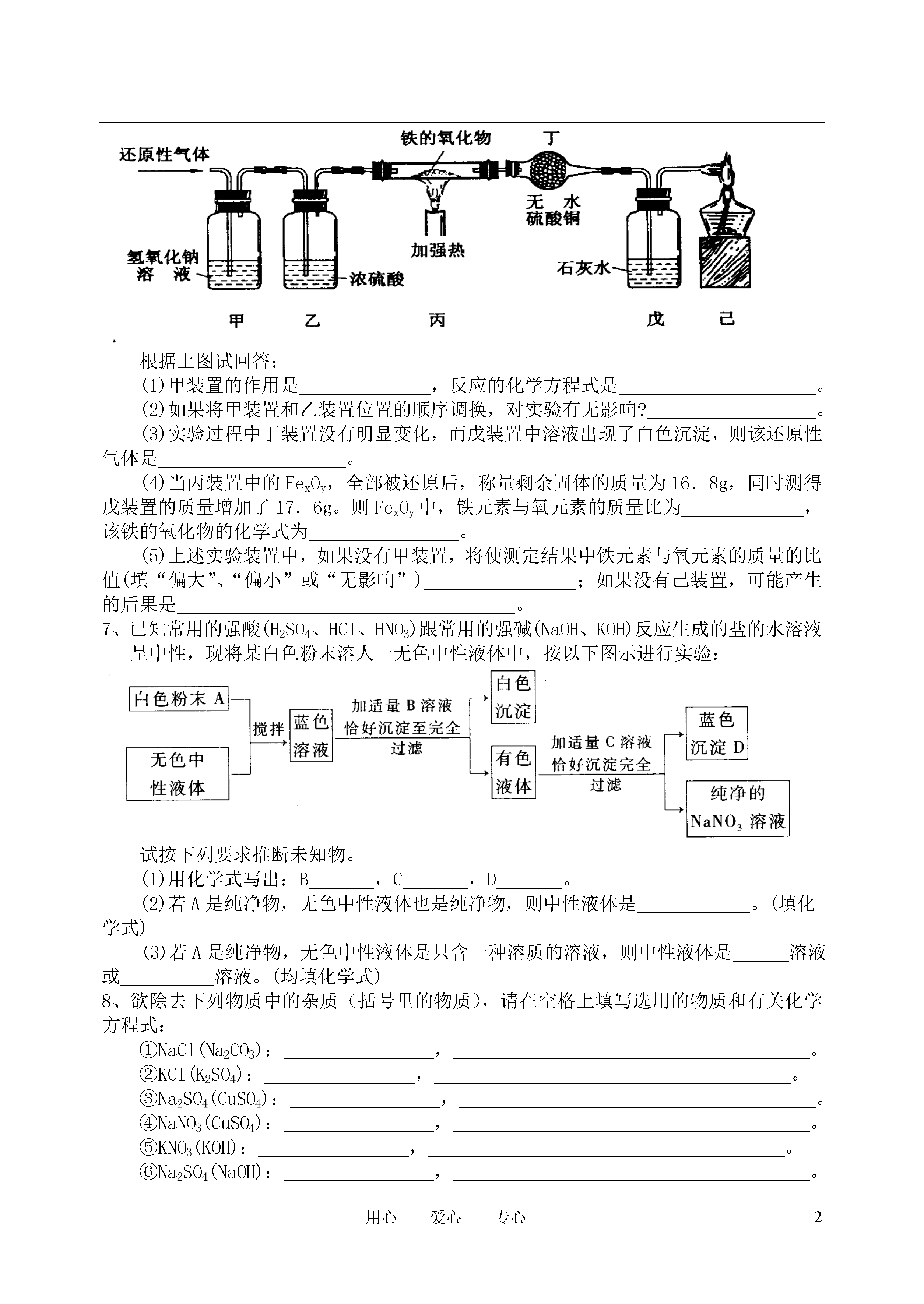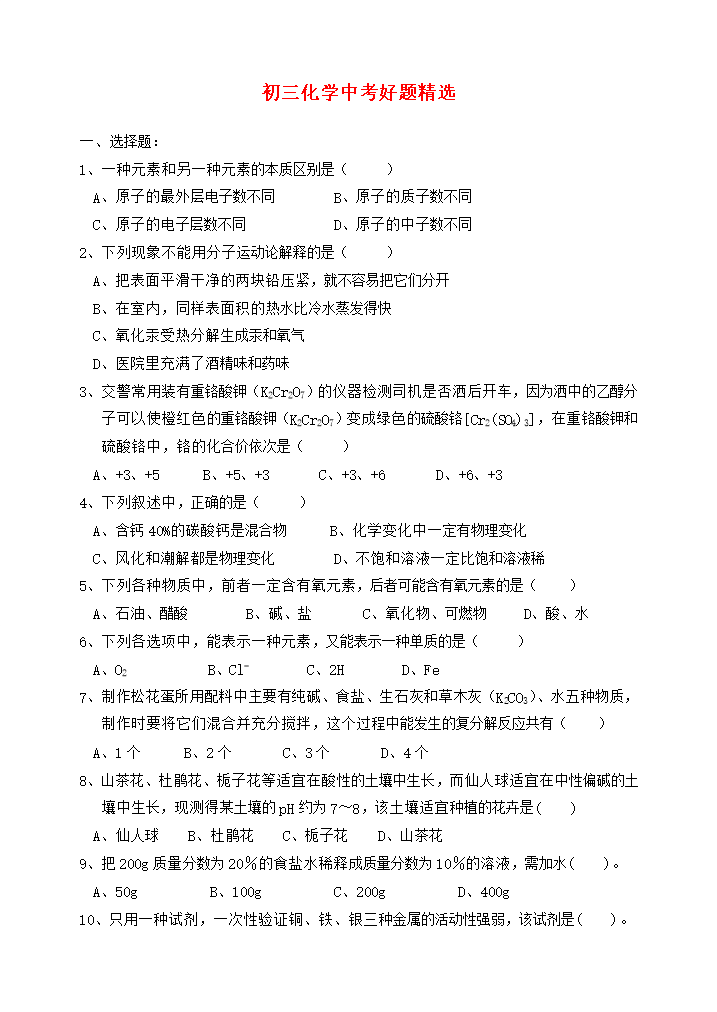 2用心爱心专心初三化学中考好题精选一、选择题:1、一种元素和另一种元素的本质区别是()A、原子的最外层电子数不同B、原子的质子数不同C、原子的电子层数不同D、原子的中子数不同2、下列现象不能用分子运动论解释的是()A、把表面平滑干净的两块铅压紧,就不容易把它们分开B、在室内,同样表面积的热水比冷水蒸发得快C、氧化汞受热分解生成汞和氧气D、医院里充满了酒精味和药味3、交警常用装有重铬酸钾(K2Cr2O7)的仪器检测司机是否洒后开车,因为洒中的乙醇分子可以使橙红色的重铬酸