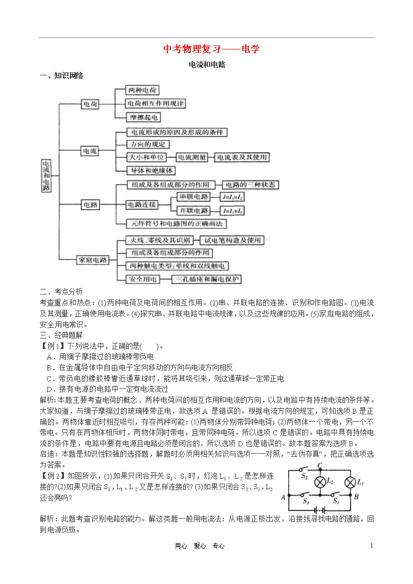 11用心爱心专心中考物理复习——电学电流和电路一、知识网络二、考点分析考查重点和热点:(1)两种电荷及电荷间的相互作用。(2)串、并联电路的连接、识别和作电路图。(3)电流及其测量,正确使用电流表。(4)探究串、并联电路中电流规律,以及这些规律的应用。(5)家庭电路的组成,安全用电常识。三、经典题解【例1】下列说法中,正确的是()。A.用绸子摩擦过的玻璃棒带负电B.在金属导体中自由电子定向移动的方向与电流方向相反C.带负电的橡胶棒靠近通草球时,能将其吸引来,则这通草球一定带正电D.接有电源的电路中一定有电