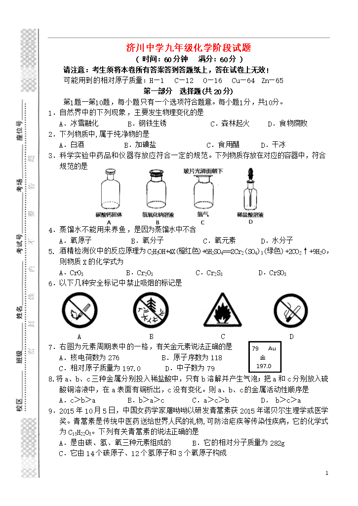1济川中学九年级化学阶段试题(时间:60分钟满分:60分)请注意:考生须将本卷所有答案答到答题纸上,答在试卷上无效!可能用到的相对原子质量:H—1C—12O—16Cu—64Zn—65第一部分选择题(共20分)第1题一第10题,每小题只有一个选项符合题意。每小题1分,共10分。1.自然界中的下列现象,主要发生物理变化的是A.冰雪融化B.钢铁生锈C.森林起火D.食物腐败2.下列物质中,属于纯净物的是A.白酒B.加碘盐C.食用醋D.干冰3.科学实验中药品和仪器存放应符合一定的