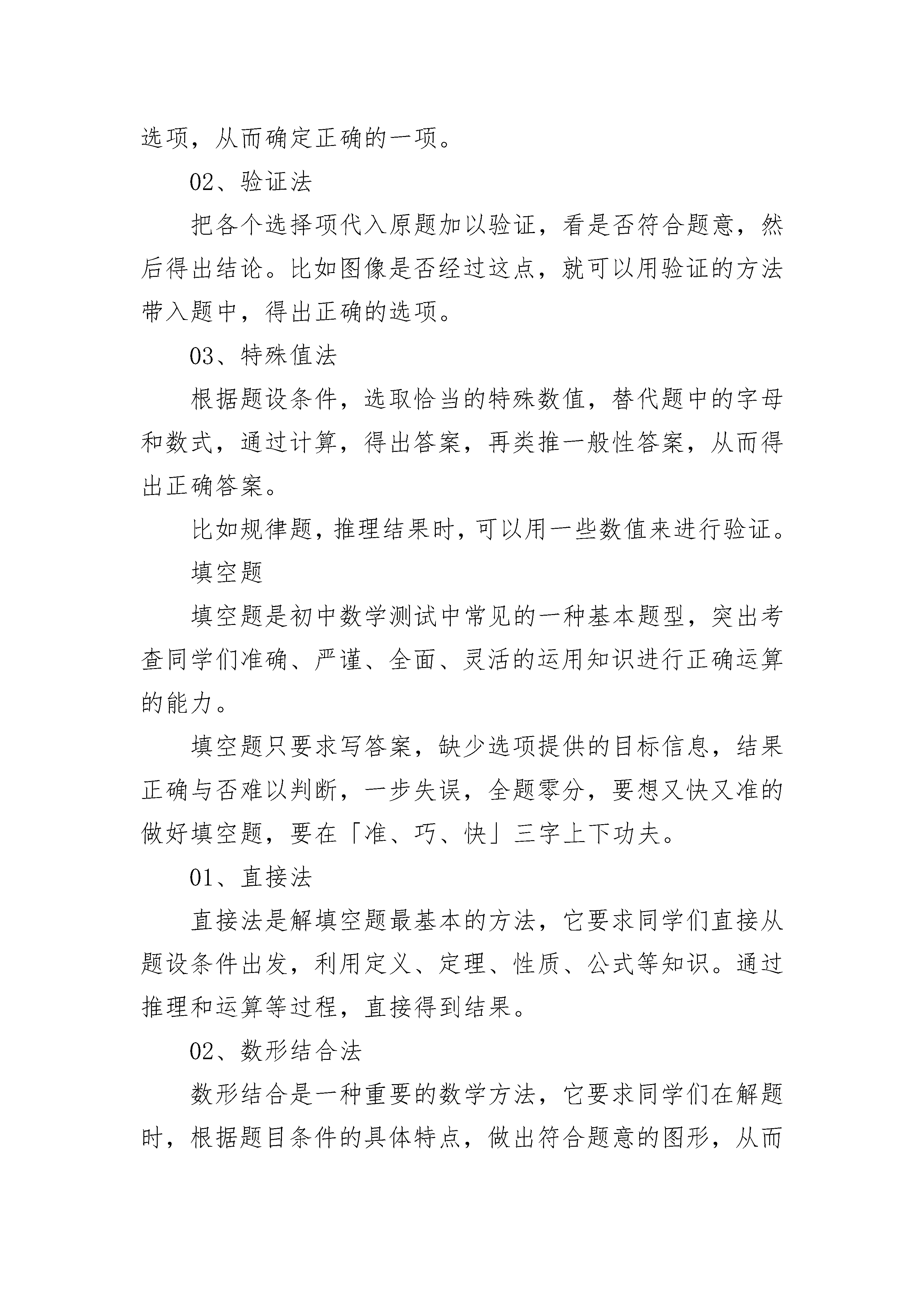 初中数学的各题型解题方法一、选择题的解法1、直接法:根据选择题的题设条件,通过计算、推理或判断,,最后得到题目的所求。2、特殊值法:(特殊值淘汰法)有些选择题所涉及的数学命题与字母的取值范围有关;在解这类选择题时,可以考虑从取值范围内选取某几个特殊值,代入原命题进行验证,然后淘汰错误的,保留正确的。3、淘汰法:把题目所给的四个结论逐一代回原题的题干中进行验证,把错误的淘汰掉,直至找到正确的答案。4、逐步淘汰法:如果我们在计算或推导的过程中不是一步到位,而是逐步进行,既采用走一走、瞧一瞧的策略;每走一步都与