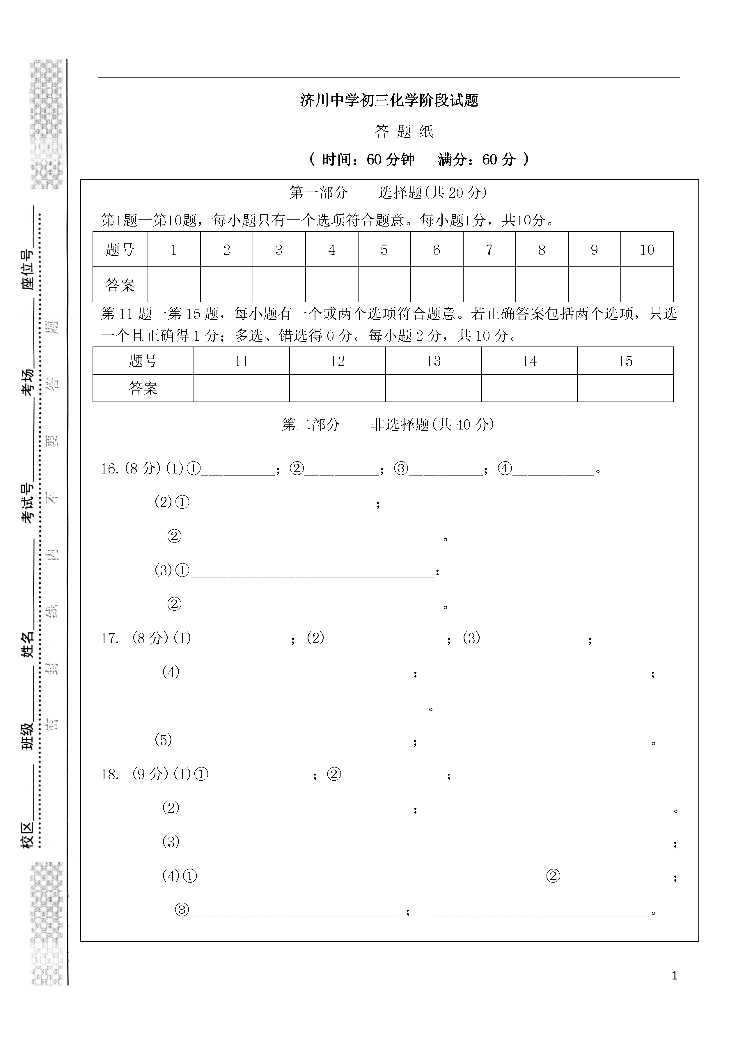 泰兴市济川实验初中初三化学阶段试题(考试时间:90分钟满分100分)可能用到的相对原子质量:H:1C:12N:14O:16S:32Fe:56请注意:1、本试卷分第一部分选择题和第二部分非选择题。2、考生答题前,必须将自己的姓名、考试证号、座位号用黑色或蓝色钢笔或圆珠笔填写在试卷和答题卡的相应位置,再用2B铅笔将考试证号、科目填涂在答题卡上相应的小框内。第一部分选择题(共40分)注意:考生必须将所选答案的字母标号用2B铅笔填涂在答题卡上相应的题号内,答在试卷上无效。一、(本题包括15小题