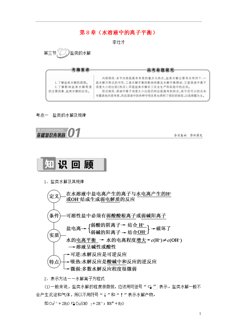 12第8章(水溶液中的离子平衡)李仕才eq\o(\s\up17(第三节)\s\do15())eq\o(\s\up17(盐类的水解)\s\do15())考点一盐类的水解及规律1.盐类水解及其规律2.表示方法——水解离子方程式(1)一般来说盐类水解的程度很微弱应该用可逆号“”表示。盐类水解一般不会产生沉淀和气体所以不用符号“↓”和“↑”表示水解产物。如Cu2++2H2OCu(OH)2+2H+;NHeq\o\al(+4)+H2ONH3·H2O+H+。若水解程度较大书写时