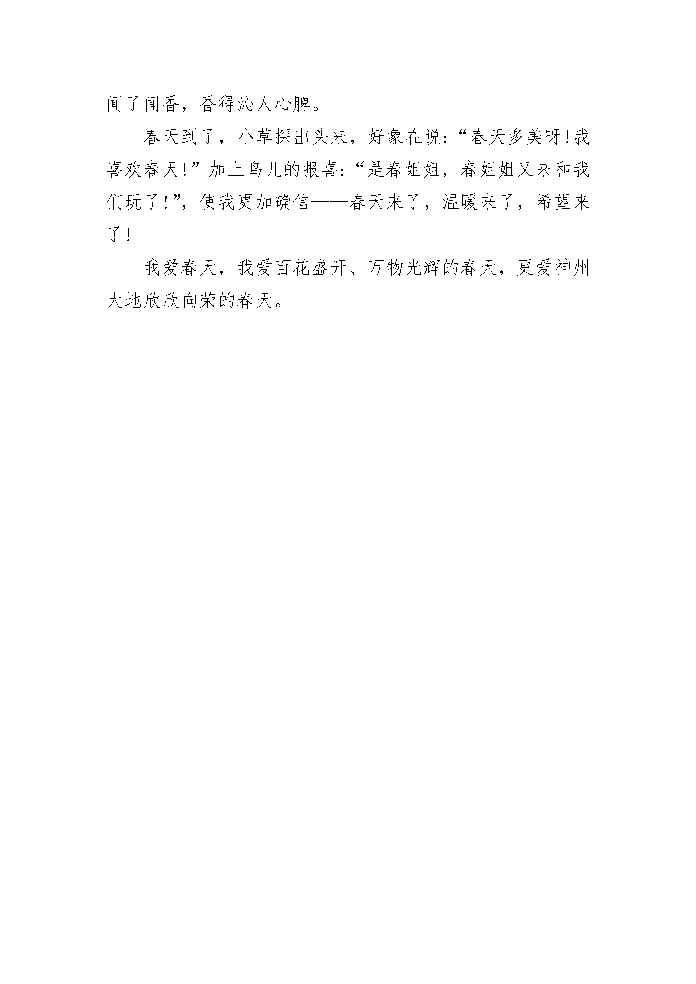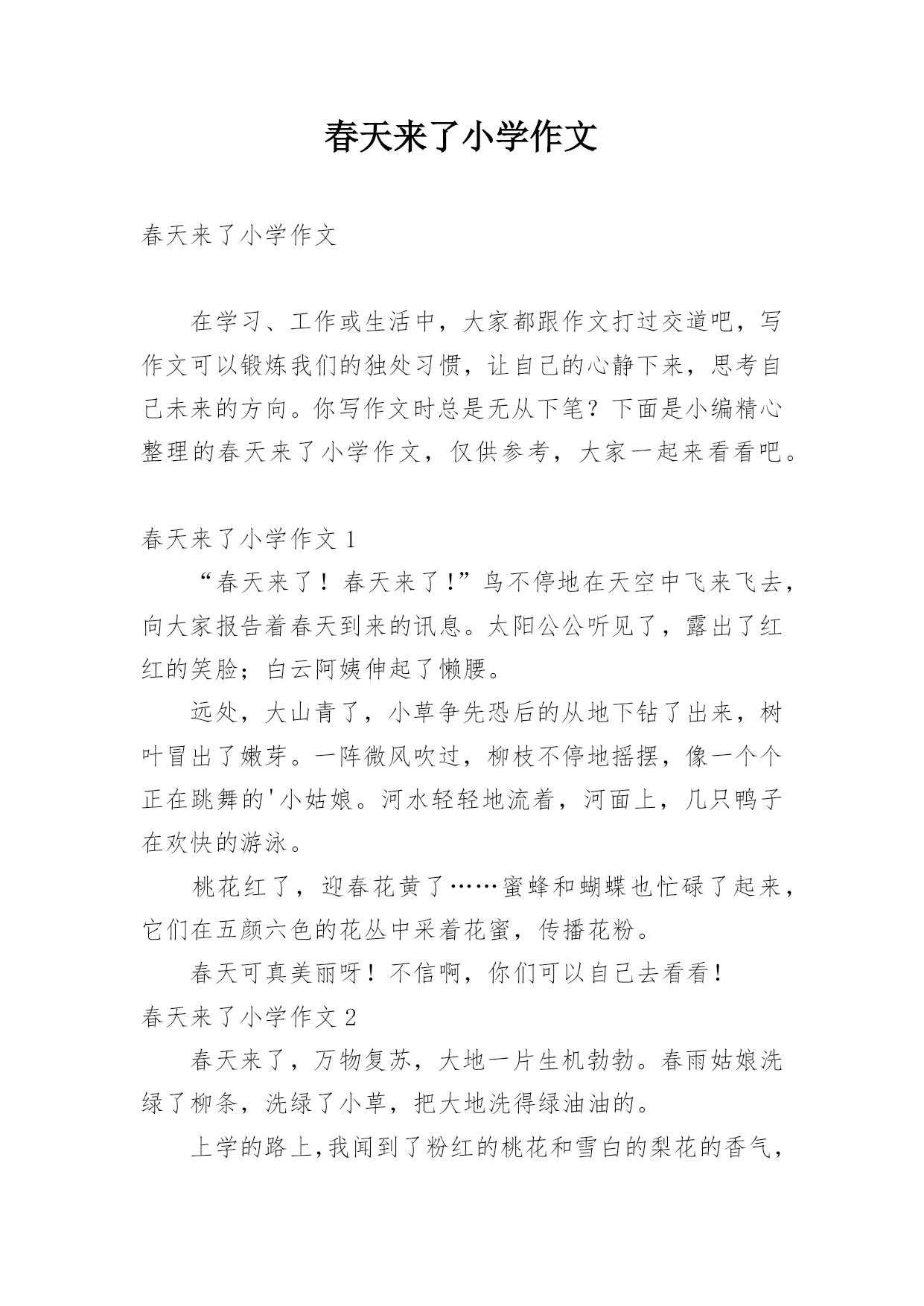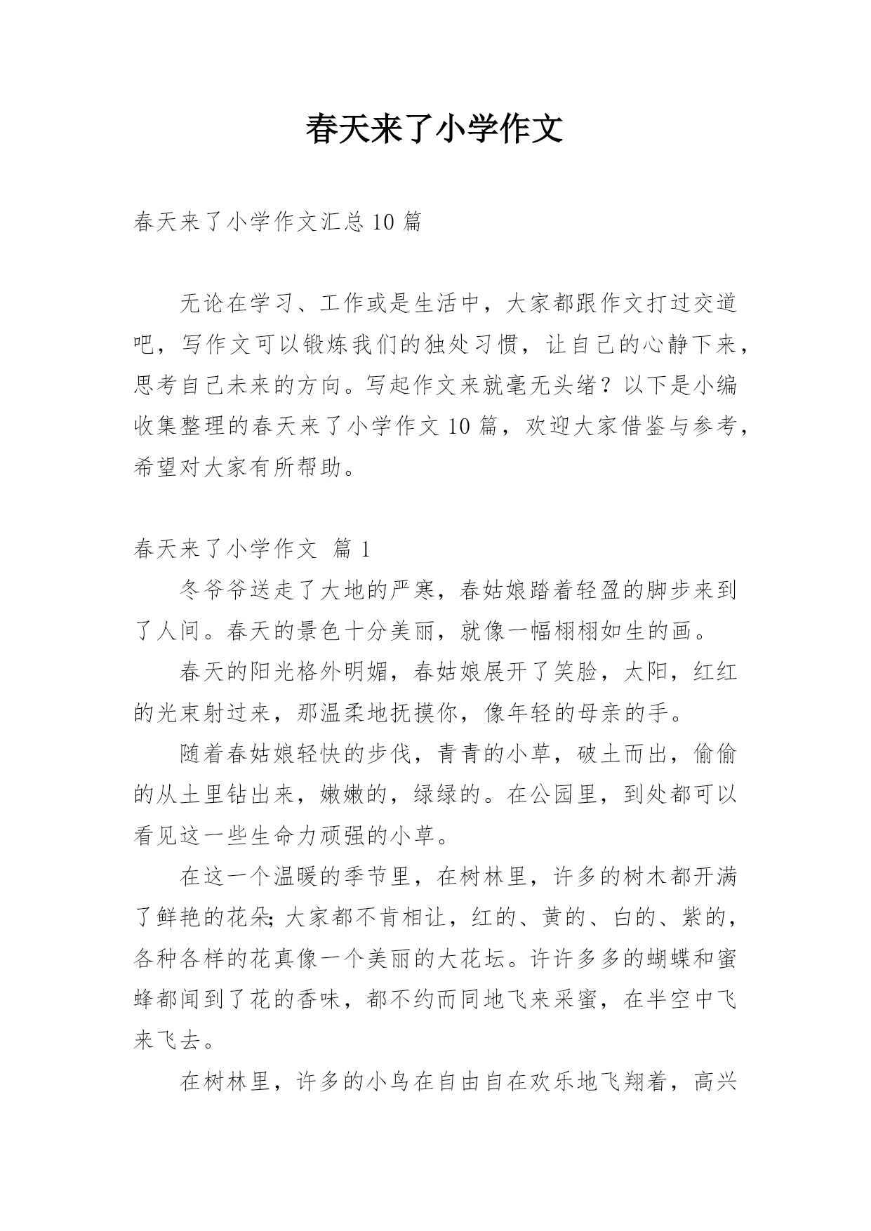 春天来了小学作文春天来了小学作文汇总10篇无论在学习、工作或是生活中,大家都跟作文打过交道吧,写作文可以锻炼我们的独处习惯,让自己的心静下来,思考自己未来的方向。写起作文来就毫无头绪?以下是小编收集整理的春天来了小学作文10篇,欢迎大家借鉴与参考,希望对大家有所帮助。春天来了小学作文篇1冬爷爷送走了大地的严寒,春姑娘踏着轻盈的脚步来到了人间。春天的景色十分美丽,就像一幅栩栩如生的画。春天的阳光格外明媚,春姑娘展开了笑脸,太阳,红红的光束射过来,那温柔地抚摸你,像年轻的母亲的手。随着春姑娘轻快的步伐,青青的